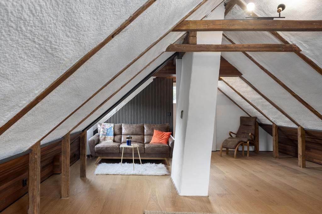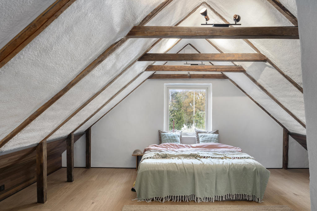 Sovrummet på entréplan är en privata oas för vila tack vare den sammetslena microcementen på golvet tillsammans med golvvärmen. Belysningen är mjuk och justerbar, skapad för att ge ett omedelbart lugn. En trappa upp väntar ytterligare ett ljust och luftigt rum öppet till nock, även detta med komfortabel golvvärme och vacker ekparkett. Är detta tonåringens egen domän, ett lyxigt gästrum, eller kanske ett tyst hemmakontor med utsikt över tomten?