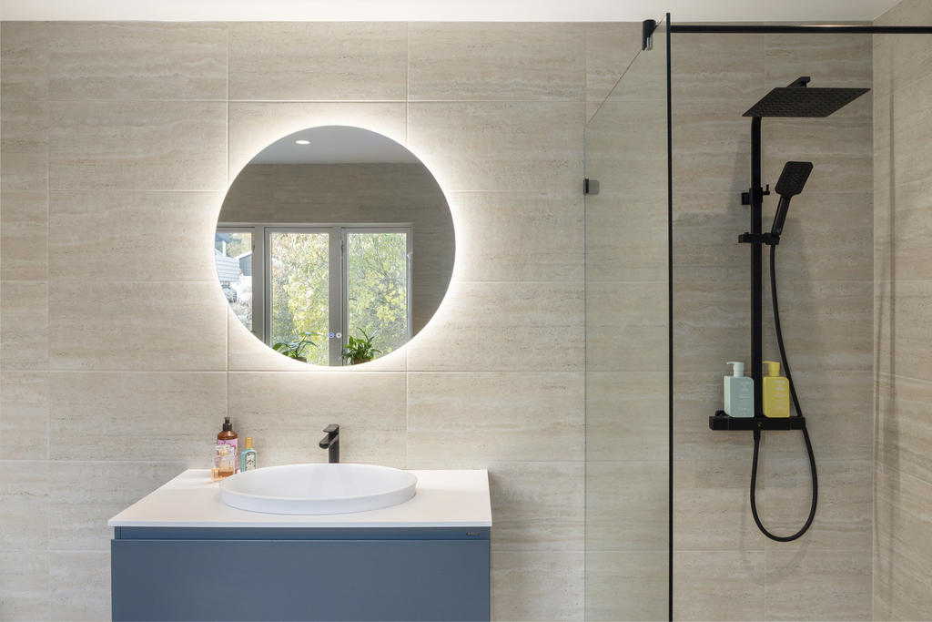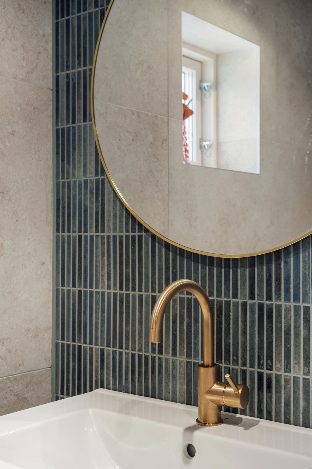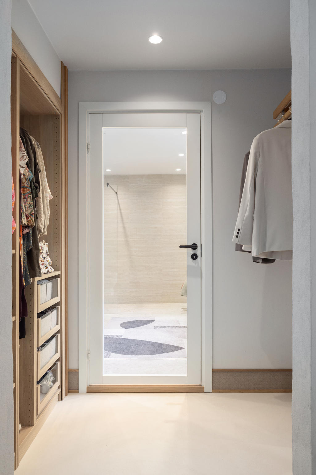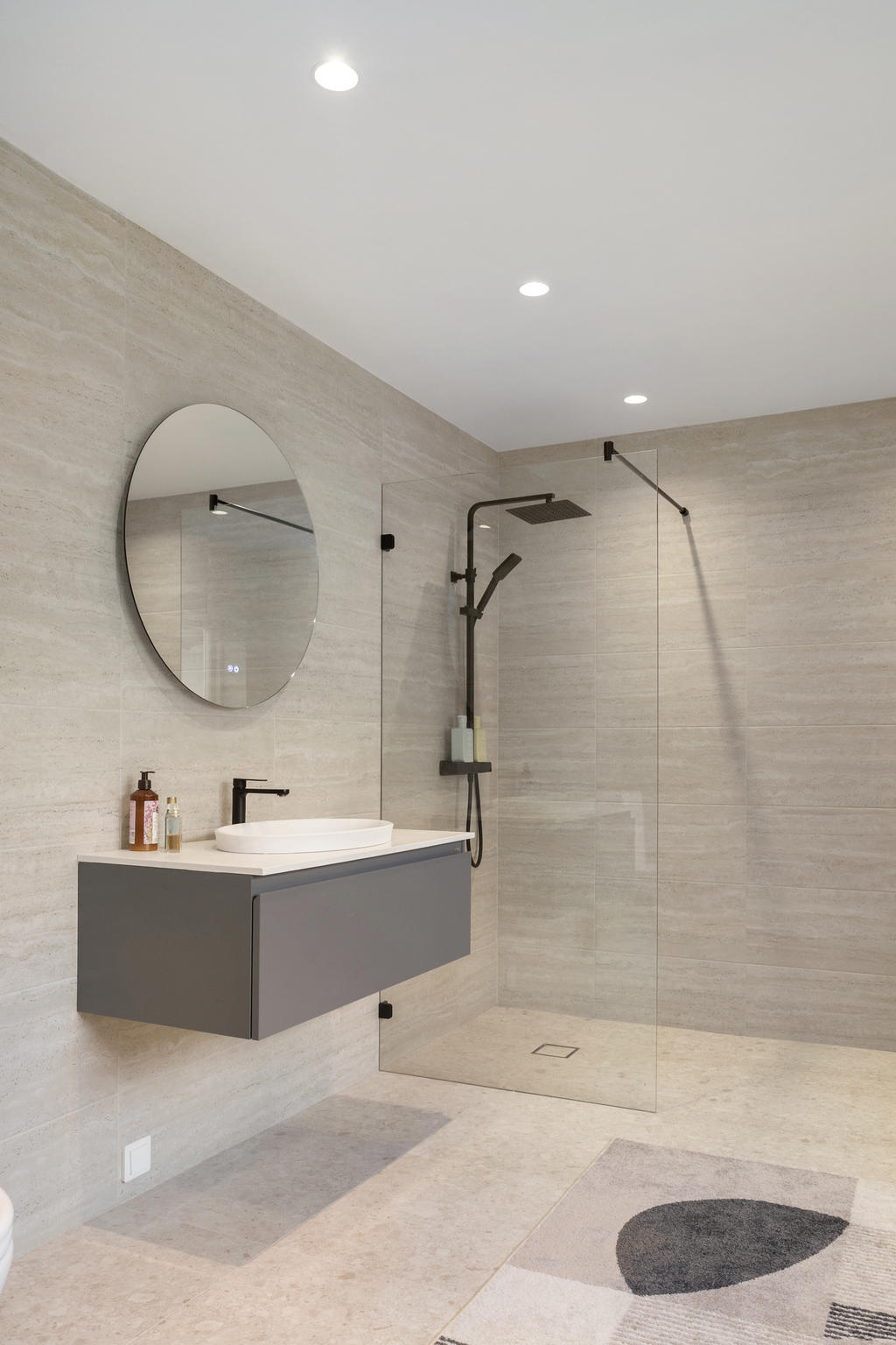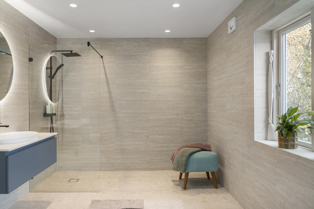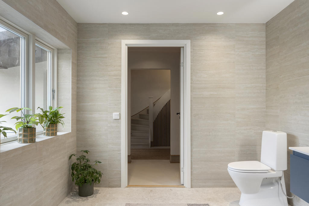 Badrummet på entréplan förvandlar vardagsmorgnar till en spaupplevelse. Helkaklat i tidlösa, ljusa toner ger det en påtaglig hotellkänsla. Utrymmet är så generöst tilltaget att du nästan kan ta ett danssteg in bakom den klara glasväggen i duschen - en härlig påminnelse om vardagslyx när den är som bäst.
