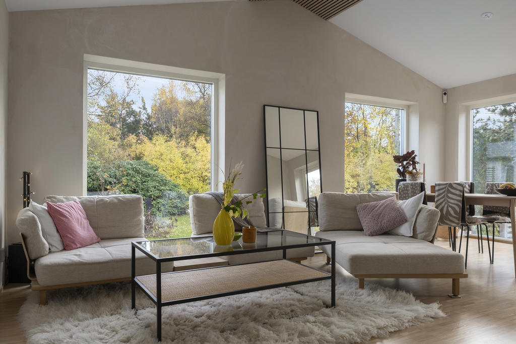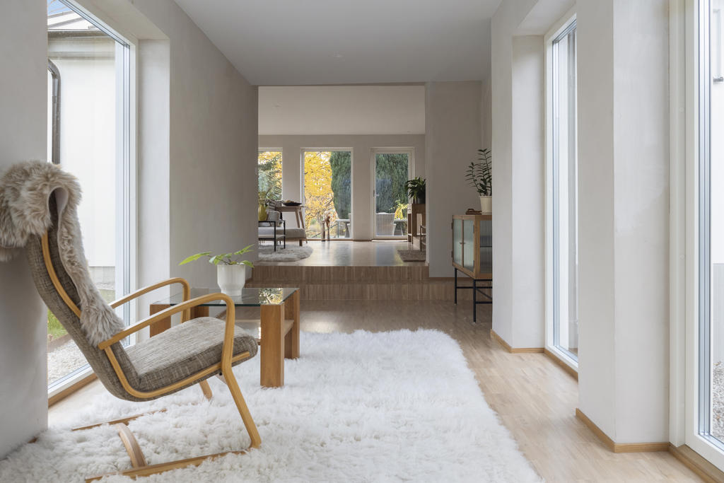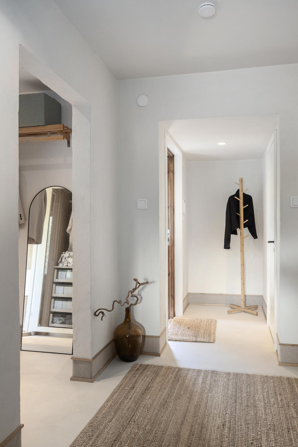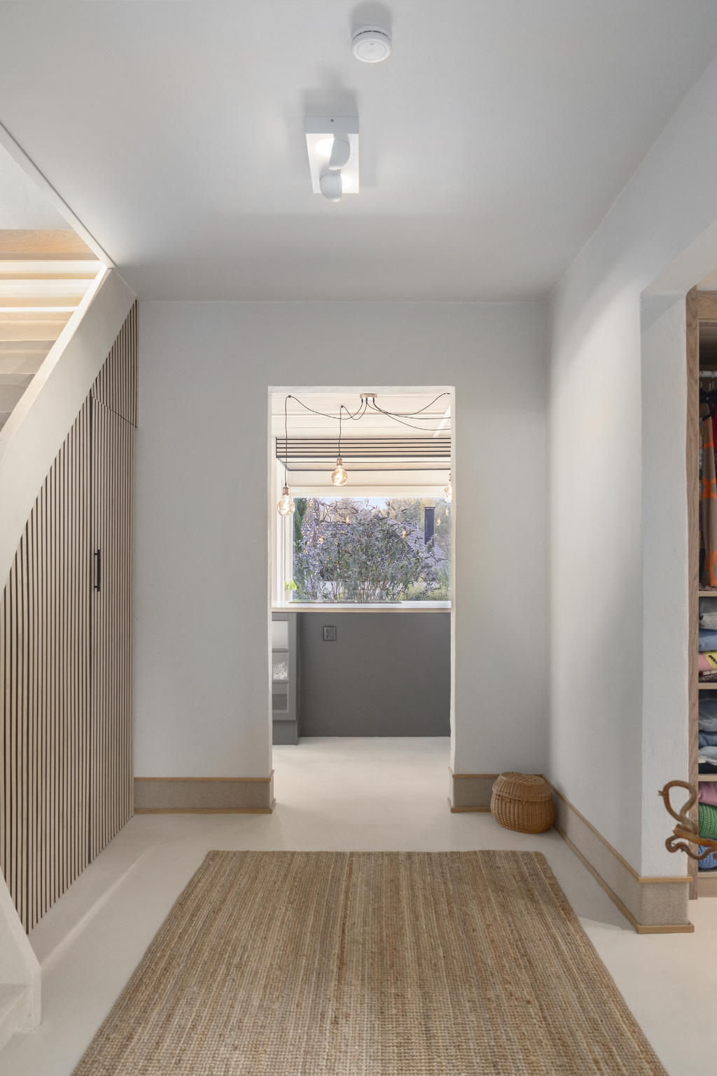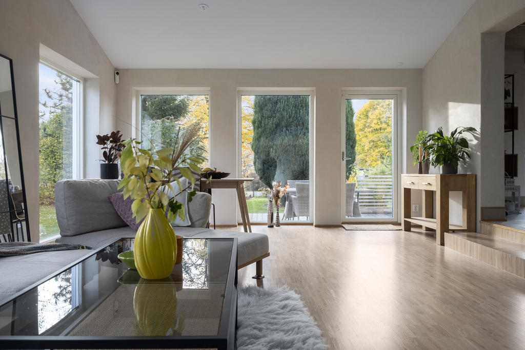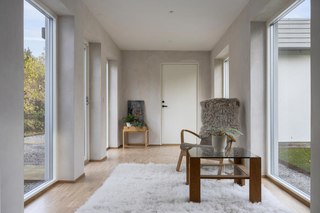 Allt hänger ihop - släta ytor i ljusa toner, parkettgolvet i vardagsrummet, infällda spotlights och golvvärme i hela huset skapar en harmonisk helhet. Det är genomtänkt, men ändå avslappnat. Ett hem med själ, helt enkelt.