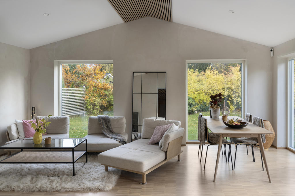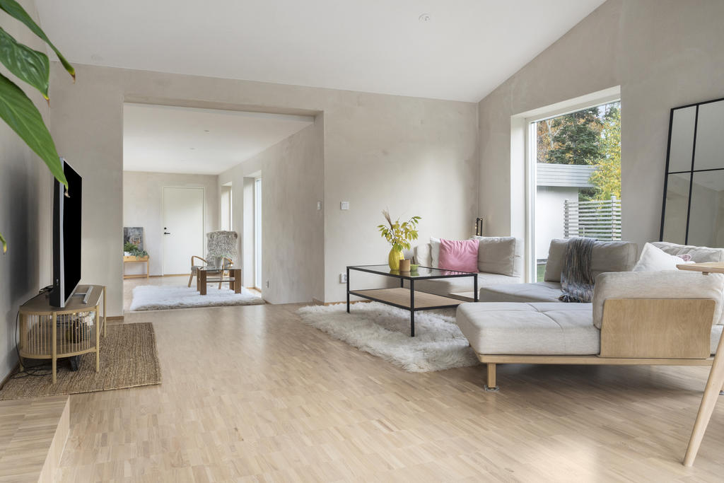 Redan vid första steget in omfamnas du av en perfekt balans mellan sober elegans och omedelbar värme. De generösa fönsterpartierna är skapta för att fånga dagens alla timmar, ljuset flödar fritt och skapar en luftig atmosfär. Entréplanet är husets hjärta. Den öppna, sociala planlösningen bjuder in till gemenskap, där kök, matplats och vardagsrum smälter samman till en självklar helhet. Det här är en plats designad för livet: för stökiga familjefrukostar, långa middagar som övergår i natt och spontana kvällar där vänner och familj samlas runt köksön.