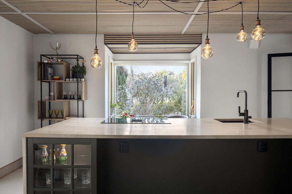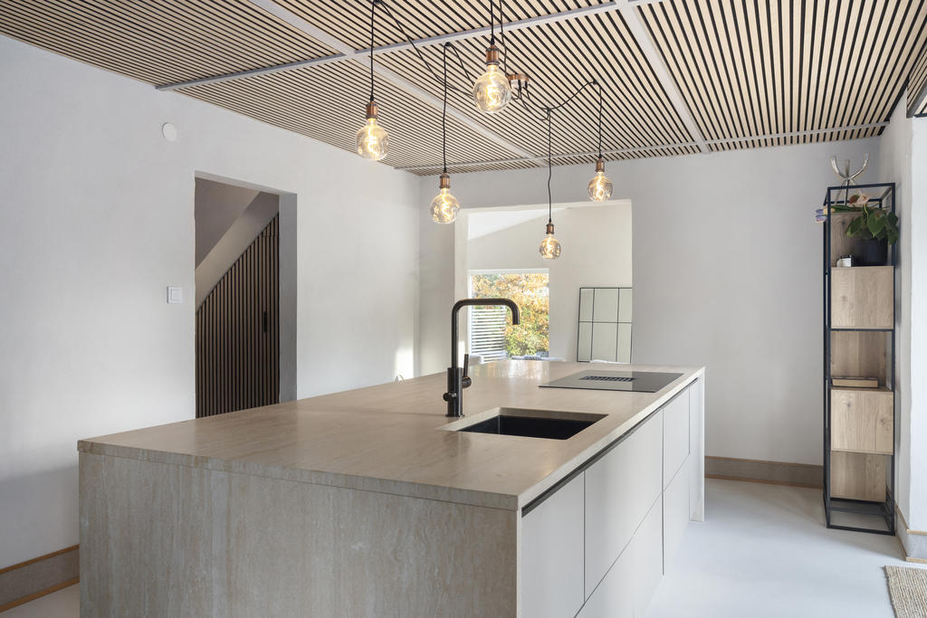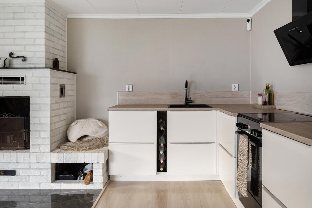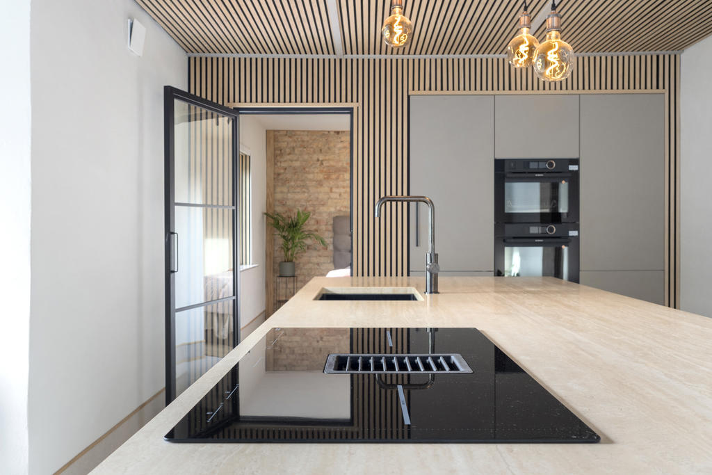 Köket från HTH är en dröm för esteten men framförallt kocken. Bakom de stilrena linjerna döljer sig smart funktion med dubbla inbyggda ugnar och en generös induktionshäll. Blicken dras omedelbart till den vackra bänkskivan i travertin. Vardagsrummet intill fullkomligt badar i ljus tack vare fönster i flera väderstreck. Det vackra parkettgolvet värmer under fötterna och de infällda spotlightsen skapar en mjuk och inbjudande stämning när mörkret faller. Det är ett rum som rymmer både stora fester och tysta lässtunder i fåtöljen.