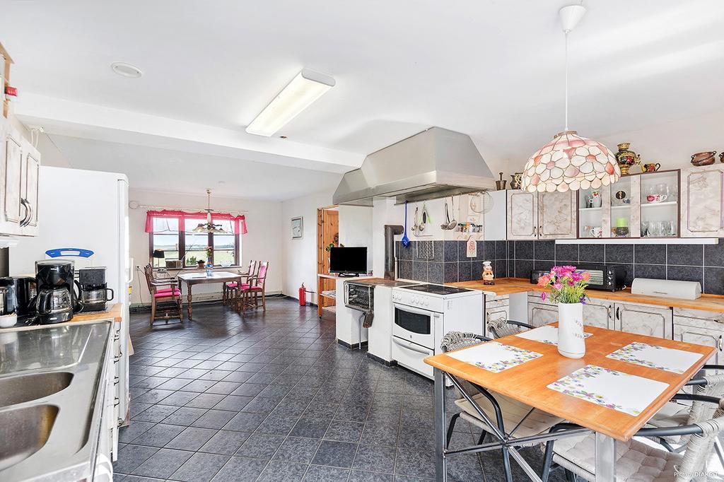 Kök med spis, ugn, vedspis, kyl/frys, diskmaskin, klinker samt stora ytor att umgås (i denna del vattenburna element). Finns en mindre matkällare med ingång/nedgång från lilla matplatsen.