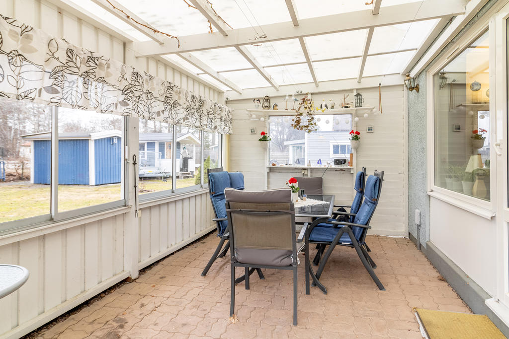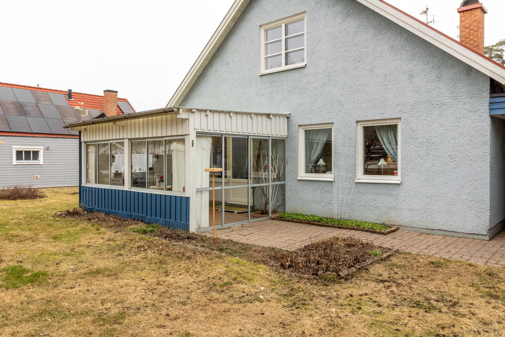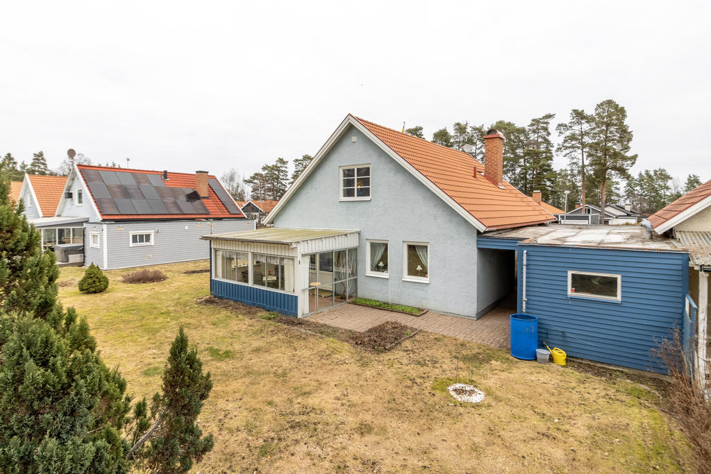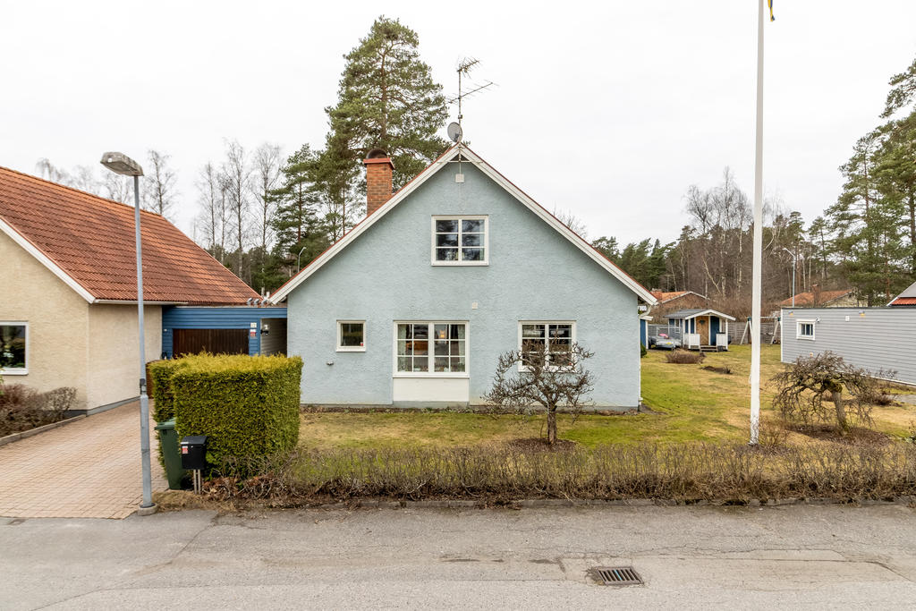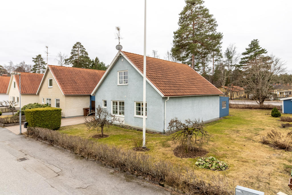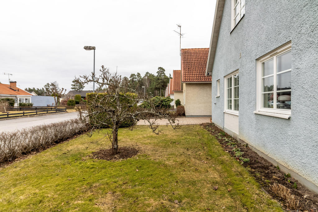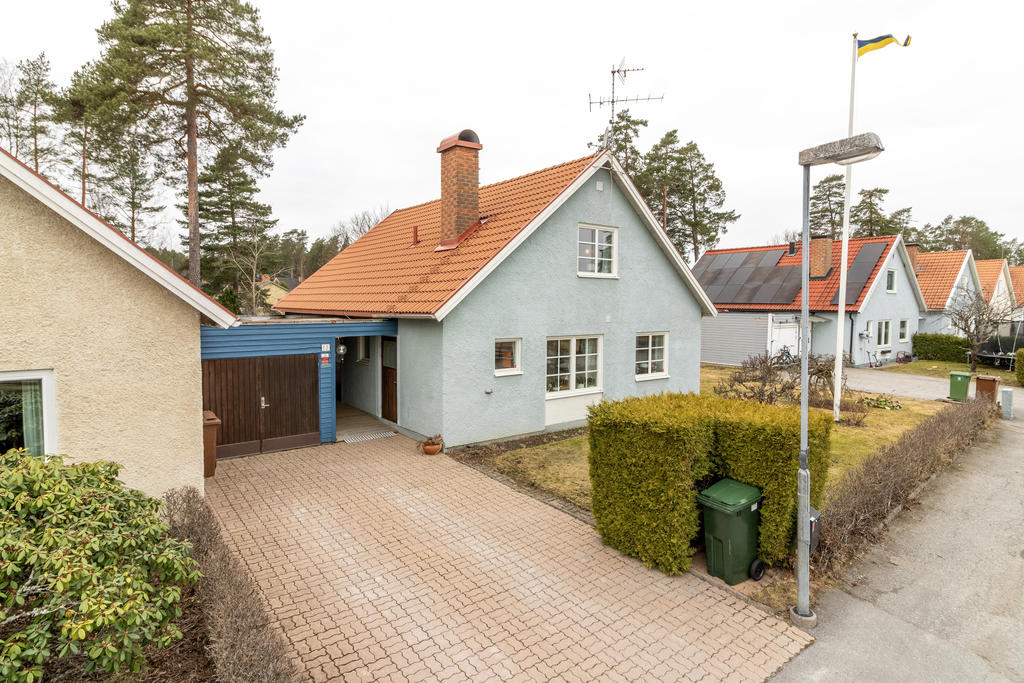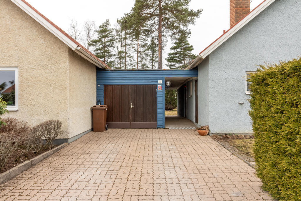 Från framsidans lugna gatan nås en prydligt stenlagd uppfart med utrymme för bilen framför garaget. I garaget finns gott om plats för förvaring och hobbys, men även en bastu som använts flitigt på lediga helger. Den plana trädgården är uppväxt med prydliga buskar, höga insynsskyddande tujor och formklippta träd. Här finns även ett trädgårdsland, vinbär, rabarber och på sommaren dignar uterummets tak av vindruvor. I trädgården finns även ett förråd för trädgårdsredskap. Tomterna tillhör en av de större och till skillnad från de flesta grannarnas kedjehus ligger detta hus fritt med trädgård runt hela sidan av huset. I den gröna trädgårdens baksida har man sol från lunch fram till eftermiddag- och kväll och i uterummet njuter man av vårvinterns allra första fika i solen och det är här tomaterna växter så det knakar på sommaren. Via den takade passagen mellan huset och garaget nås entréhallen som har klädhängare och badrum med dusch direkt innan för dörren. Rakt fram öppnar planlösningen upp mot ett rymligt vardagsrum med öppen planlösning till matrum. Vardagsrummet har stora fönster mot trädgårdens baksida och utgång till det inglasade uterummet. Till höger om hallen nås köket som har ekluckor med profiler och matplats för 4-6 personer. Från matplatsen invid det stora fönstret lyser morgonsolen in till frukosten och man har perfekt uppsikt över barnens lekar på gården utanför. Från köket nås tvättstuga med groventré. Våningsplanet disponerar även ett generöst sovrum som lätt går att dela av till 2 sovrum, så som planlösningen varit från början. Även matrummet har tidigare varit ett sovrum avdelat mot vardagsrummet. Trätrappan i hallen leder upp till övervåningens mer privata utrymmen. Här ryms 2 sovrum, wc och gott om förvaringsutrymmen i garderober och kattvindar.