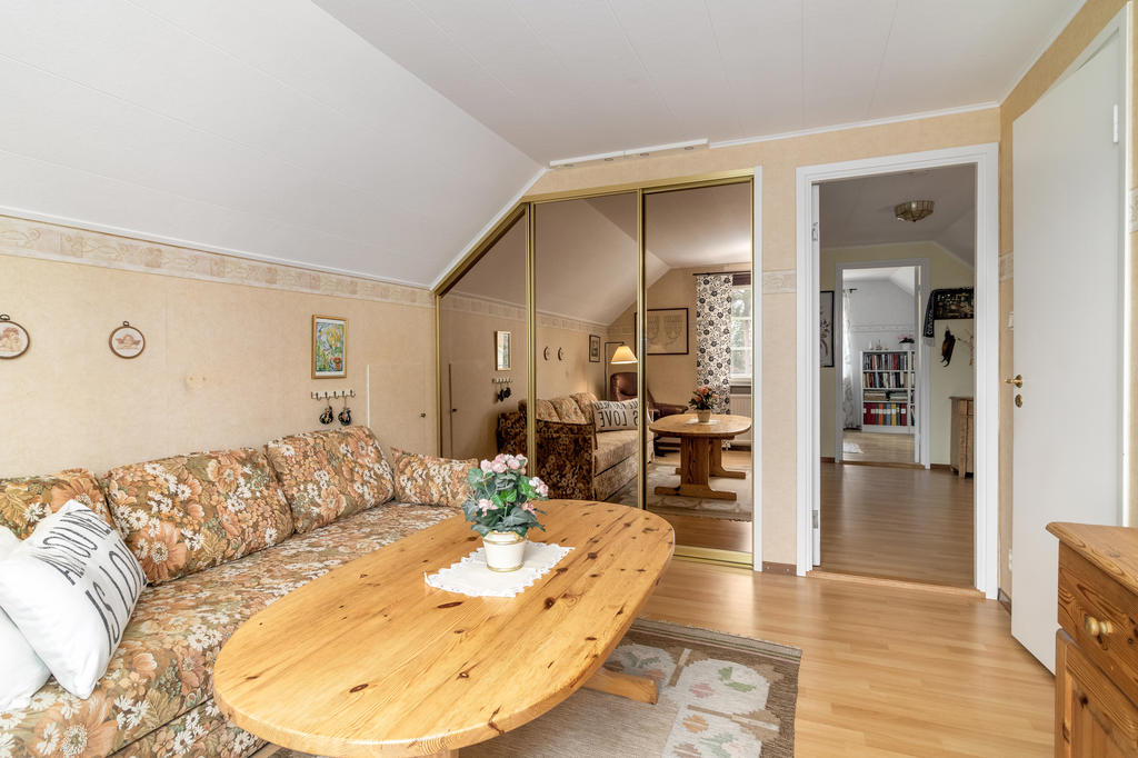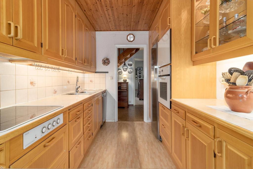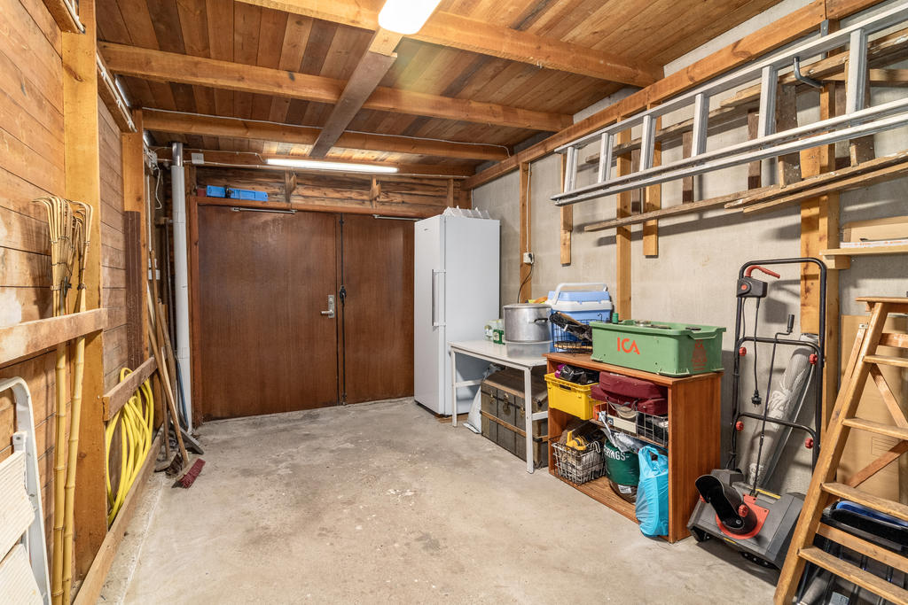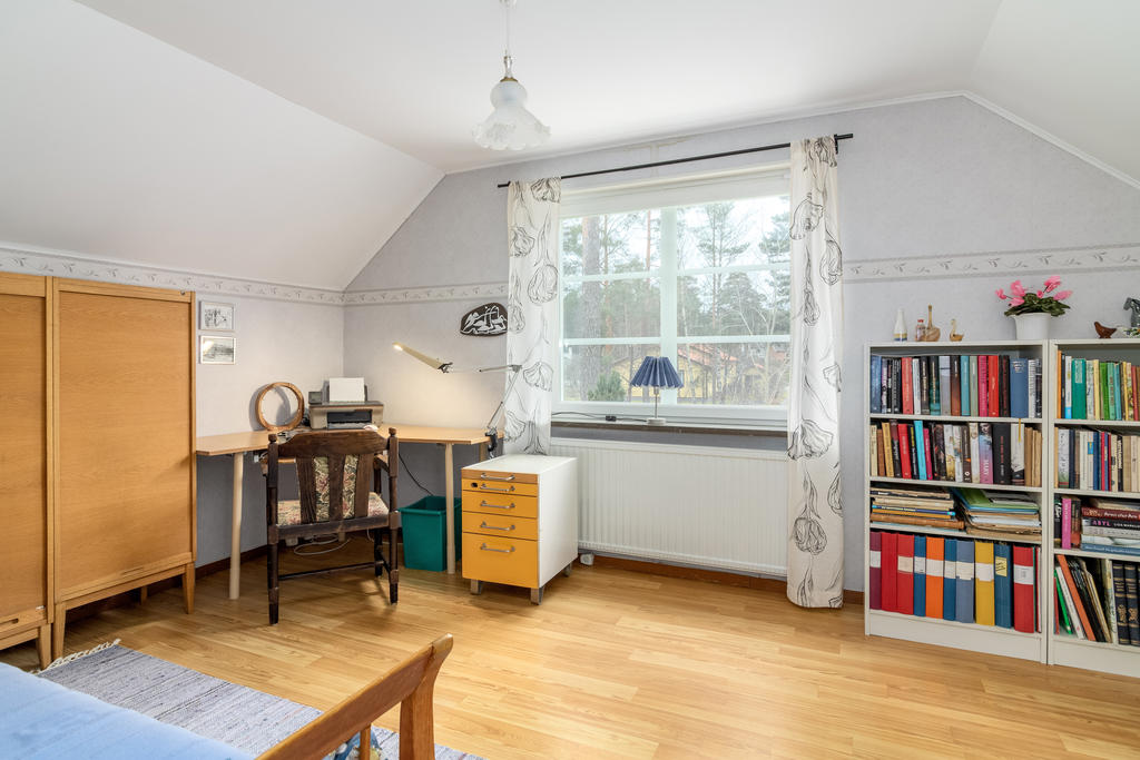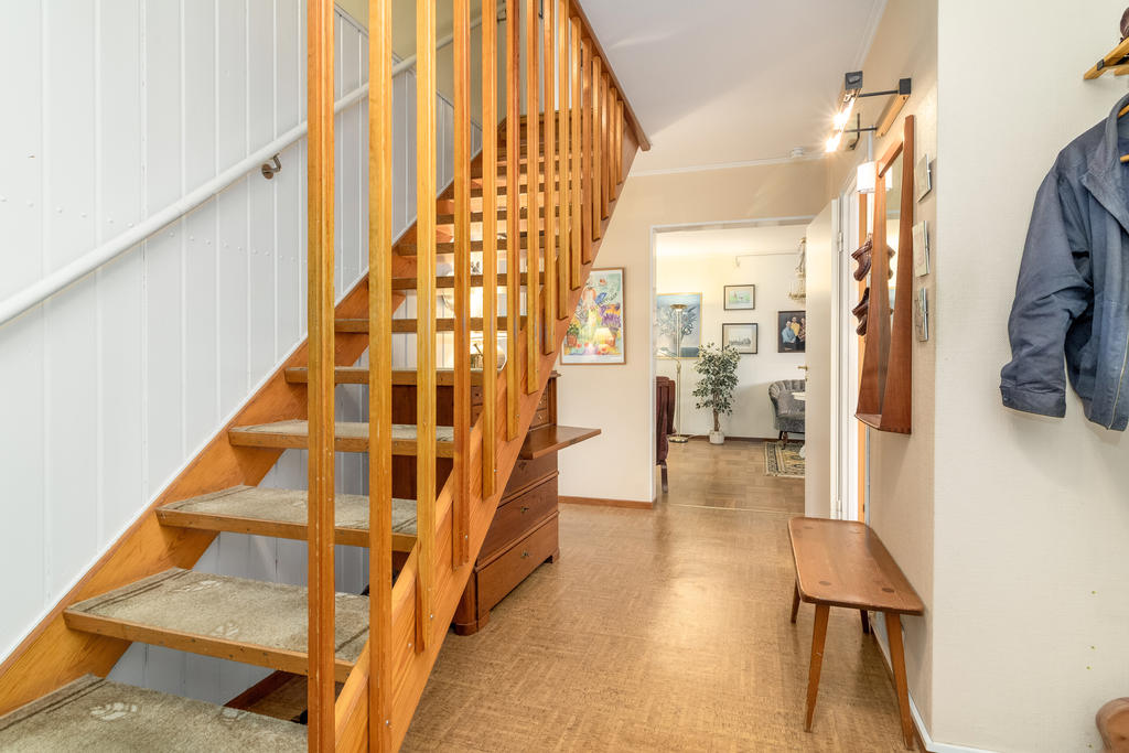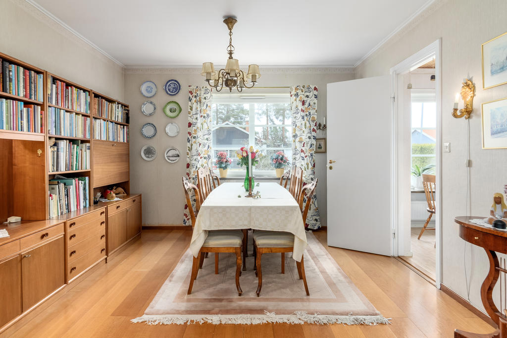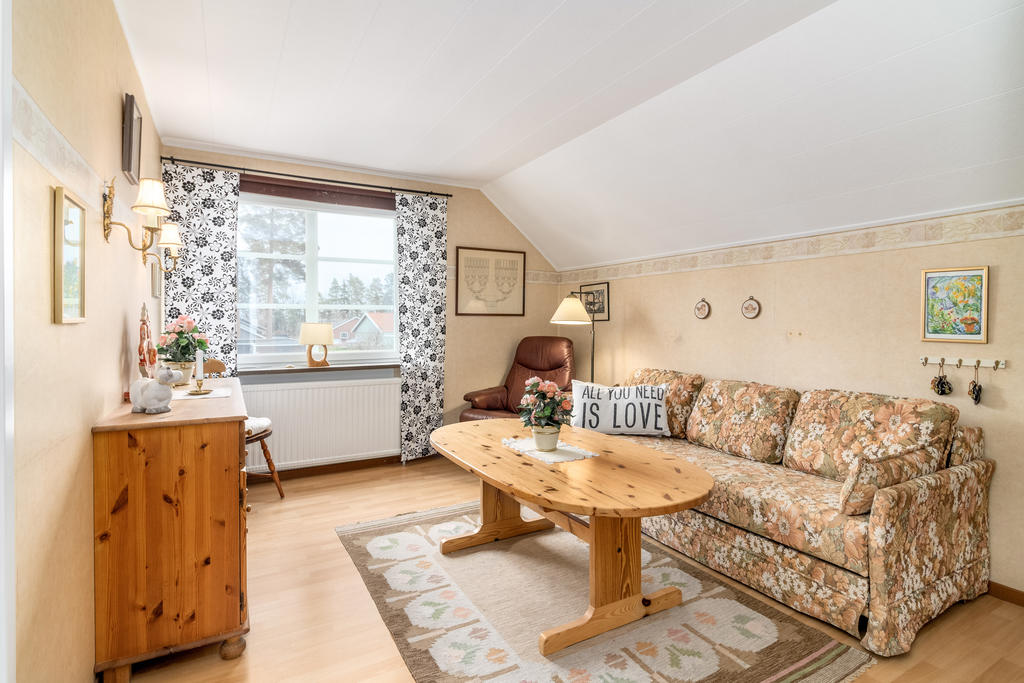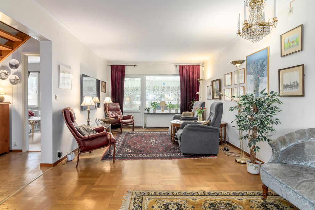 Från framsidans lugna gatan nås en prydligt stenlagd uppfart med utrymme för bilen framför garaget. I garaget finns gott om plats för förvaring och hobbys, men även en bastu som använts flitigt på lediga helger. Den plana trädgården är uppväxt med prydliga buskar, höga insynsskyddande tujor och formklippta träd. Här finns även ett trädgårdsland, vinbär, rabarber och på sommaren dignar uterummets tak av vindruvor. I trädgården finns även ett förråd för trädgårdsredskap. Tomterna tillhör en av de större och till skillnad från de flesta grannarnas kedjehus ligger detta hus fritt med trädgård runt hela sidan av huset. I den gröna trädgårdens baksida har man sol från lunch fram till eftermiddag- och kväll och i uterummet njuter man av vårvinterns allra första fika i solen och det är här tomaterna växter så det knakar på sommaren. Via den takade passagen mellan huset och garaget nås entréhallen som har klädhängare och badrum med dusch direkt innan för dörren. Rakt fram öppnar planlösningen upp mot ett rymligt vardagsrum med öppen planlösning till matrum. Vardagsrummet har stora fönster mot trädgårdens baksida och utgång till det inglasade uterummet. Till höger om hallen nås köket som har ekluckor med profiler och matplats för 4-6 personer. Från matplatsen invid det stora fönstret lyser morgonsolen in till frukosten och man har perfekt uppsikt över barnens lekar på gården utanför. Från köket nås tvättstuga med groventré. Våningsplanet disponerar även ett generöst sovrum som lätt går att dela av till 2 sovrum, så som planlösningen varit från början. Även matrummet har tidigare varit ett sovrum avdelat mot vardagsrummet. Trätrappan i hallen leder upp till övervåningens mer privata utrymmen. Här ryms 2 sovrum, wc och gott om förvaringsutrymmen i garderober och kattvindar.
