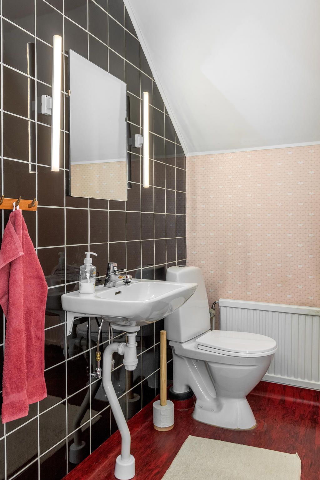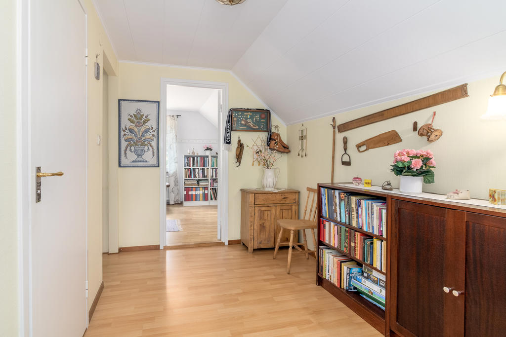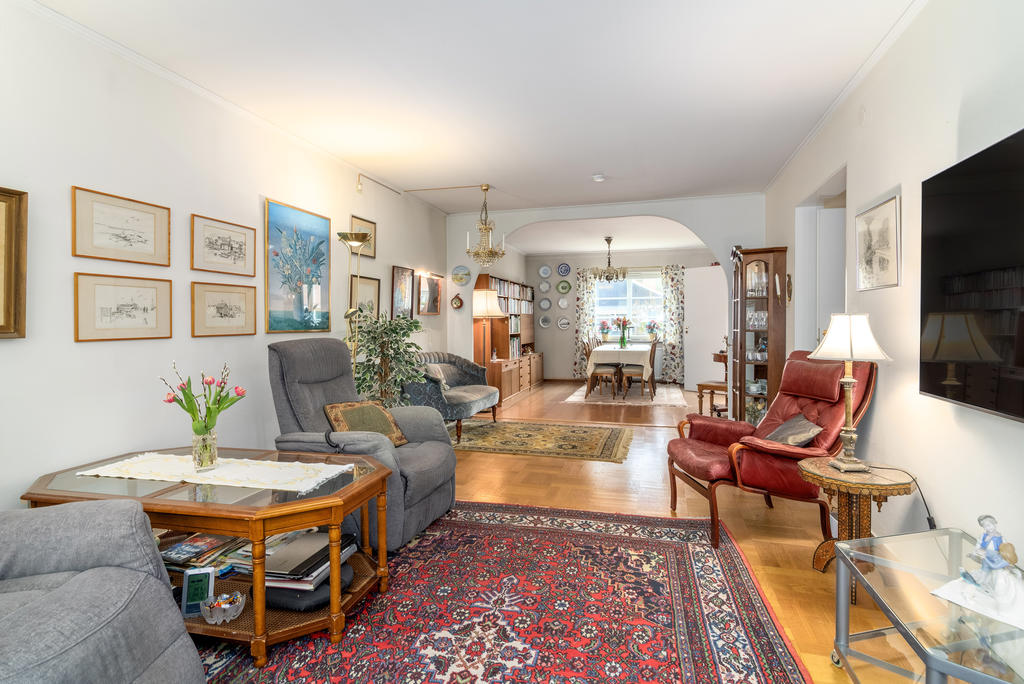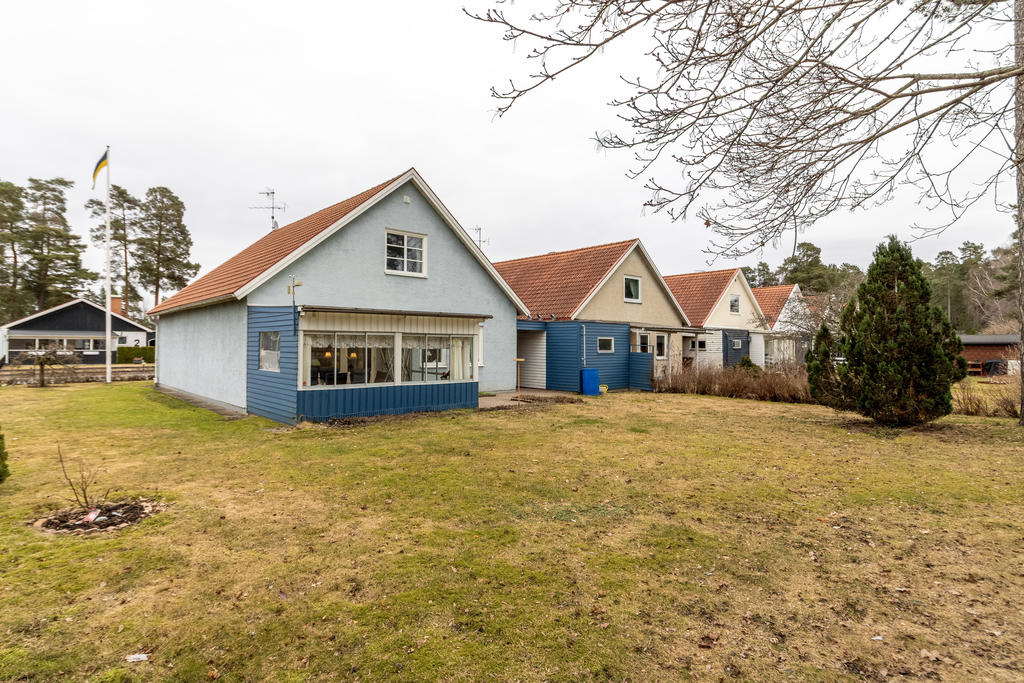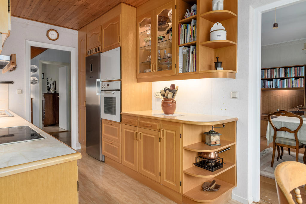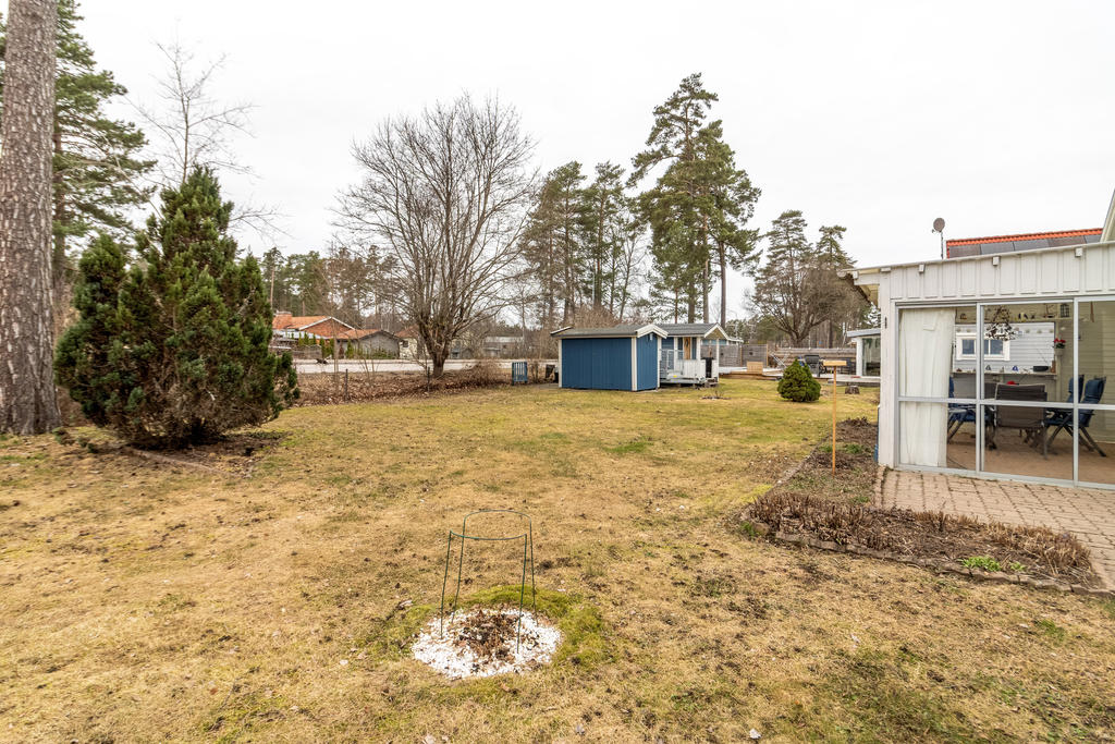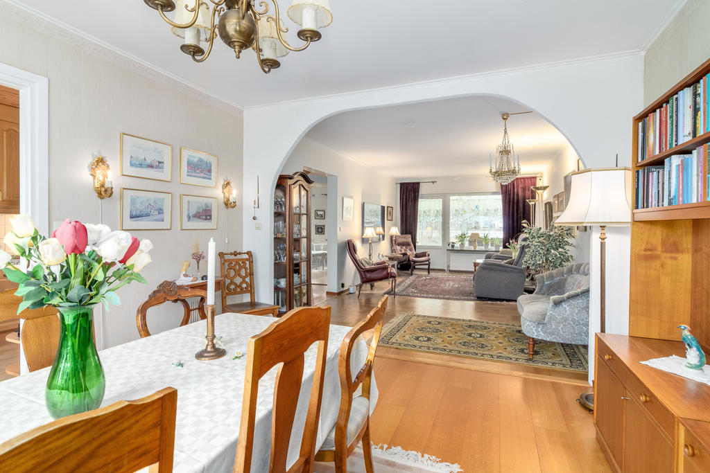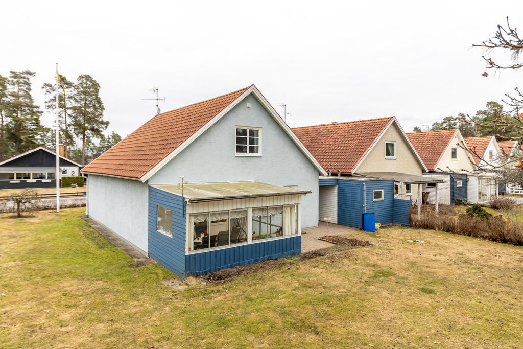 Från framsidans lugna gatan nås en prydligt stenlagd uppfart med utrymme för bilen framför garaget. I garaget finns gott om plats för förvaring och hobbys, men även en bastu som använts flitigt på lediga helger. Den plana trädgården är uppväxt med prydliga buskar, höga insynsskyddande tujor och formklippta träd. Här finns även ett trädgårdsland, vinbär, rabarber och på sommaren dignar uterummets tak av vindruvor. I trädgården finns även ett förråd för trädgårdsredskap. Tomterna tillhör en av de större och till skillnad från de flesta grannarnas kedjehus ligger detta hus fritt med trädgård runt hela sidan av huset. I den gröna trädgårdens baksida har man sol från lunch fram till eftermiddag- och kväll och i uterummet njuter man av vårvinterns allra första fika i solen och det är här tomaterna växter så det knakar på sommaren. Via den takade passagen mellan huset och garaget nås entréhallen som har klädhängare och badrum med dusch direkt innan för dörren. Rakt fram öppnar planlösningen upp mot ett rymligt vardagsrum med öppen planlösning till matrum. Vardagsrummet har stora fönster mot trädgårdens baksida och utgång till det inglasade uterummet. Till höger om hallen nås köket som har ekluckor med profiler och matplats för 4-6 personer. Från matplatsen invid det stora fönstret lyser morgonsolen in till frukosten och man har perfekt uppsikt över barnens lekar på gården utanför. Från köket nås tvättstuga med groventré. Våningsplanet disponerar även ett generöst sovrum som lätt går att dela av till 2 sovrum, så som planlösningen varit från början. Även matrummet har tidigare varit ett sovrum avdelat mot vardagsrummet. Trätrappan i hallen leder upp till övervåningens mer privata utrymmen. Här ryms 2 sovrum, wc och gott om förvaringsutrymmen i garderober och kattvindar.