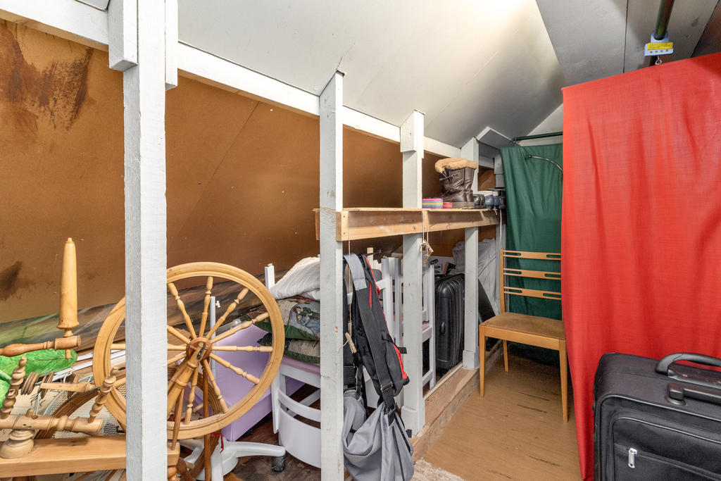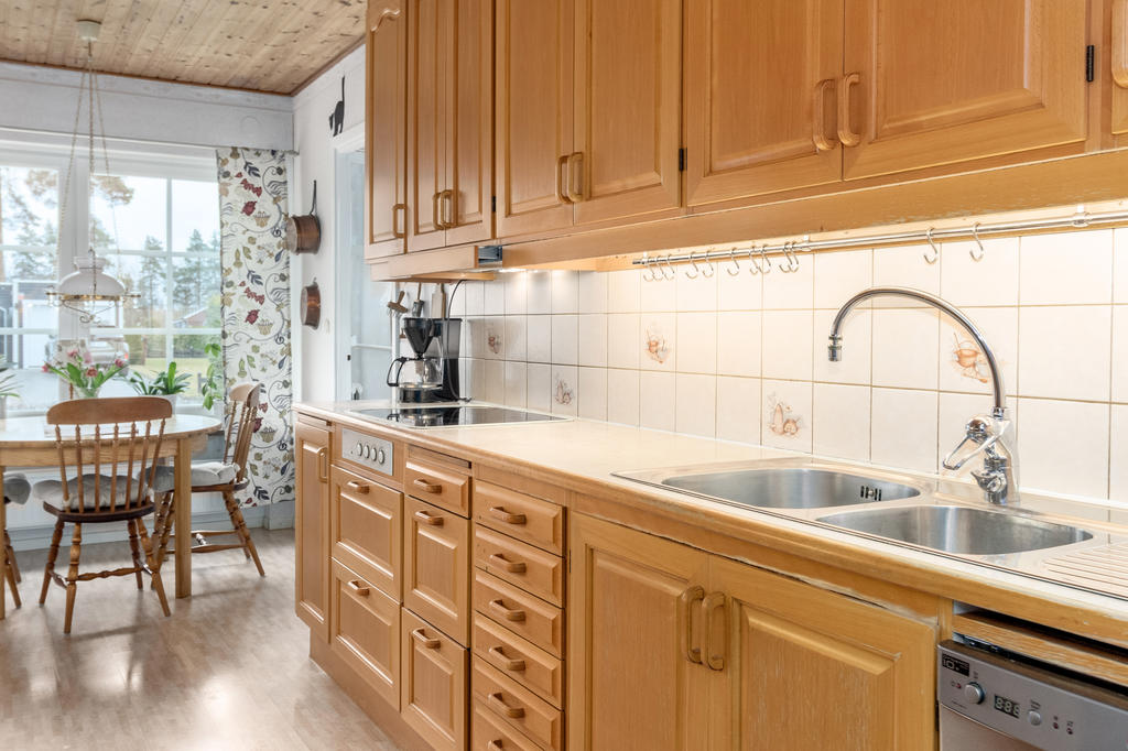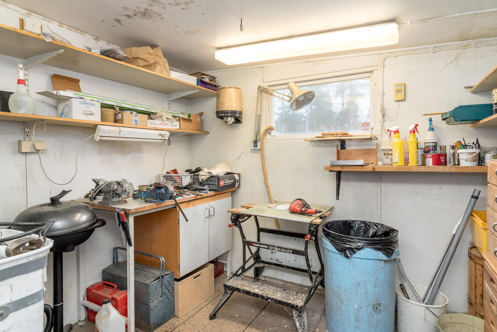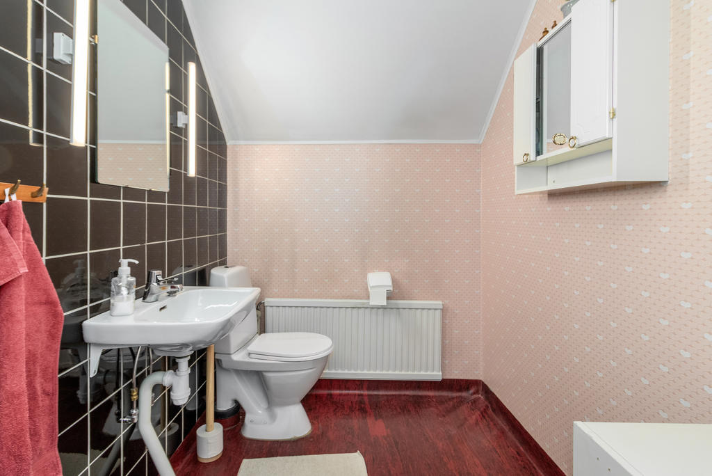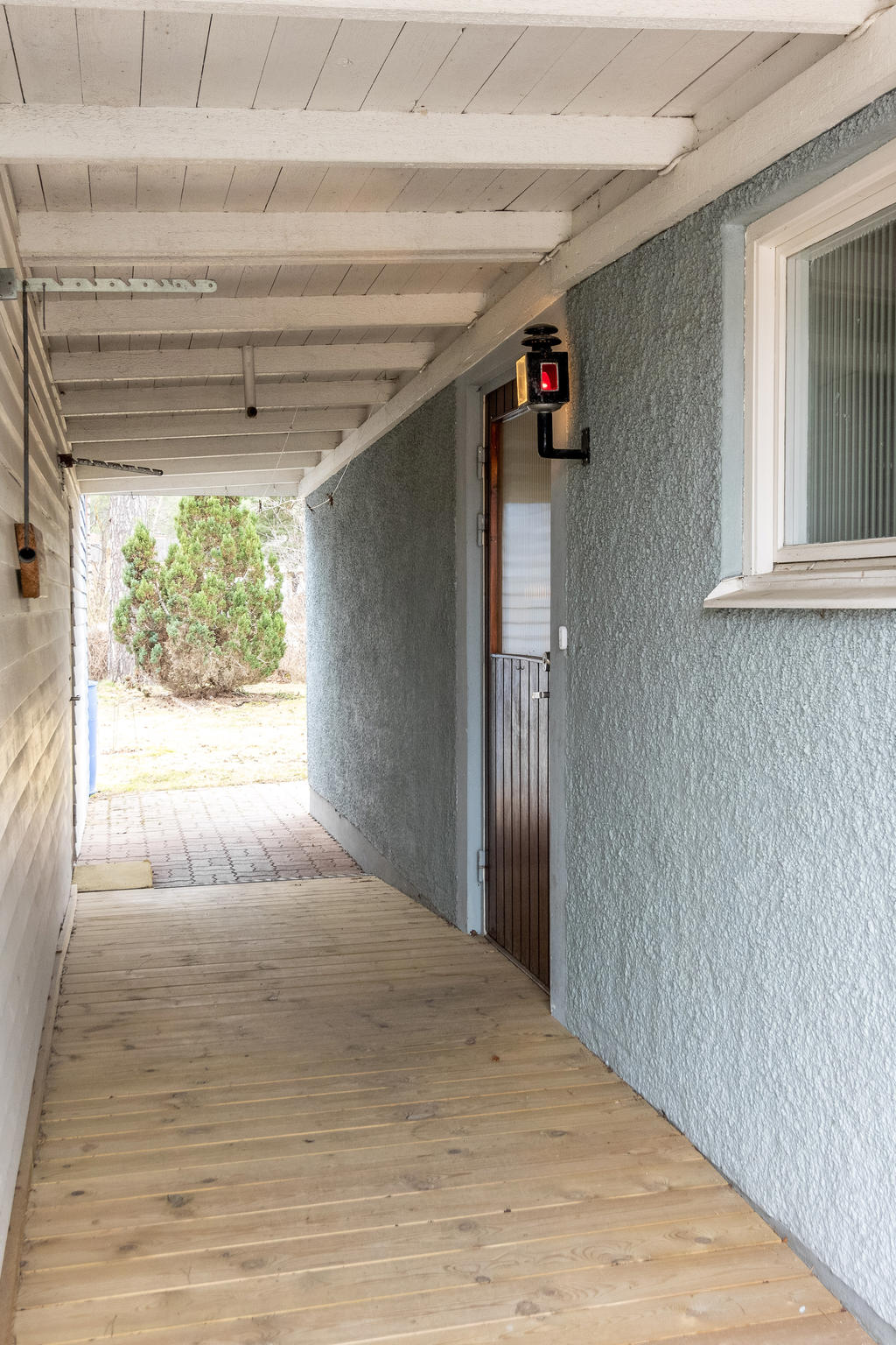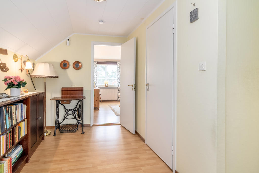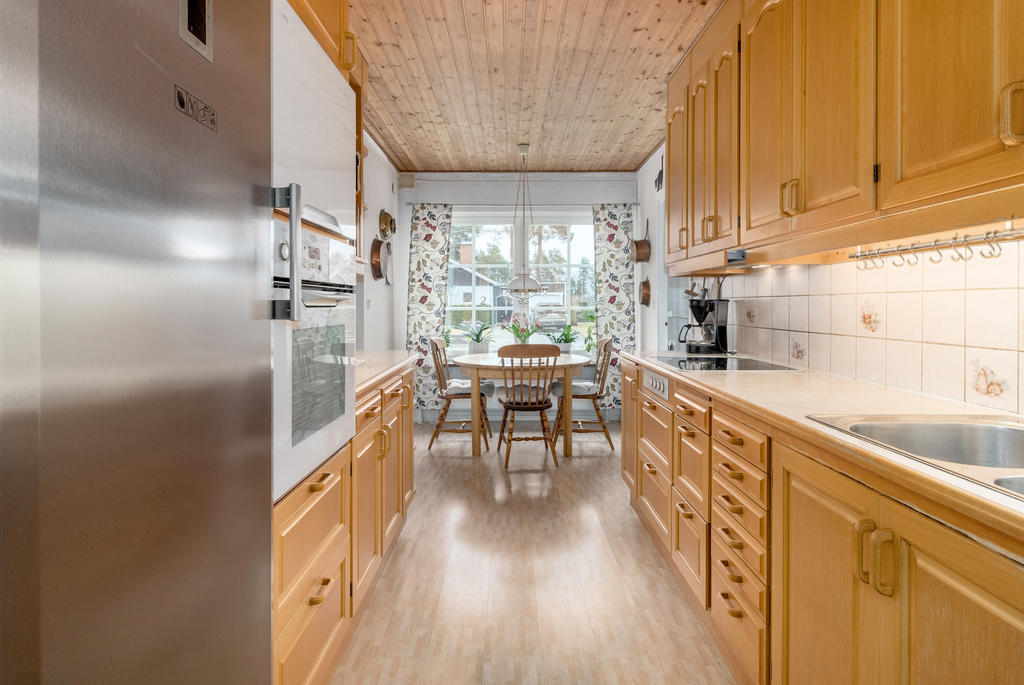 Från framsidans lugna gatan nås en prydligt stenlagd uppfart med utrymme för bilen framför garaget. I garaget finns gott om plats för förvaring och hobbys, men även en bastu som använts flitigt på lediga helger. Den plana trädgården är uppväxt med prydliga buskar, höga insynsskyddande tujor och formklippta träd. Här finns även ett trädgårdsland, vinbär, rabarber och på sommaren dignar uterummets tak av vindruvor. I trädgården finns även ett förråd för trädgårdsredskap. Tomterna tillhör en av de större och till skillnad från de flesta grannarnas kedjehus ligger detta hus fritt med trädgård runt hela sidan av huset. I den gröna trädgårdens baksida har man sol från lunch fram till eftermiddag- och kväll och i uterummet njuter man av vårvinterns allra första fika i solen och det är här tomaterna växter så det knakar på sommaren. Via den takade passagen mellan huset och garaget nås entréhallen som har klädhängare och badrum med dusch direkt innan för dörren. Rakt fram öppnar planlösningen upp mot ett rymligt vardagsrum med öppen planlösning till matrum. Vardagsrummet har stora fönster mot trädgårdens baksida och utgång till det inglasade uterummet. Till höger om hallen nås köket som har ekluckor med profiler och matplats för 4-6 personer. Från matplatsen invid det stora fönstret lyser morgonsolen in till frukosten och man har perfekt uppsikt över barnens lekar på gården utanför. Från köket nås tvättstuga med groventré. Våningsplanet disponerar även ett generöst sovrum som lätt går att dela av till 2 sovrum, så som planlösningen varit från början. Även matrummet har tidigare varit ett sovrum avdelat mot vardagsrummet. Trätrappan i hallen leder upp till övervåningens mer privata utrymmen. Här ryms 2 sovrum, wc och gott om förvaringsutrymmen i garderober och kattvindar.