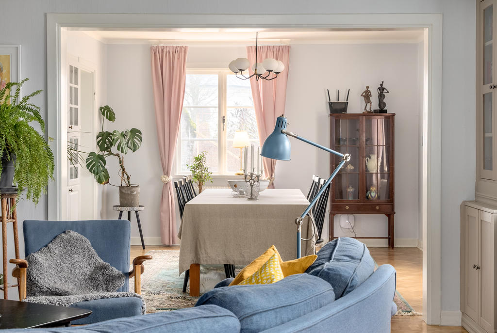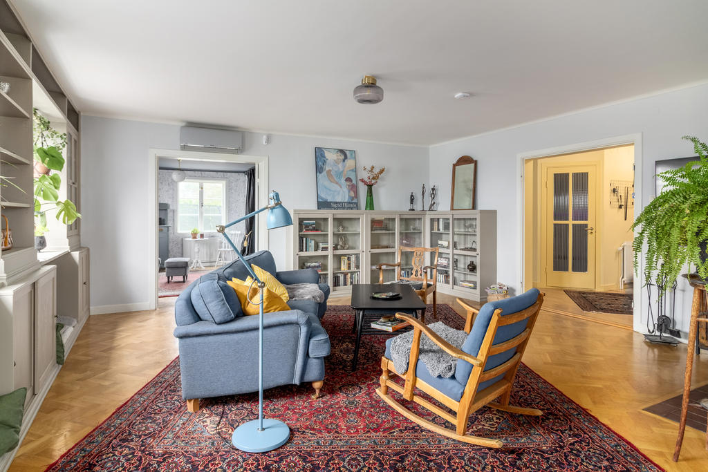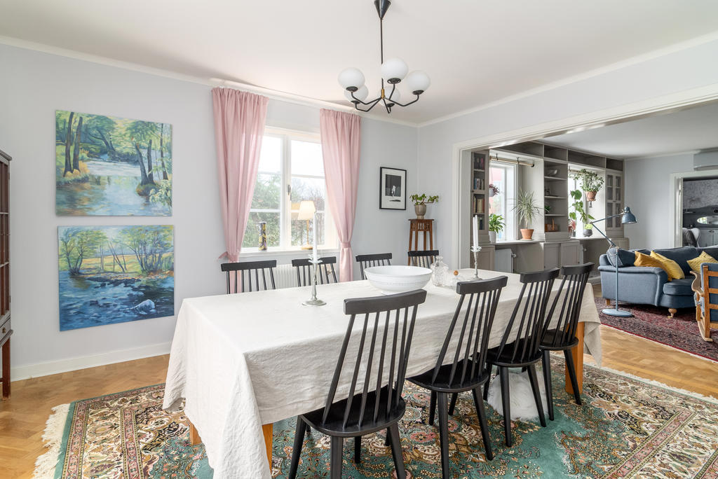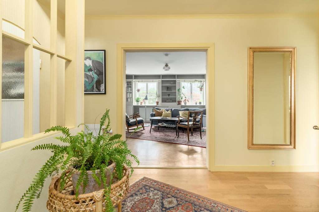 Farstukvisten välkomnar in till en entréhall och rymligare inre hall. Bakom glasdörren till höger finns ett helkaklat badrum, lika stilsäkert och nyrenoverat som övriga ytor på våningsplanet. Rakt fram öppnar planlösningen upp mot den 30 m² stora salongen. De generösa sociala ytorna med stort matrum och bibliotek jämte salongen inbjuder till ett liv med sociala tillställningar, med gott om plats för såväl vänner som familj. Färgsättning och materialval är mycket medvetna, på golvet har fiskbensparkett och i kaminen sprakar brasan. Rummen disponerar hela husets längd vilket ger ett naturligt ljus från tre väderstreck. Matsalen har platsbyggda hyllor för vitrin och rymmer matsalsmöbel för upp till 20 personer och salongen har platsbyggda hyllor med djupa fönsterbänkar och en nyinstallerad gjutjärnsinsats i öppna spisen. Även biblioteket, som har gamla pardörrar bevarade, och kontoret intill är generösa till ytan. Dispositionen gör att bibliotek och arbetsrum fungerar lika bra att nyttja som sovrum. Via serveringsgång från matrummet nås ett rejält kök med matplats och utsikt över köksträdgården och entrésidans uteplats nedanför.