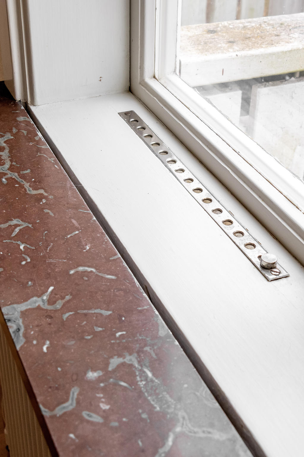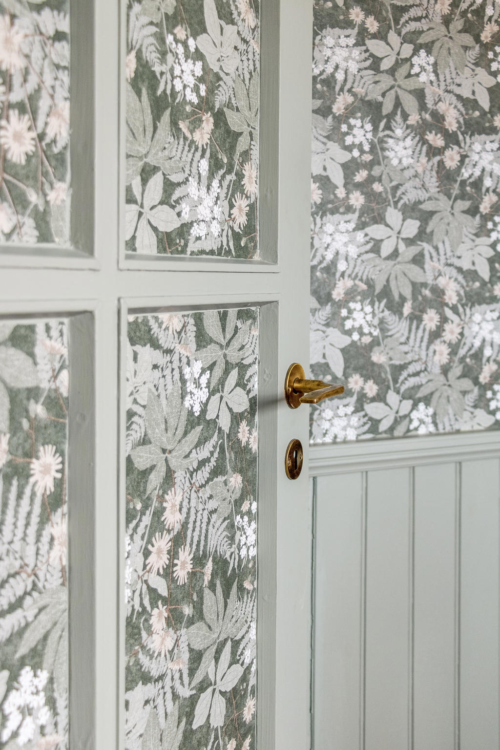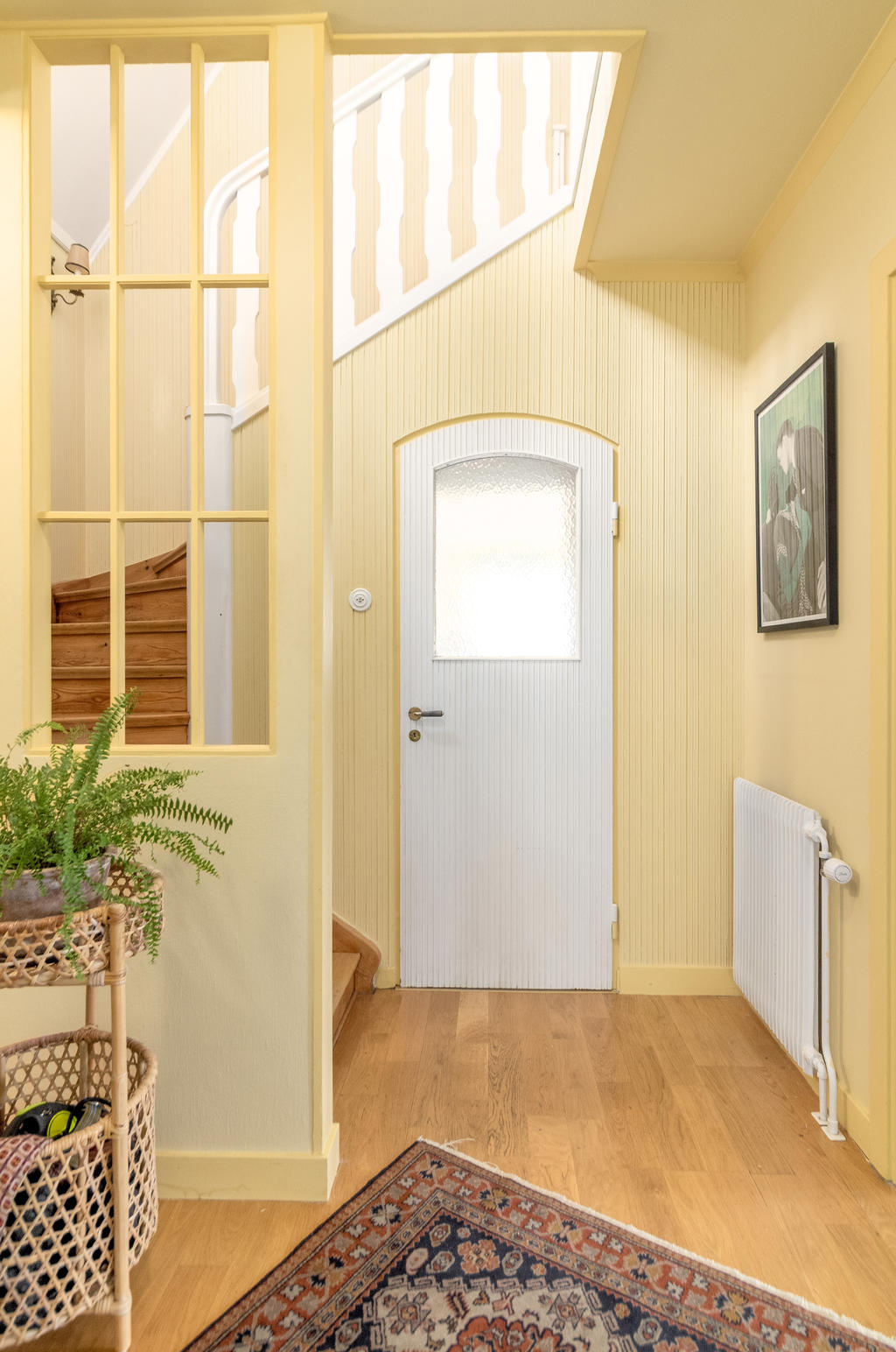 Farstukvisten välkomnar in till en entréhall och rymligare inre hall. Bakom glasdörren till höger finns ett helkaklat badrum, lika stilsäkert och nyrenoverat som övriga ytor på våningsplanet. Rakt fram öppnar planlösningen upp mot den 30 m² stora salongen. De generösa sociala ytorna med stort matrum och bibliotek jämte salongen inbjuder till ett liv med sociala tillställningar, med gott om plats för såväl vänner som familj. Färgsättning och materialval är mycket medvetna, på golvet har fiskbensparkett och i kaminen sprakar brasan. Rummen disponerar hela husets längd vilket ger ett naturligt ljus från tre väderstreck. Matsalen har platsbyggda hyllor för vitrin och rymmer matsalsmöbel för upp till 20 personer och salongen har platsbyggda hyllor med djupa fönsterbänkar och en nyinstallerad gjutjärnsinsats i öppna spisen. Även biblioteket, som har gamla pardörrar bevarade, och kontoret intill är generösa till ytan. Dispositionen gör att bibliotek och arbetsrum fungerar lika bra att nyttja som sovrum. Via serveringsgång från matrummet nås ett rejält kök med matplats och utsikt över köksträdgården och entrésidans uteplats nedanför.
