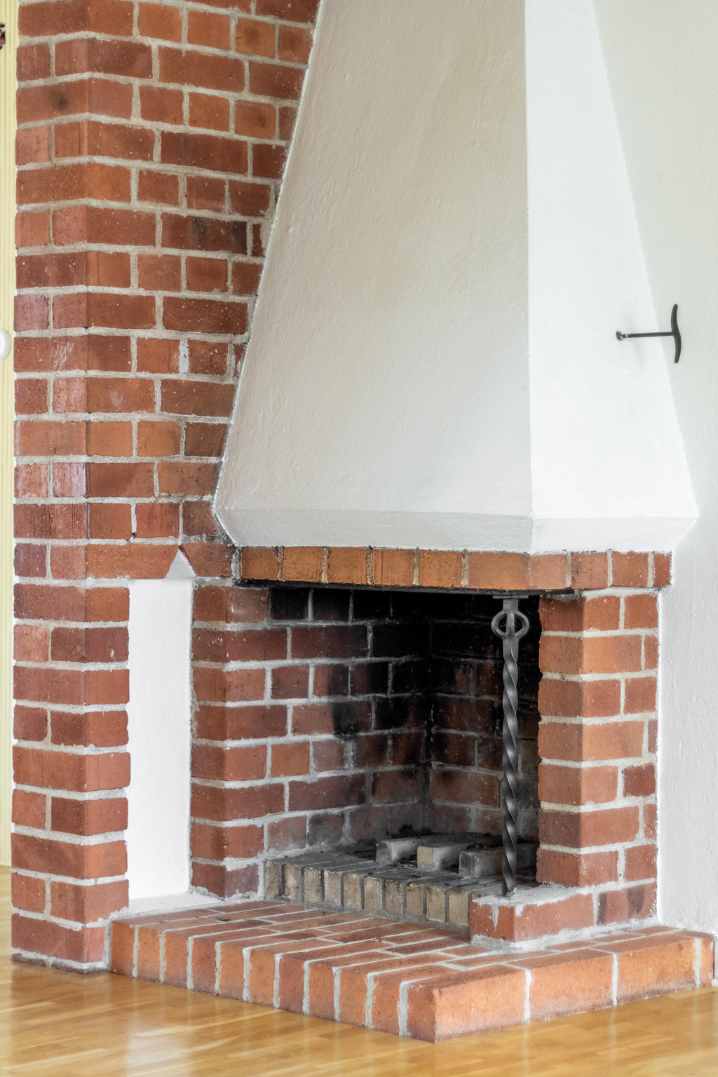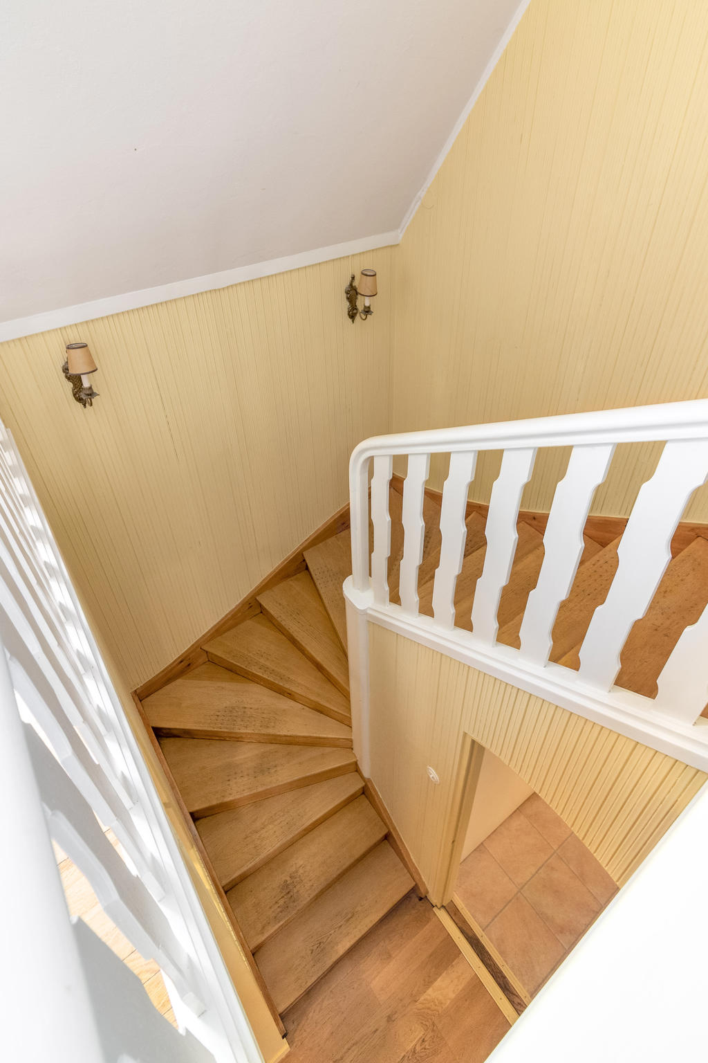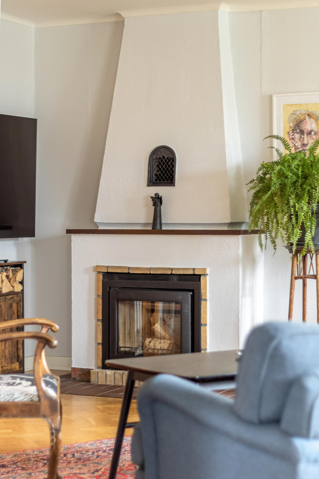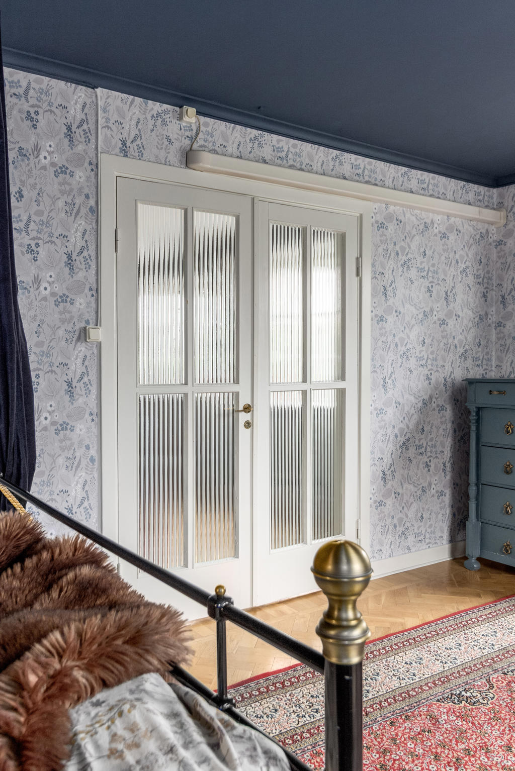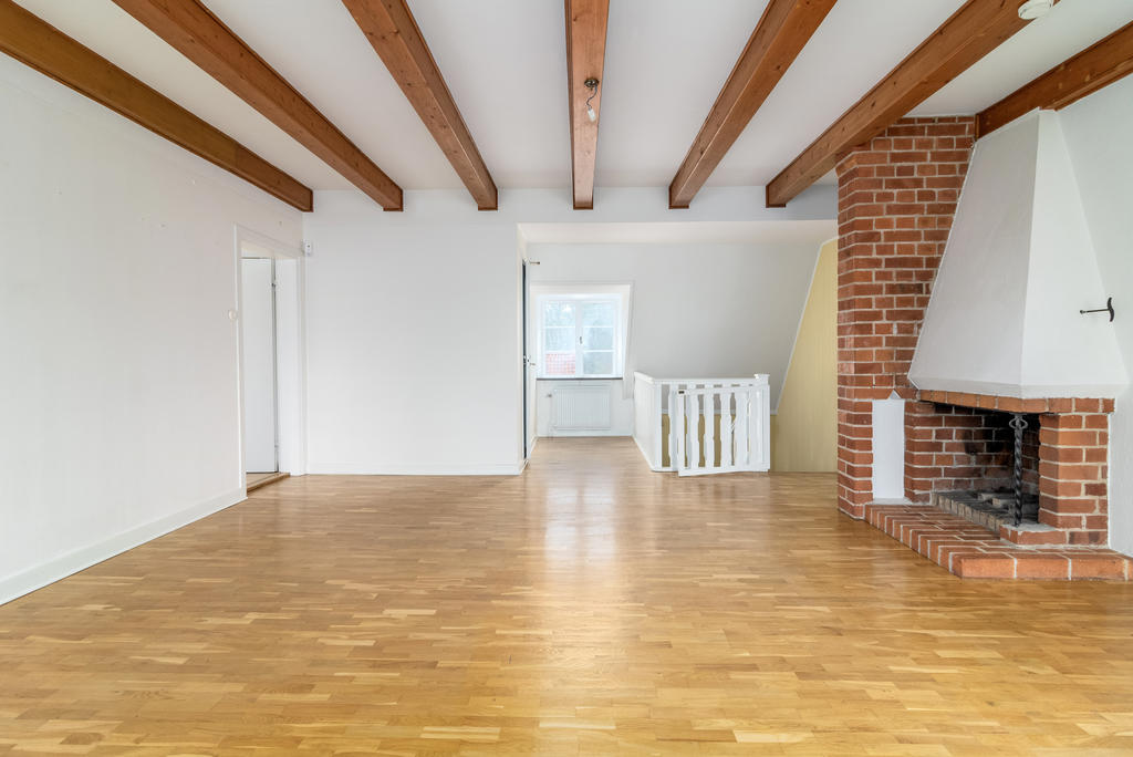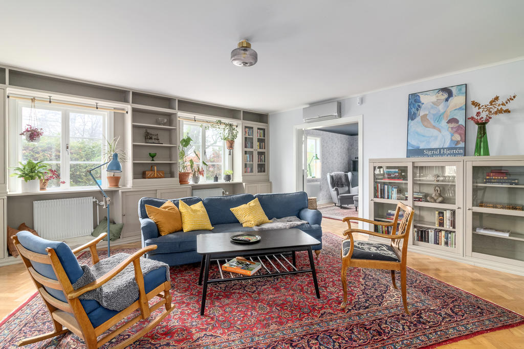 Den breda svängda trätrappan har fina snickerier med fönster mot entréhall och smalrandig panel, och leder upp till övervåningens mer privata utrymmen. Här finns ett rejält vardagsrum med ljusinsläpp från två väderstreck. Även detta rum är 30 m² stort, har parkettgolv och öppen spis. Lägg märke till nischen i murstocken, en perfekt plats för att accentuera konstföremål. Våningsplanet disponerar även ett badrum och 4 stora sovrum med gott om förvaring i platsbyggda garderober och i kattvindar. Badrummet är inrett i samma stil som det på entréplanet, helkaklat med schackrutigt golv, badkar på tassar och gammaldags blandare med dubbla vred.