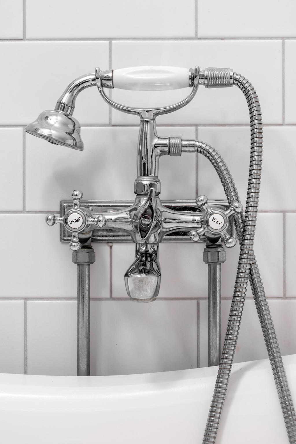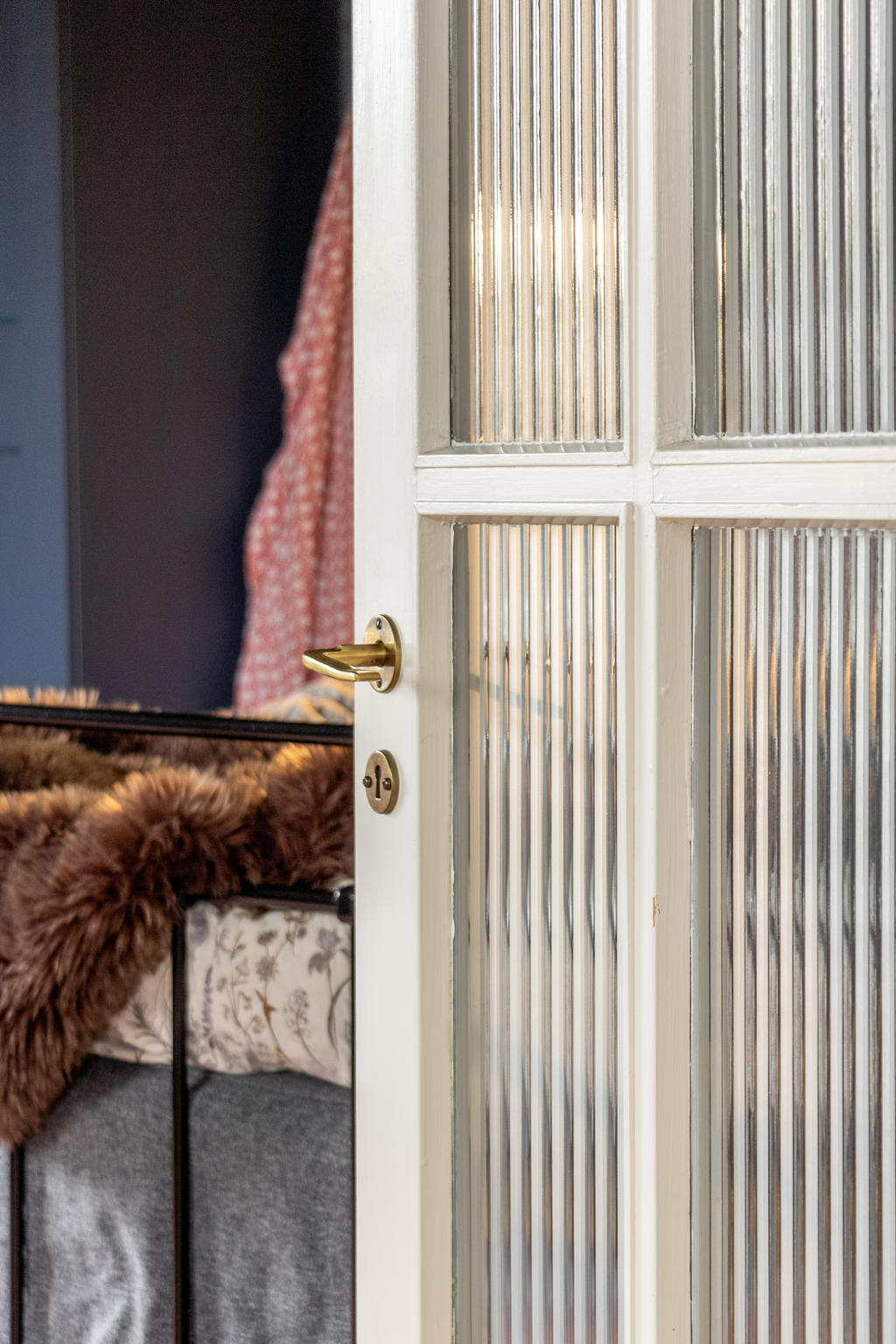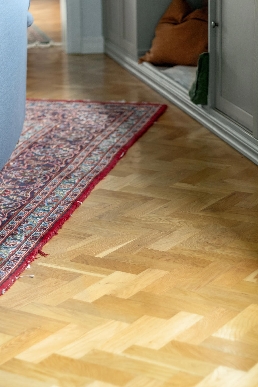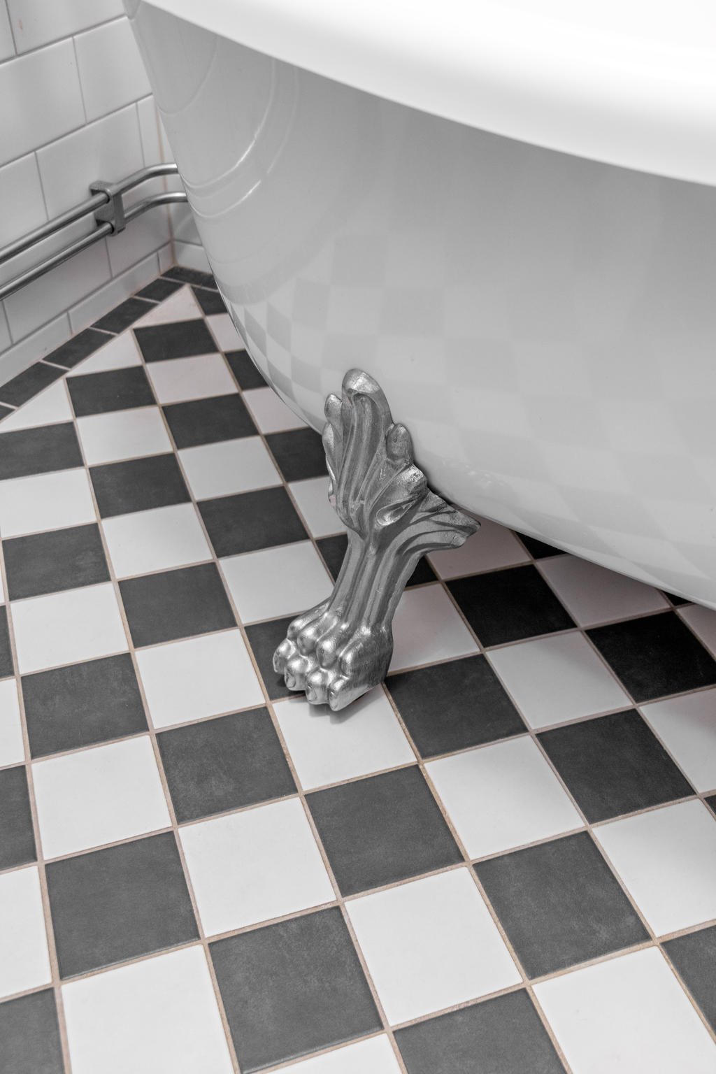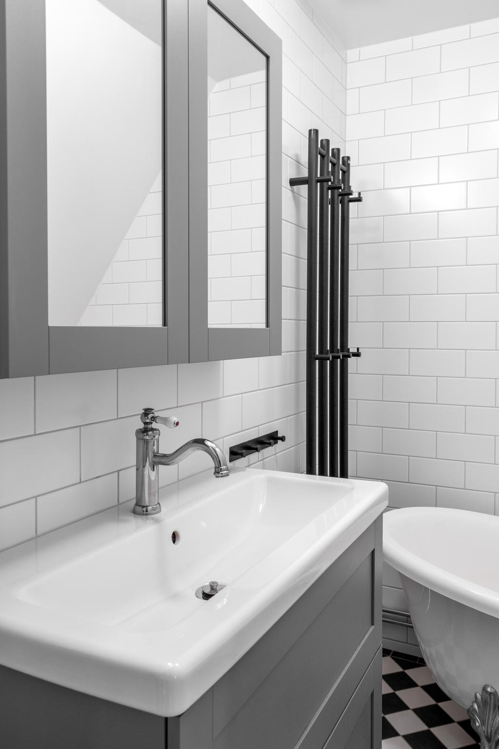 Den breda svängda trätrappan har fina snickerier med fönster mot entréhall och smalrandig panel, och leder upp till övervåningens mer privata utrymmen. Här finns ett rejält vardagsrum med ljusinsläpp från två väderstreck. Även detta rum är 30 m² stort, har parkettgolv och öppen spis. Lägg märke till nischen i murstocken, en perfekt plats för att accentuera konstföremål. Våningsplanet disponerar även ett badrum och 4 stora sovrum med gott om förvaring i platsbyggda garderober och i kattvindar. Badrummet är inrett i samma stil som det på entréplanet, helkaklat med schackrutigt golv, badkar på tassar och gammaldags blandare med dubbla vred.