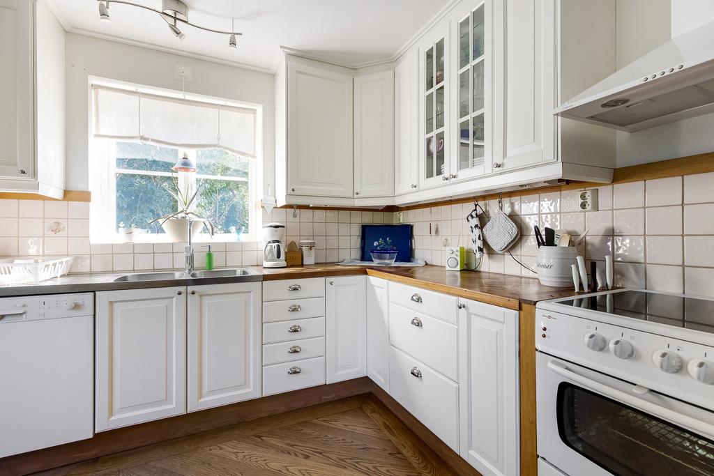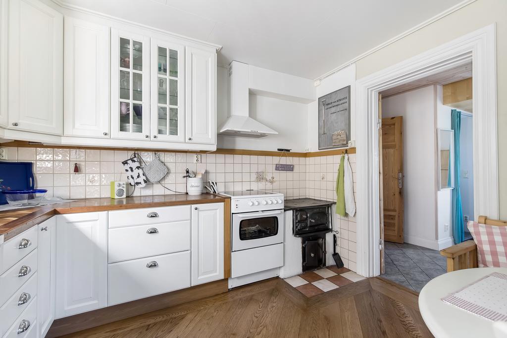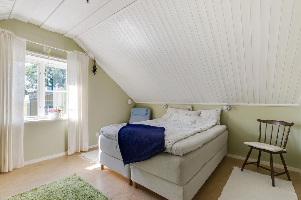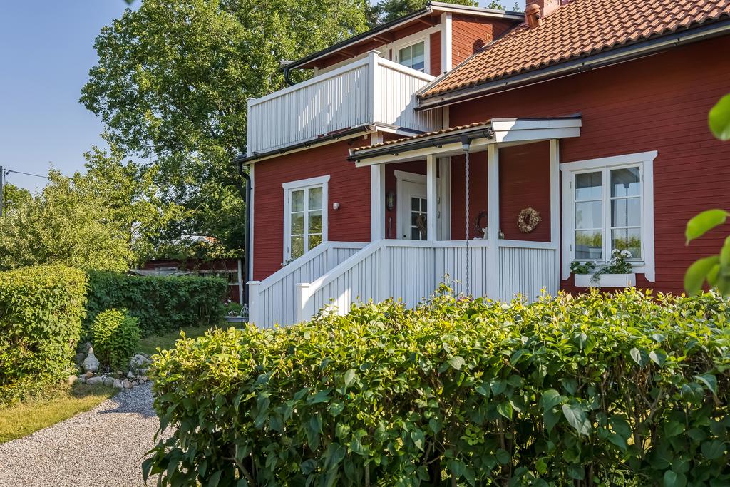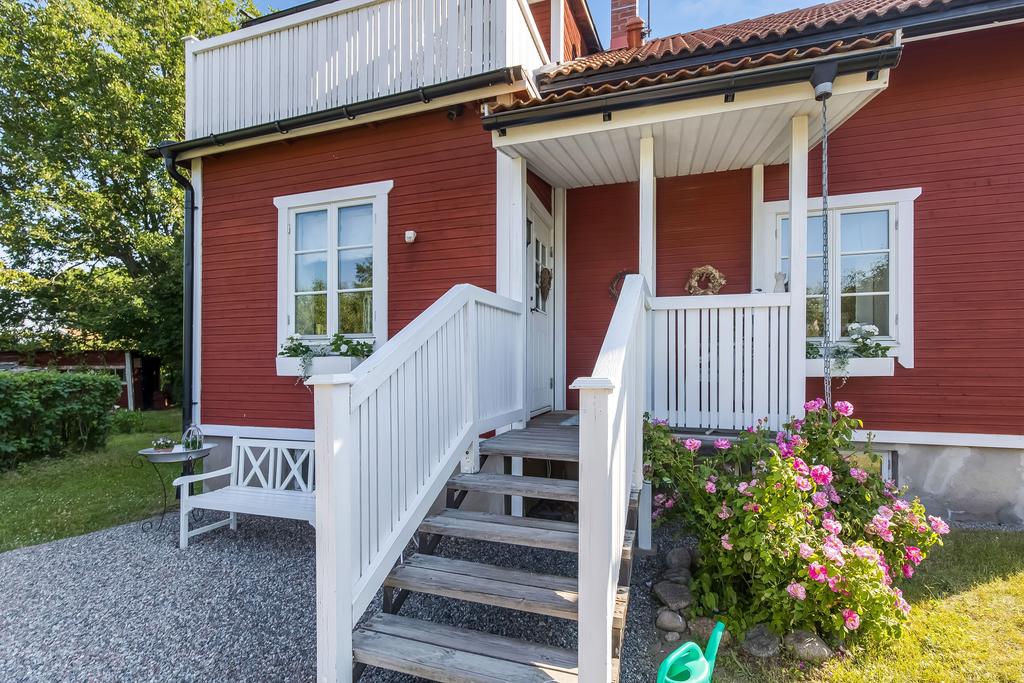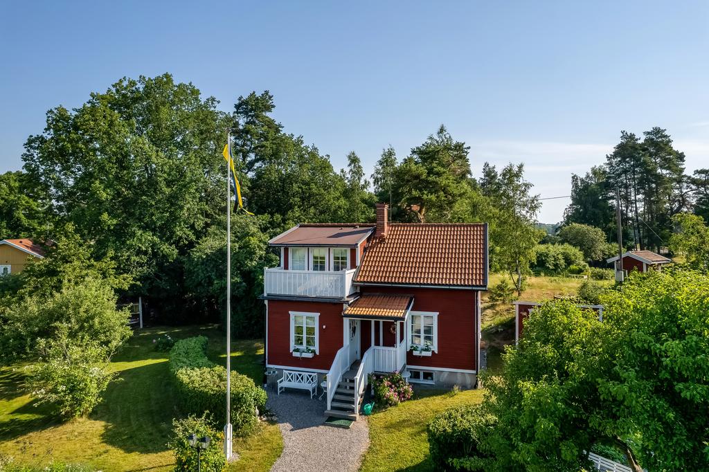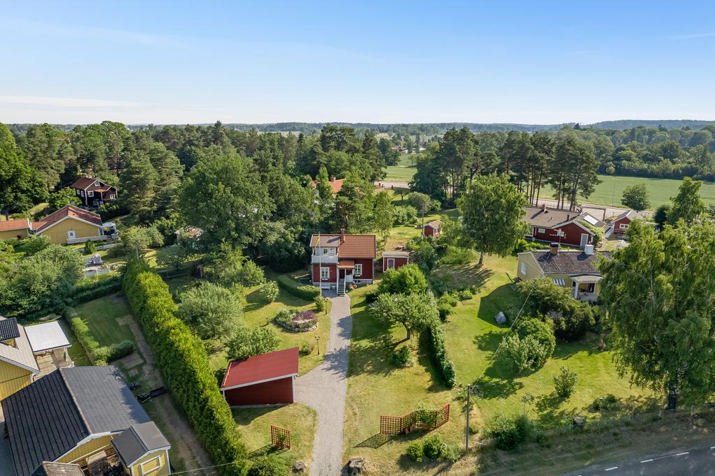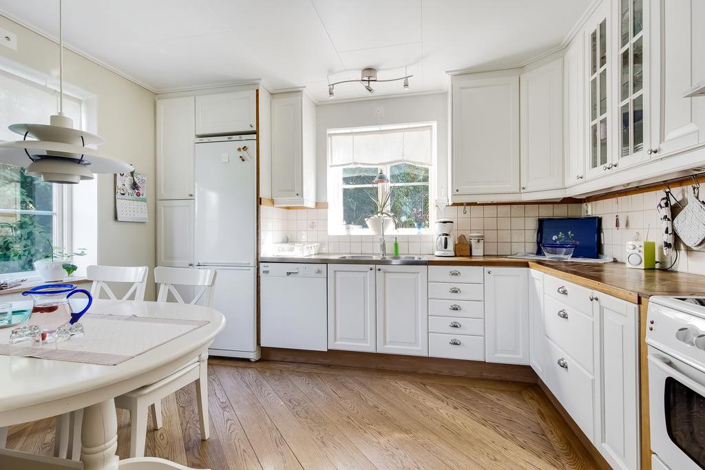 Den idylliska faluröda villan från 1929 disponerar 4 rum och kök fördelade på två våningsplan samt hela källare. Huset välkomnar in via takad farstukvist med utrymme för ett litet caféset. Innanför dörren nås en ljus hall med praktiskt klinkergolv och krokar för ytterkläder bakom hörnet. Lägg märke till de djupa stenskivorna i fönstret som har en mjukt välvd kant in mot rummet. Entréplanet disponerar ett lantligt kök och vardagsrum, båda med fönster i två väderstreck. Köket har en fint trägolv med breda stavar och är inrett med vita lackade spegelluckor och en handgjord bänkskiva med fiskbensmönster. Även fönsterbänkarna är handgjorda med frästa kanter. Den gamla vedspisen går utmärkt att laga mat på och fungerar även bra som värmekälla om det skulle behövas. Matplatsen vid fönstret rymmer 4-6 personer till vardags, men det går fint att få plats med ytterligare några platser under helgernas middagsbesök. I vardagsrummet intill ståtar den vackra kakelugnen. Kaklet har vit botten och ljust blå dekor och bakom luckorna har en modernare glaslucka installerats, så att man även kan se elden i kakelugnen.