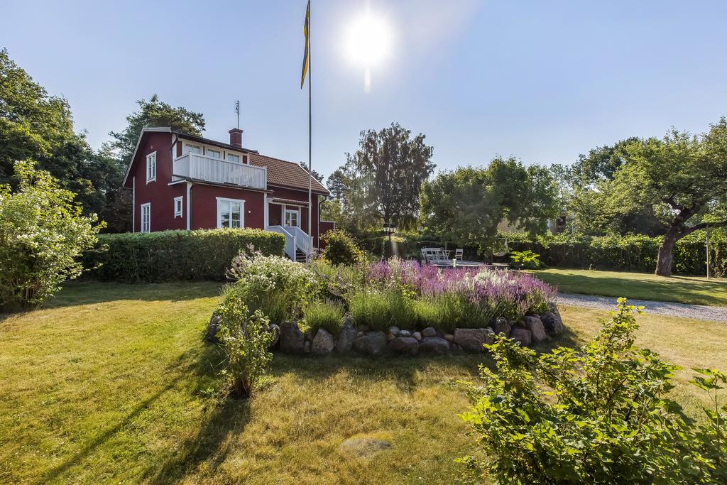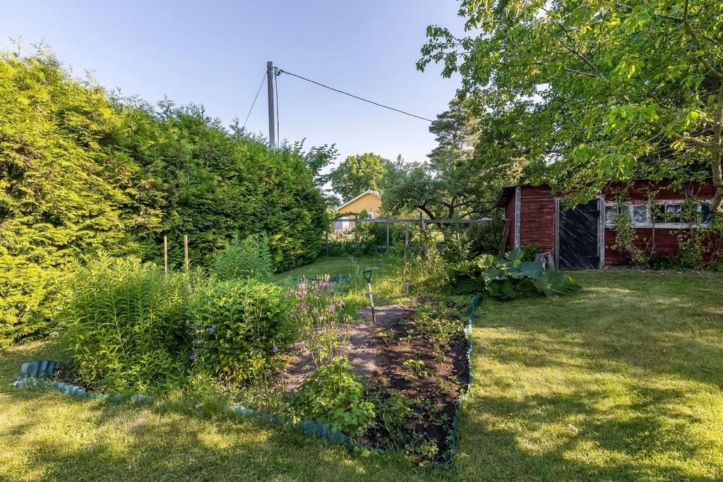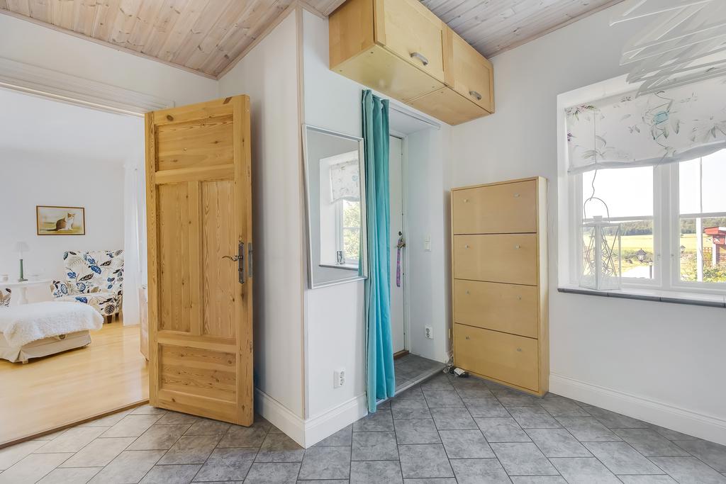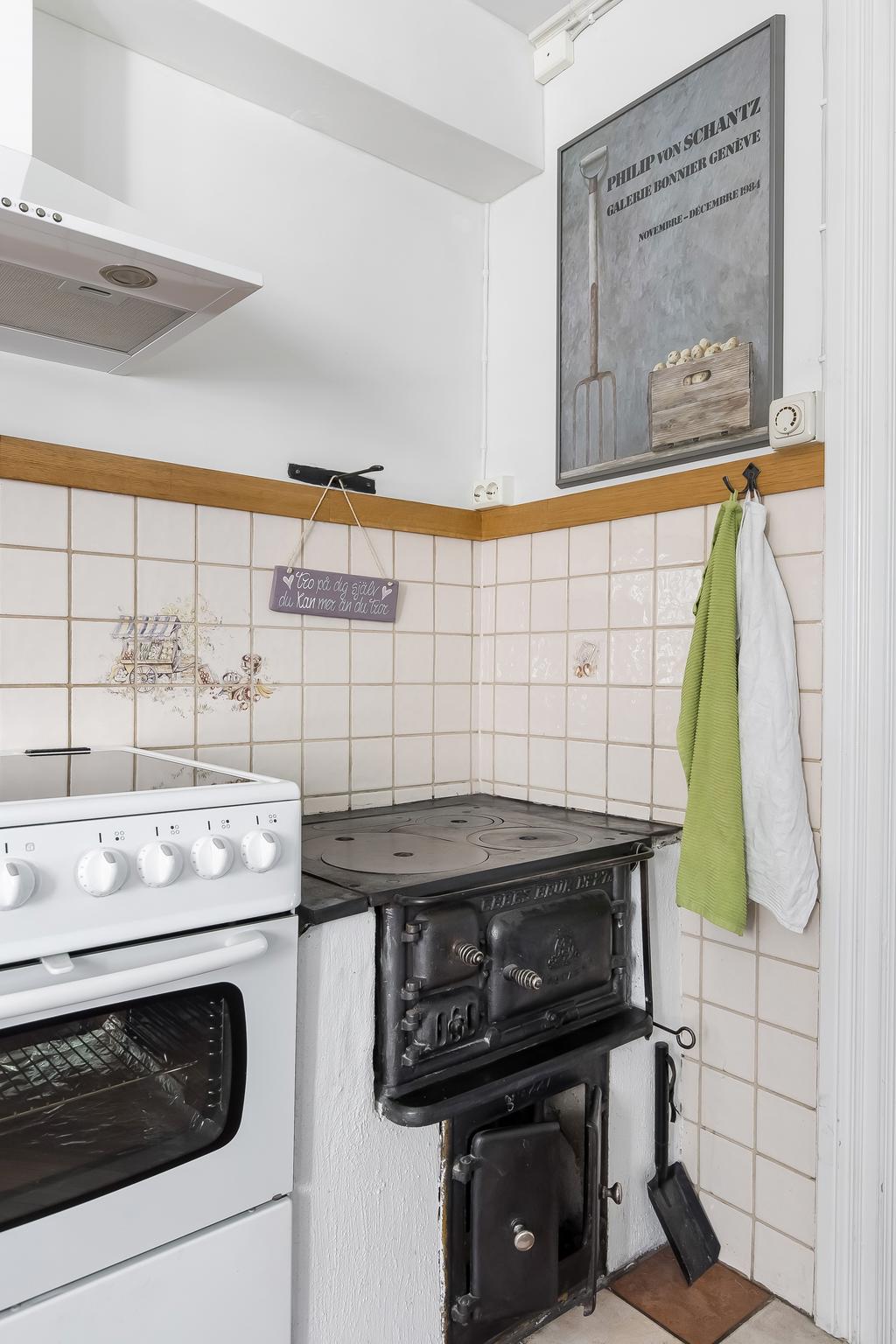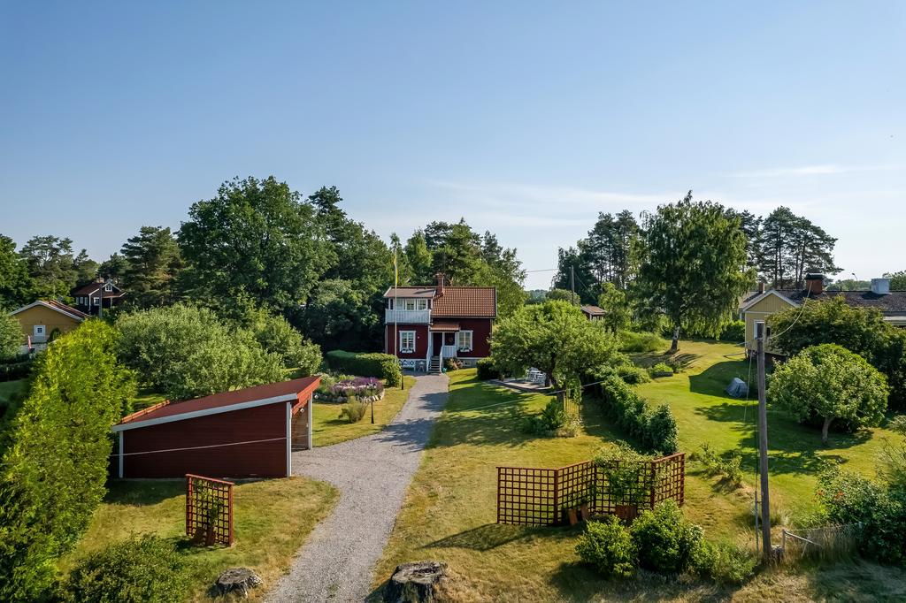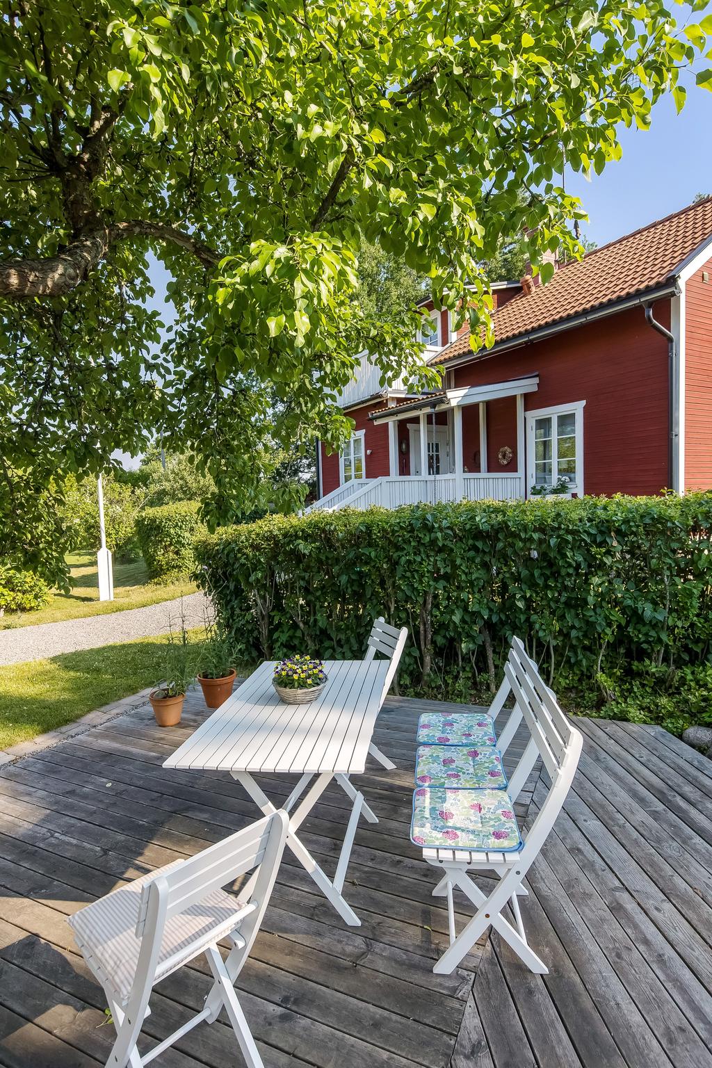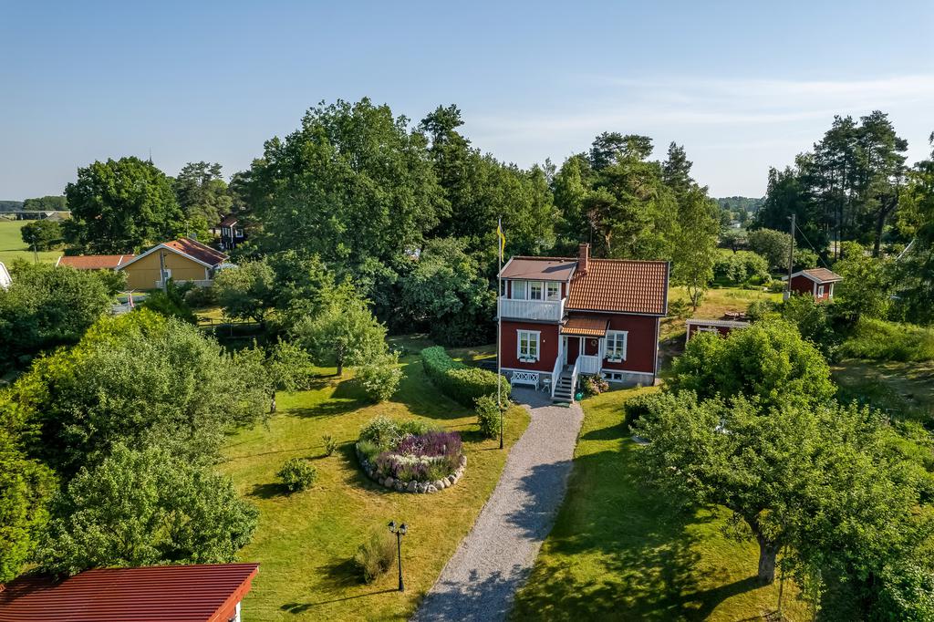 Den idylliska faluröda villan från 1929 disponerar 4 rum och kök fördelade på två våningsplan samt hela källare. Huset välkomnar in via takad farstukvist med utrymme för ett litet caféset. Innanför dörren nås en ljus hall med praktiskt klinkergolv och krokar för ytterkläder bakom hörnet. Lägg märke till de djupa stenskivorna i fönstret som har en mjukt välvd kant in mot rummet. Entréplanet disponerar ett lantligt kök och vardagsrum, båda med fönster i två väderstreck. Köket har en fint trägolv med breda stavar och är inrett med vita lackade spegelluckor och en handgjord bänkskiva med fiskbensmönster. Även fönsterbänkarna är handgjorda med frästa kanter. Den gamla vedspisen går utmärkt att laga mat på och fungerar även bra som värmekälla om det skulle behövas. Matplatsen vid fönstret rymmer 4-6 personer till vardags, men det går fint att få plats med ytterligare några platser under helgernas middagsbesök. I vardagsrummet intill ståtar den vackra kakelugnen. Kaklet har vit botten och ljust blå dekor och bakom luckorna har en modernare glaslucka installerats, så att man även kan se elden i kakelugnen.