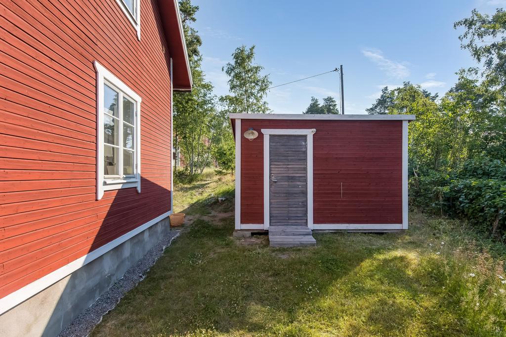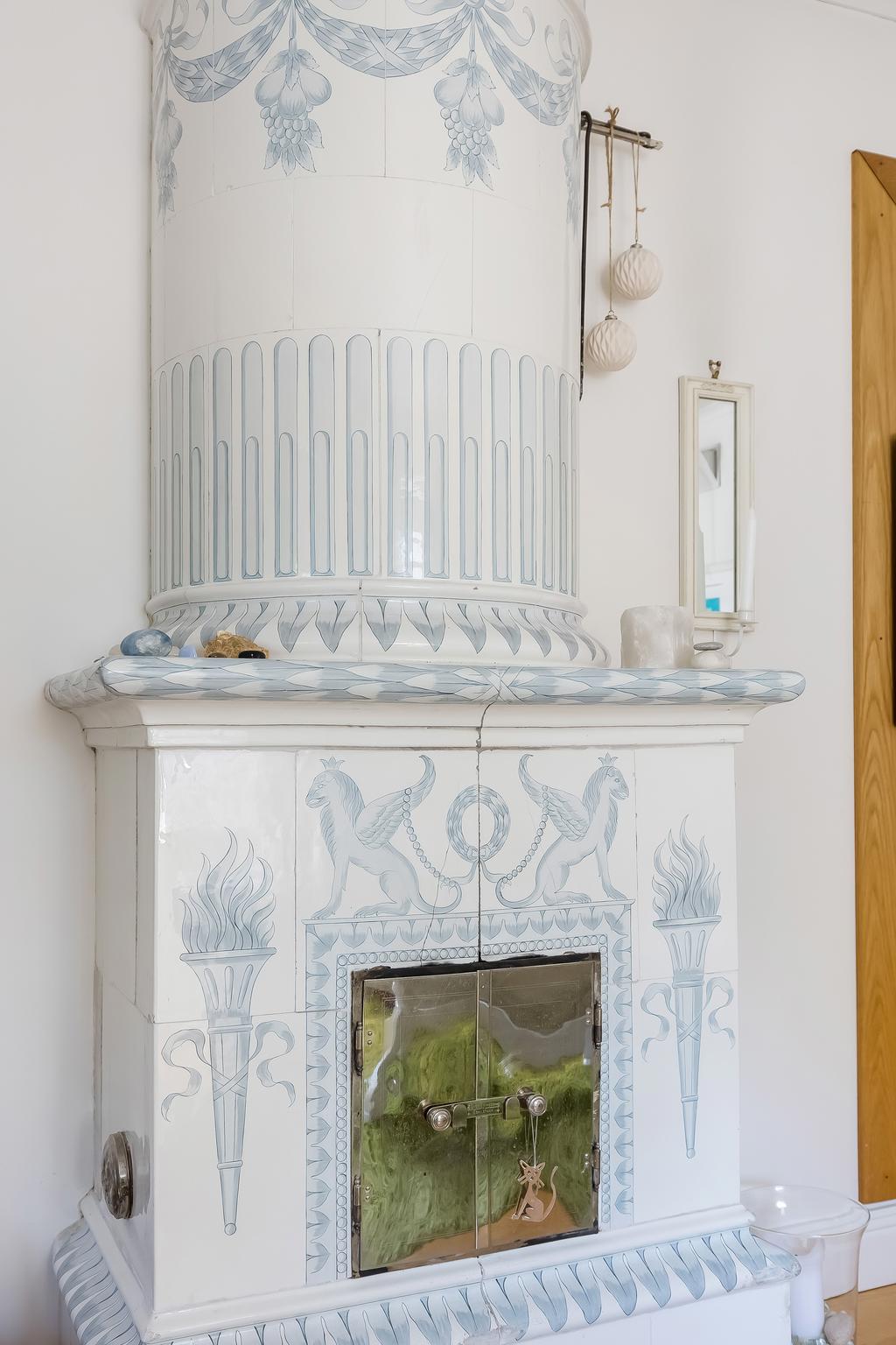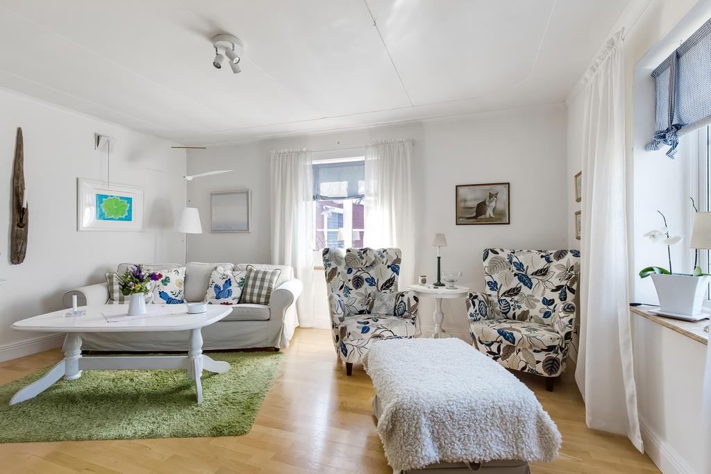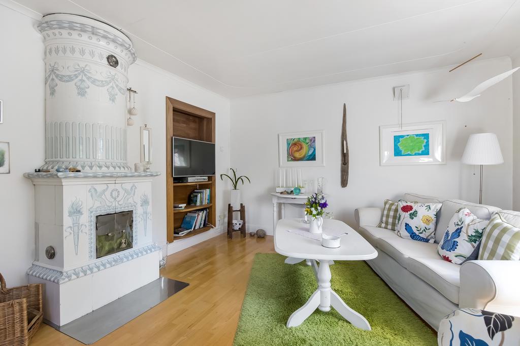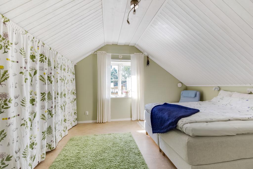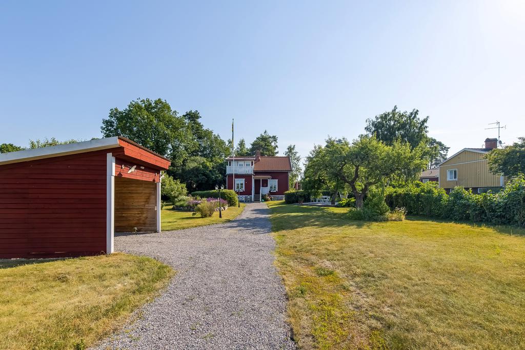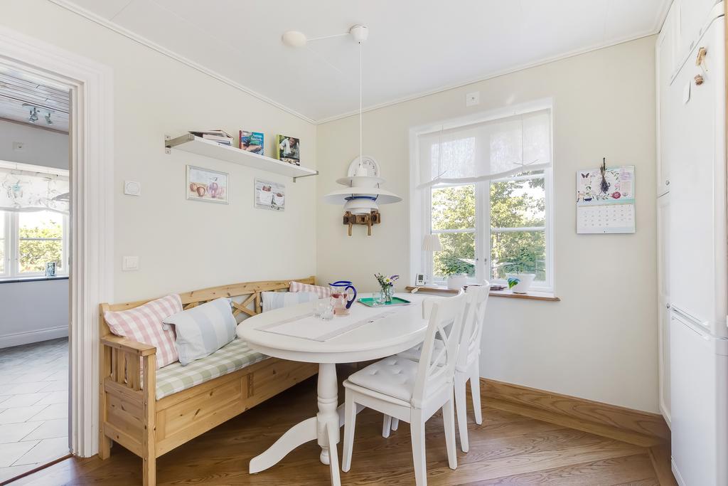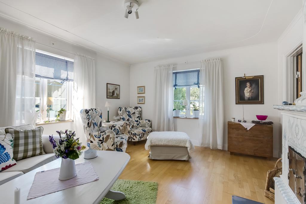 Den idylliska faluröda villan från 1929 disponerar 4 rum och kök fördelade på två våningsplan samt hela källare. Huset välkomnar in via takad farstukvist med utrymme för ett litet caféset. Innanför dörren nås en ljus hall med praktiskt klinkergolv och krokar för ytterkläder bakom hörnet. Lägg märke till de djupa stenskivorna i fönstret som har en mjukt välvd kant in mot rummet. Entréplanet disponerar ett lantligt kök och vardagsrum, båda med fönster i två väderstreck. Köket har en fint trägolv med breda stavar och är inrett med vita lackade spegelluckor och en handgjord bänkskiva med fiskbensmönster. Även fönsterbänkarna är handgjorda med frästa kanter. Den gamla vedspisen går utmärkt att laga mat på och fungerar även bra som värmekälla om det skulle behövas. Matplatsen vid fönstret rymmer 4-6 personer till vardags, men det går fint att få plats med ytterligare några platser under helgernas middagsbesök. I vardagsrummet intill ståtar den vackra kakelugnen. Kaklet har vit botten och ljust blå dekor och bakom luckorna har en modernare glaslucka installerats, så att man även kan se elden i kakelugnen.