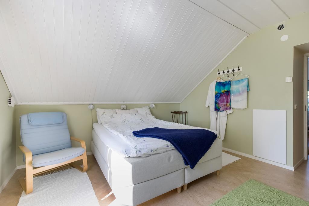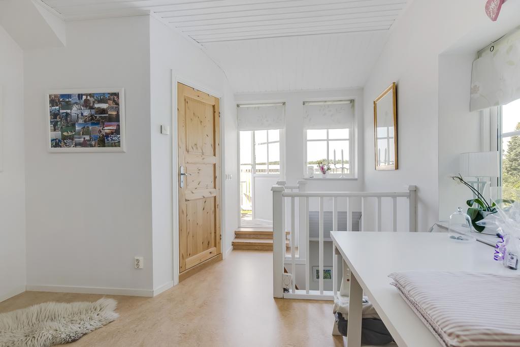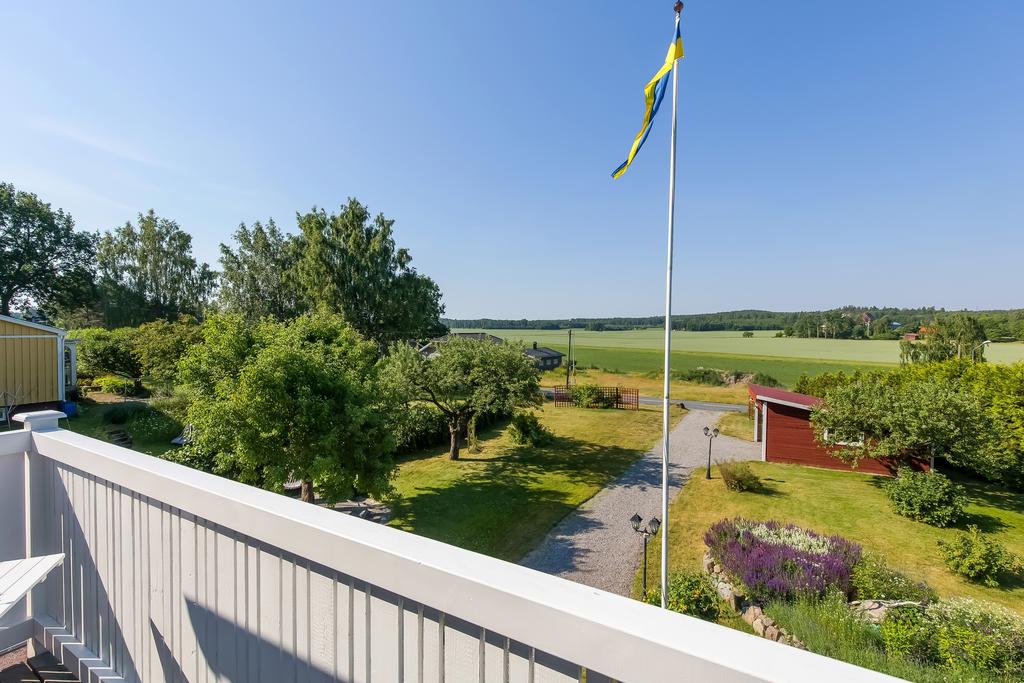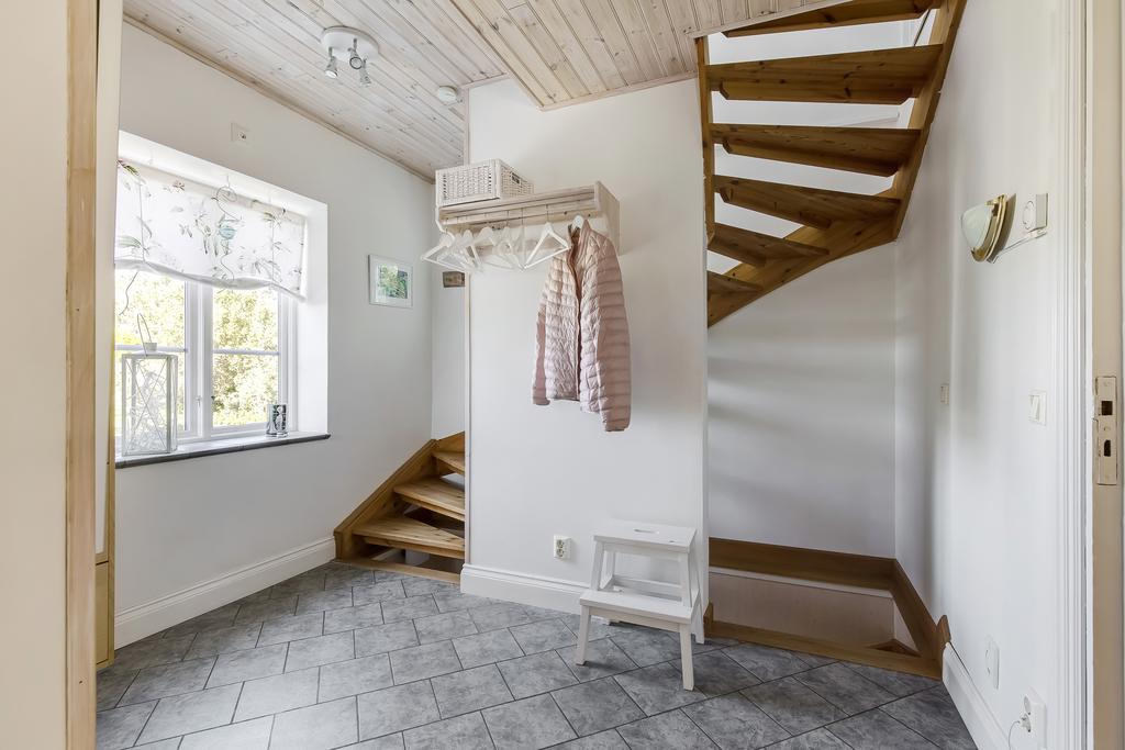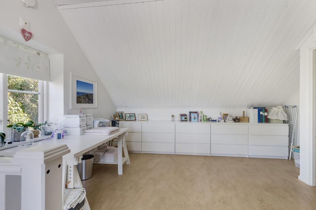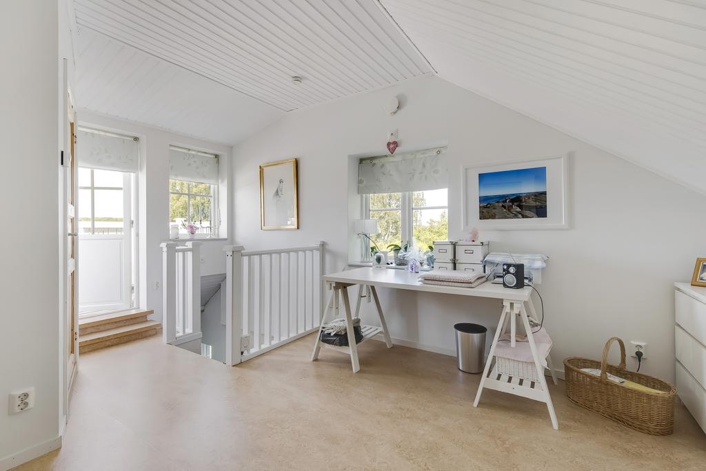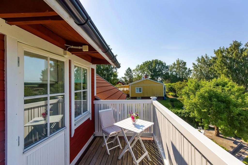 Den svängda trätrappan i hallen leder upp till husets mer privata utrymmen. Här finns ett allrum med utgång till balkong med plats för bord och stolar, badrum och ett sovrum. Takhöjden är generös och trätaken vitmålade, badrummet är helkaklat och utrustat med badkar. Från balkongen har man fantastisk utsikt över trädgården och åkern nedanför.