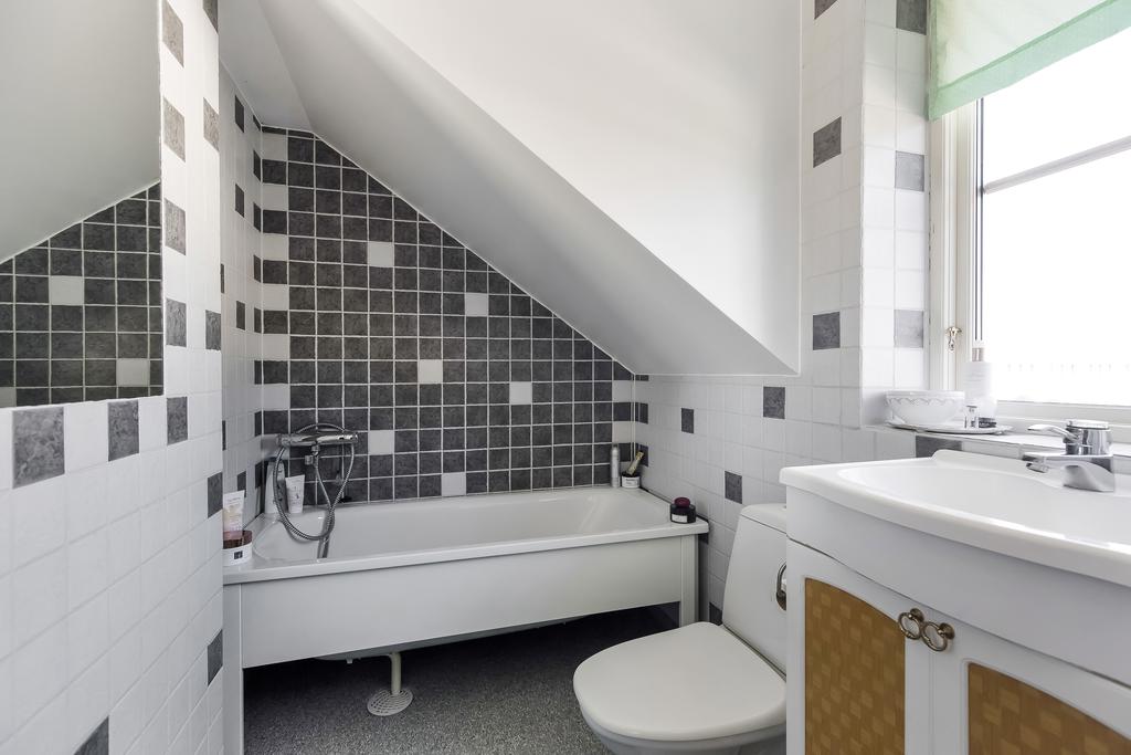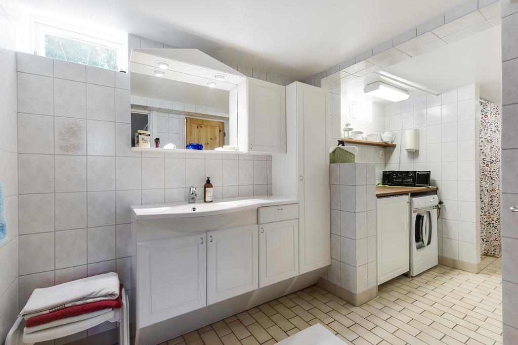 I källaren finns ytterligare ett sovrum, praktiskt tvättstuga med dusch och separat wc, förrådsutrymmen och klassisk matkällare för förvaring av syltburkar och dryck. Sovrummet passar perfekt för tonåringen, som gästrum eller som sommarsvalt sovrum. Tvättstugan är helkaklad med klinkergolv, har ett stort tvättställ, dusch och ingång till ett förråd.
