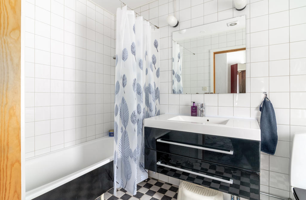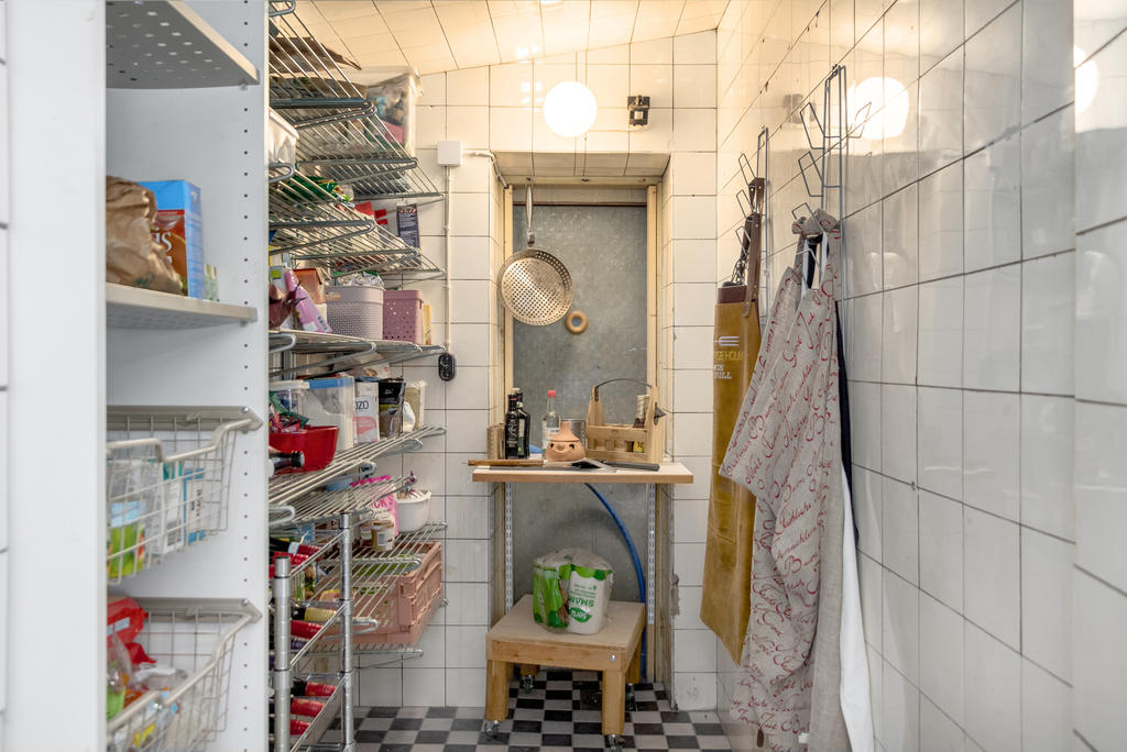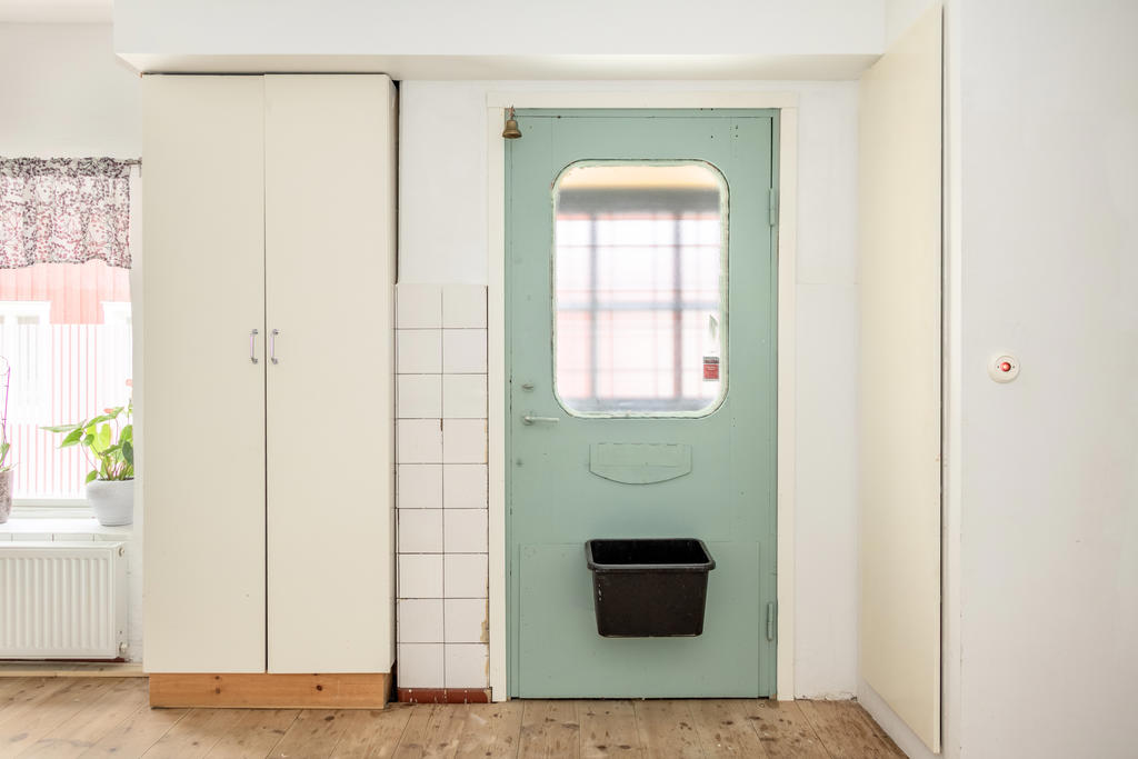 Entréhallen som nås från innergården är praktiskt planerad med hexogonformat klinkergolv och med bra utrymme för kläder, helkaklat badrum och duschrum samt rymlig tvättstuga. Alla våtrum är helkaklade i vitt och golven med svart-vitt klinker har vattenburen golvvärme.