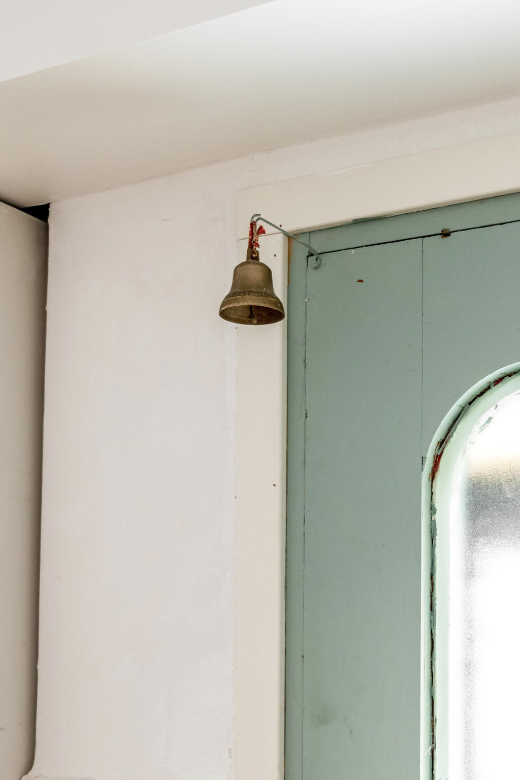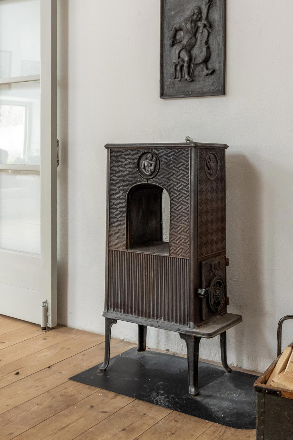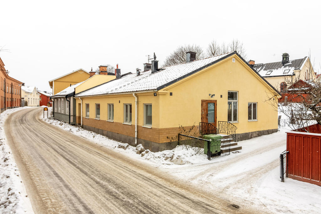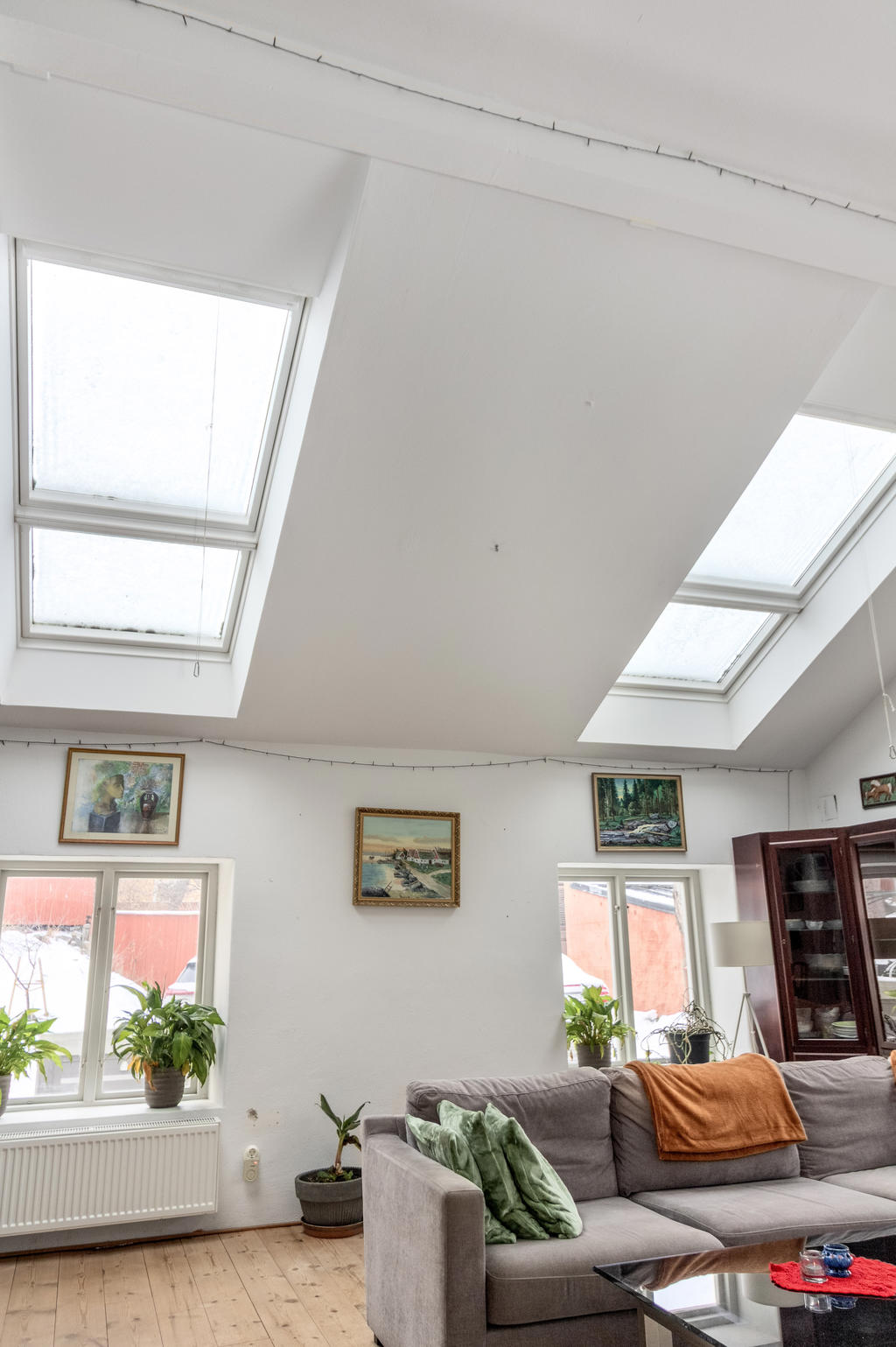 Entrén i norr, närmast gatan, leder in i en stor hall/allrum med gästtoalett och pardörrar in till vardagsrummet. Det 80 kvadratmeter stora vardagsrummet har en fantastisk rymd och utgör hjärtat av hela fastigheten. Takhöjden mäter 4 meter till högsta punkt och de 1 x 2 meter höga takfönstren ger ett magiskt ljus. Väggarna är murade, vitputsade och råa, och de djupa fönsternischernas bänkar inbjuder till att slå sig ner i de vackra originalfönstren med en bok. De gråmålade pardörrarna med glas öppnar upp mot allrum/hall och kök som inbjuder till sociala tillställningar och matlagning för många. För den matlagnings- och dryckesintresserade finns även ett riktigt kylrum. Breda norrländska furutiljor knyter ihop de generösa sociala ytorna, och på köksväggen har det vita kaklet fått leva kvar som minne från när byggnaden tjänade som pepparkaksbageri under 1900-talet. I köket finns en gatuentré, vars järngallerdörr är kvar sedan huset var antikvitetshandel. Från köket når man vidare trähuset.