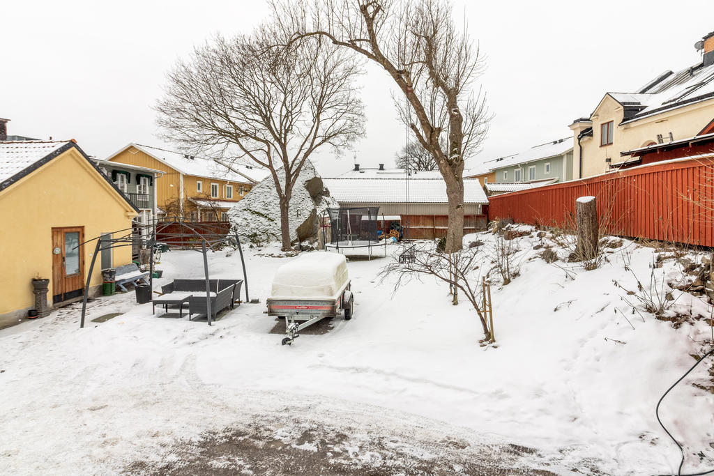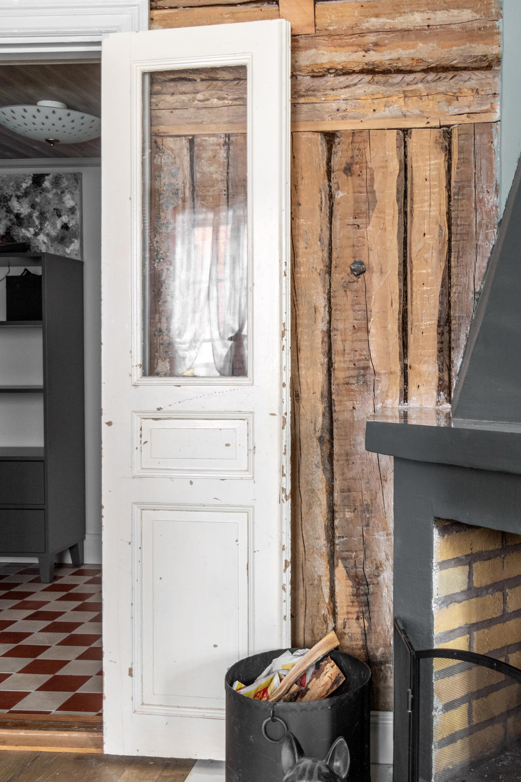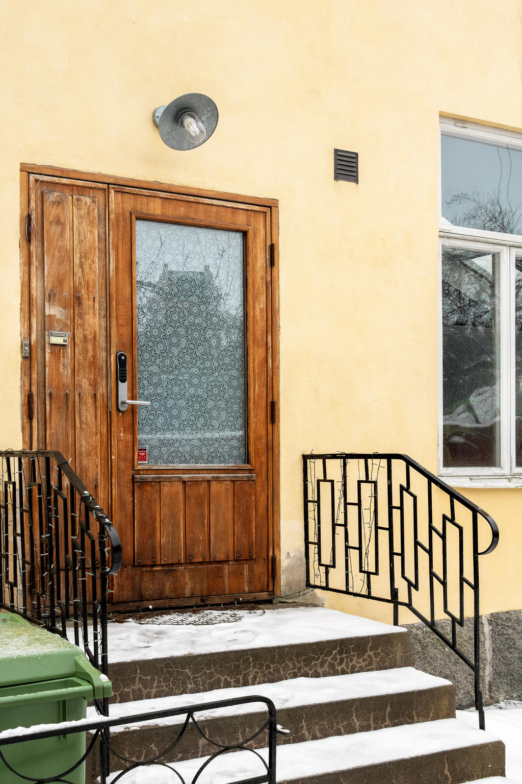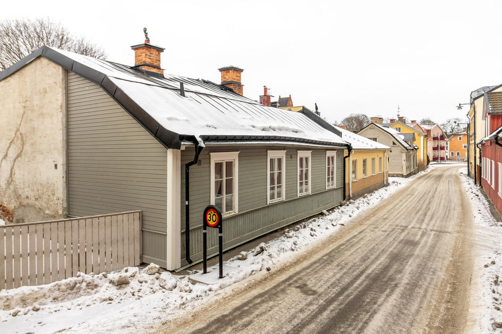 Till skillnad från det häftiga stenhuset som totalrenoverades för ca 15-20 år sedan är trähuset precis nyligen totalrenoverat. Exteriört har trähusets fasad, stomme och de vackra spröjsade fönstret renoverade av byggnadsvårdshantverkare. Al el, hela värmesystemet, vatten och avloppsstammar, samt hela bjälklaget har bytts ut, isolerats och vattenburen golvvärme har installerats i båda våningsplanen. Planlösningen har disponerats om och det vackra gamla trähuset har fått en separat lägenhet med egen ingång från gården. Materialvalen är påkostade och gedigna, och medvetet utvalda. Så långt som möjligt har gamla spegeldörrar, socklar och foder och även det rutiga Höganäsklinkret återbrukats av respekt för byggnadens arkitektur och historia. Det nylagda plankgolvet i vardagsrummet är handgjort av tjocka breda tiljor med träkilar, bitvis har den gamla timmerstommen plockats fram som en historisk fondvägg och färgvalen på väggar och snickerier är utvalda för att framhäva de kvarvarande snickerierna från 1800-talet.