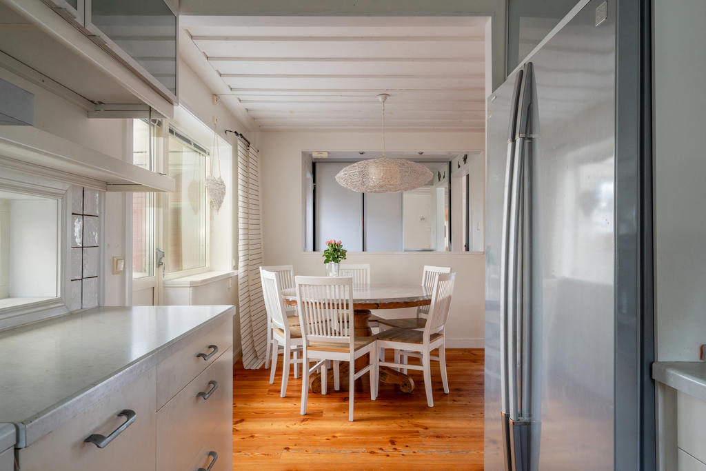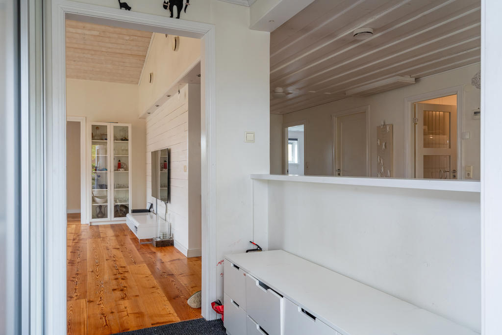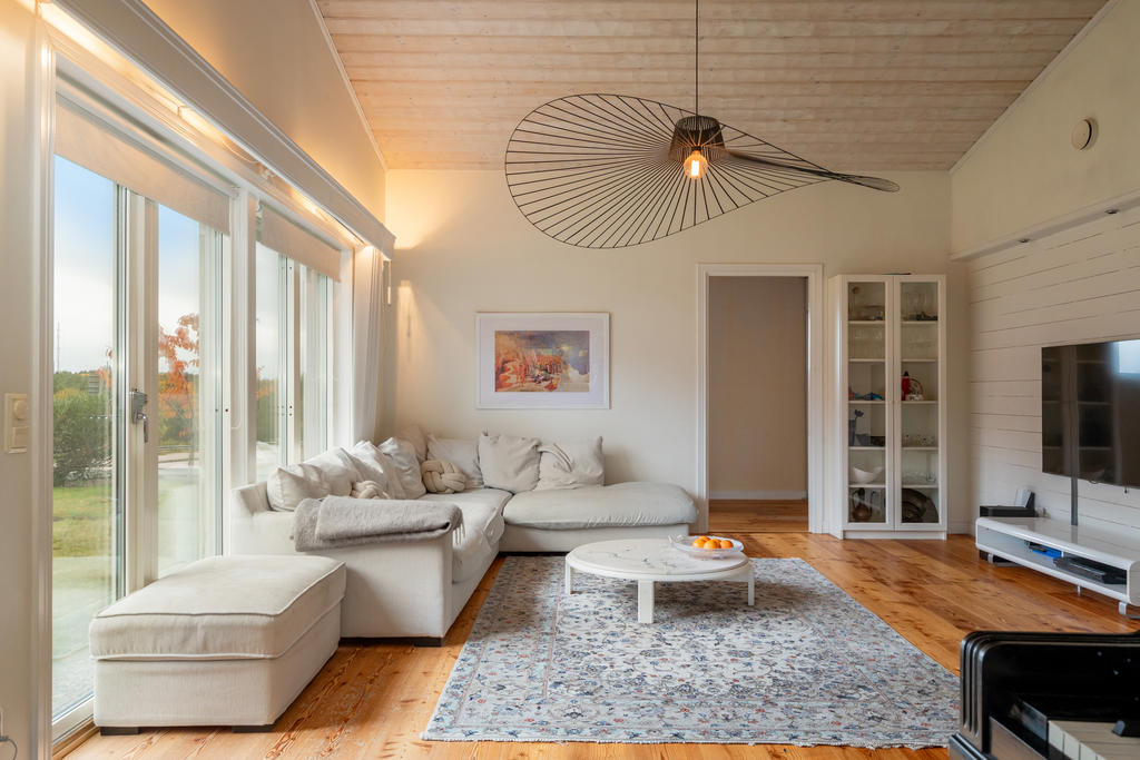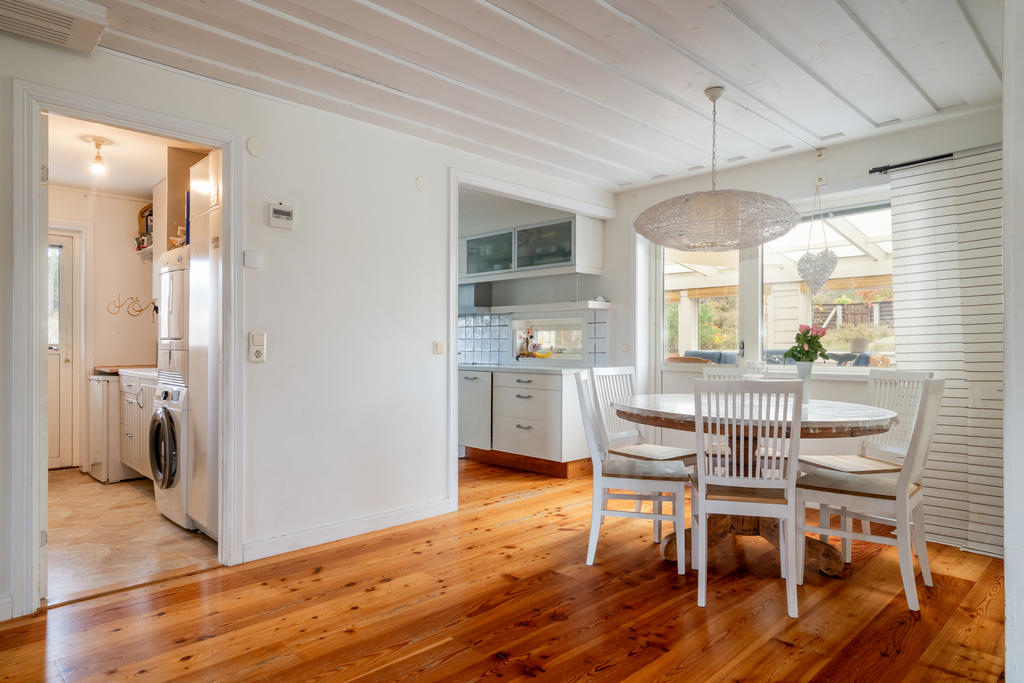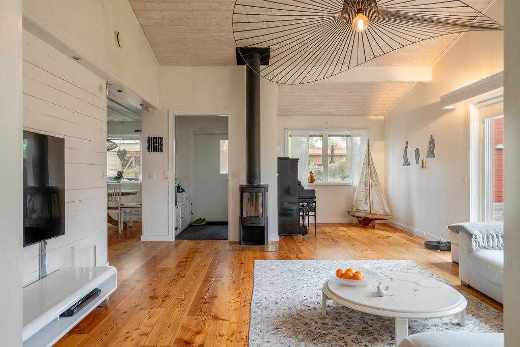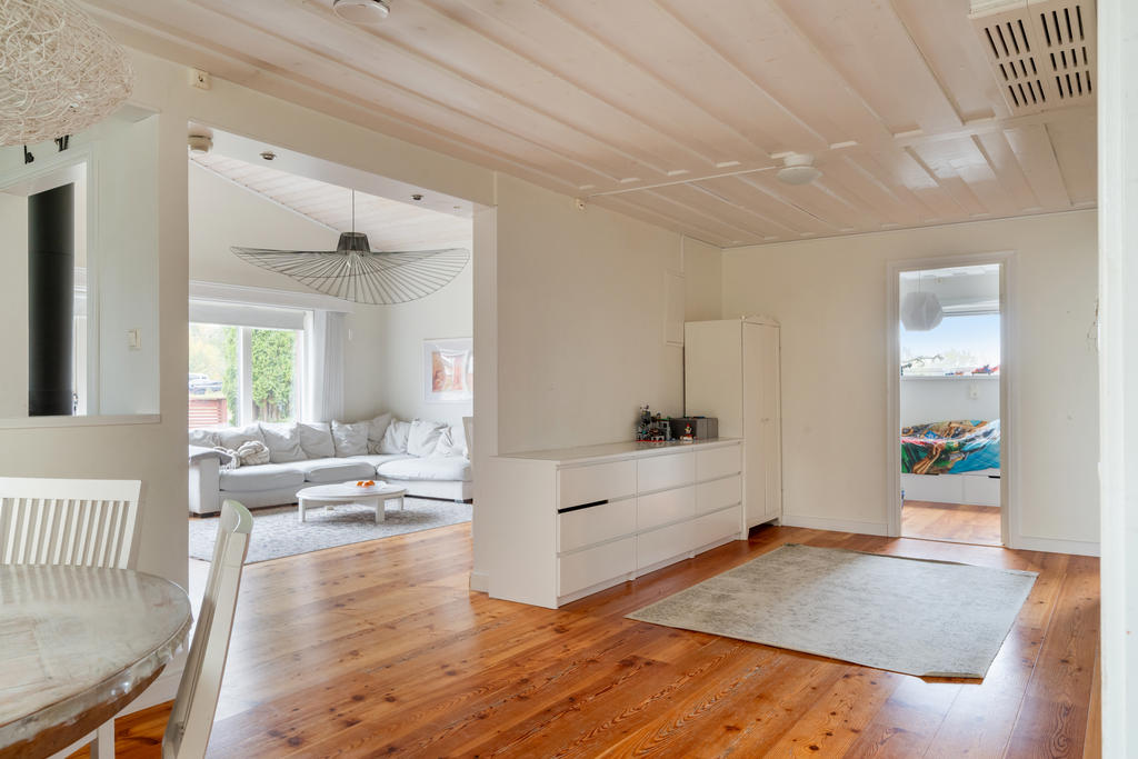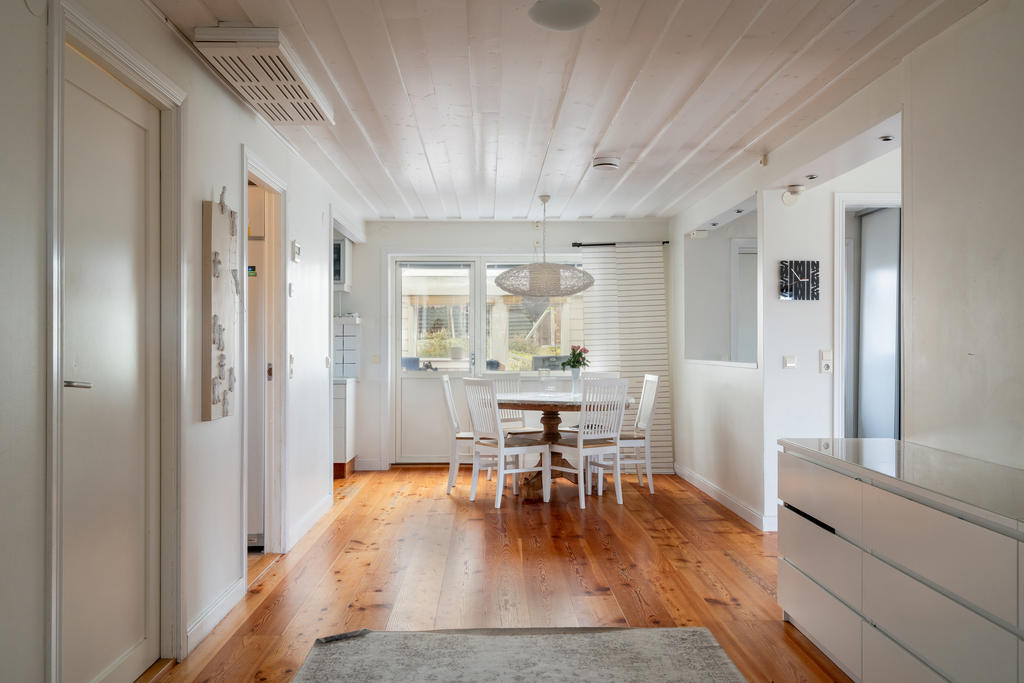 Bostaden välkomnar med en inbjudande entréhall med praktisk skjutdörrsgarderob i full höjd. Härifrån nås det generösa vardagsrummet med fönster i två väderstreck och en härlig takhöjd upp till nock som skapar rymd och en luftig känsla. I anslutning finns matplats och kök – en naturlig samlingspunkt för familj och vänner.