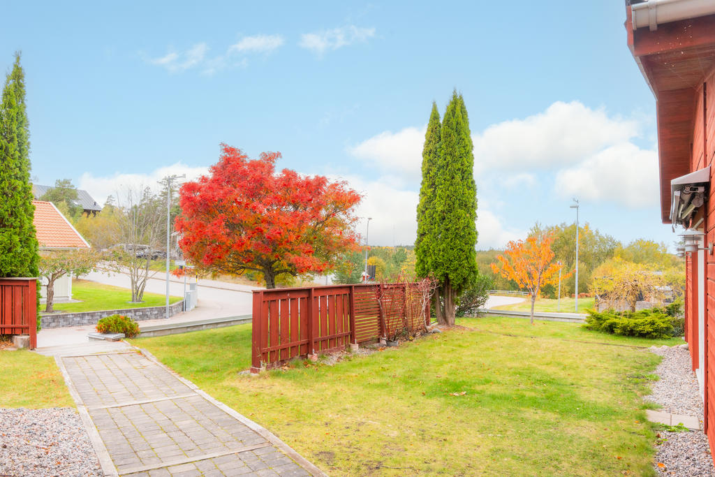 Tomten om 1 015 kvm är friköpt och ligger i soligt hörnläge. Här finns plana gräsytor, välskötta planteringar, träd och buskar som tillsammans med mur och staket skapar en grön och insynsskyddad inramning. Baksidans bergsparti ger trädgården en karaktäristisk och charmig inramning.