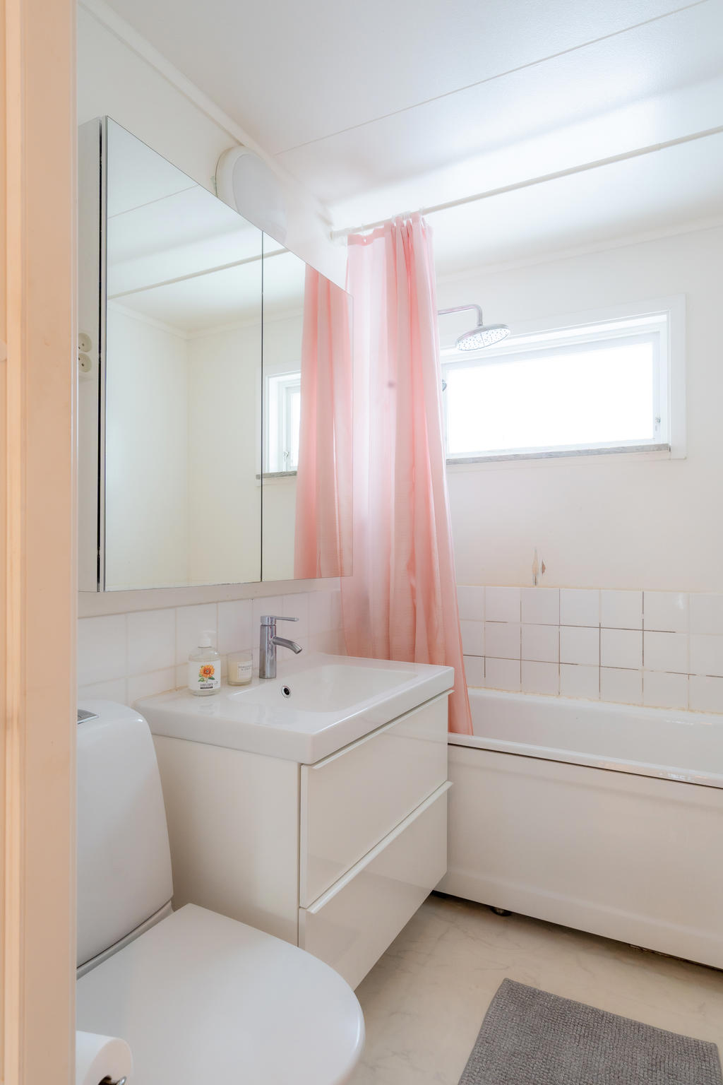 Köket har högblanka vita skåpluckor och integrerade vitvaror. Det röda mosaikkaklet är en kontrast till det vita. I köket finns en bra matplats för familjen och med access till ytterligare en utgång via altandörrar till uteplatsen på baksidan. Innanför köket ligger tvättutrymmet och via detta nås det som tidigare varit förråd med groventré. Här har nuvarande ägare renoverat och gjort om till ett rymligt gästrum som annars kan användas som tex extra sovrum om ni har en ungdom i huset eller kanske som arbetsplats för dig som jobbar hemifrån. Från gästrummet finns dörr som leder till garaget. Här är även egen utgång till baksidan via altandörrar, dörr in till mindre klädkammare/skafferi och en egen praktisk ingång från framsidan.