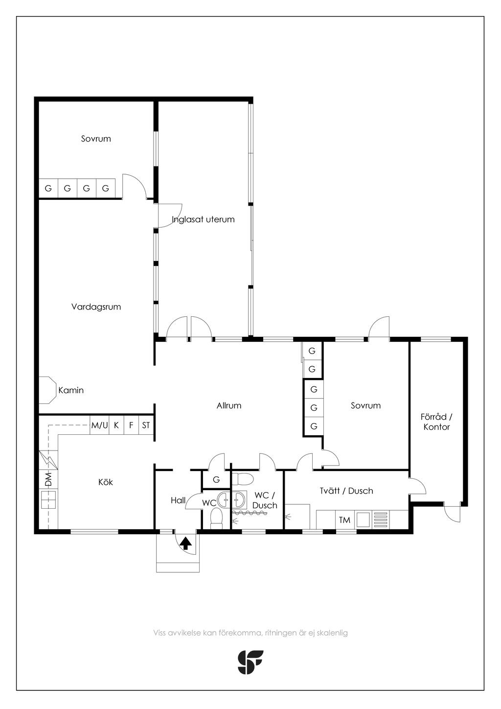 Genom att förvandla förrådet vid groventrén och sätta upp en vägg i det som idag är ett öppet allrum/inre hall kan man få totalt 4 sovrum i denna bostad.