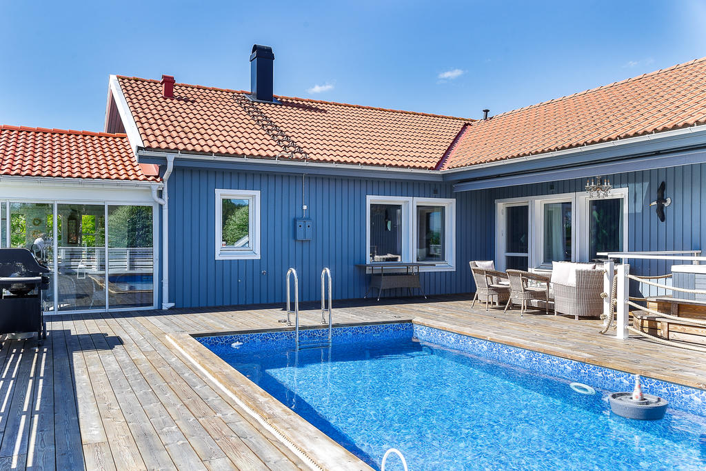 Välplanerad enplansvilla med pool, bastu, båtplats och härliga sociala ytor – familjedröm!