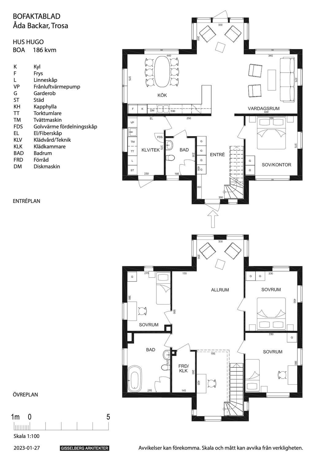 En inbjudande och välgenomtänkt tvåplansvilla där planlösningen smart förenar rymd och funktionalitet. Man kommer in i en ljus hall där trappan till övervåningen är placerad direkt till höger. Hallen leder vidare till en öppen och social yta där kök, matplats och vardagsrum flätas samman på ett naturligt sätt. Stora fönsterpartier ger ett härligt ljusinsläpp och skapar en inbjudande känsla. Den öppna takhöjden förstärker intrycket av rymd och gör det till en trivsam plats för både vardag och fest.