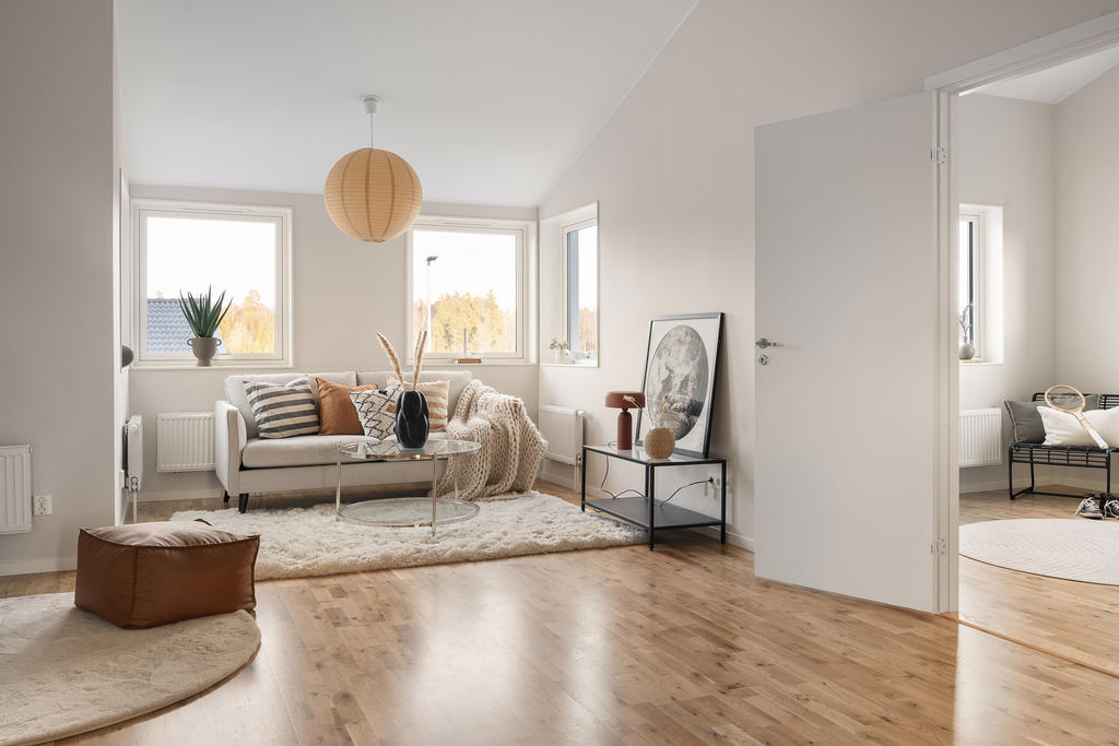 Vardagsrummet har en altandörr som leder ut till trädgården, vilket ger en naturlig koppling mellan inne och ute. Möjligheten att skapa en personlig uteplats gör att området lätt kan anpassas efter säsongens aktiviteter.