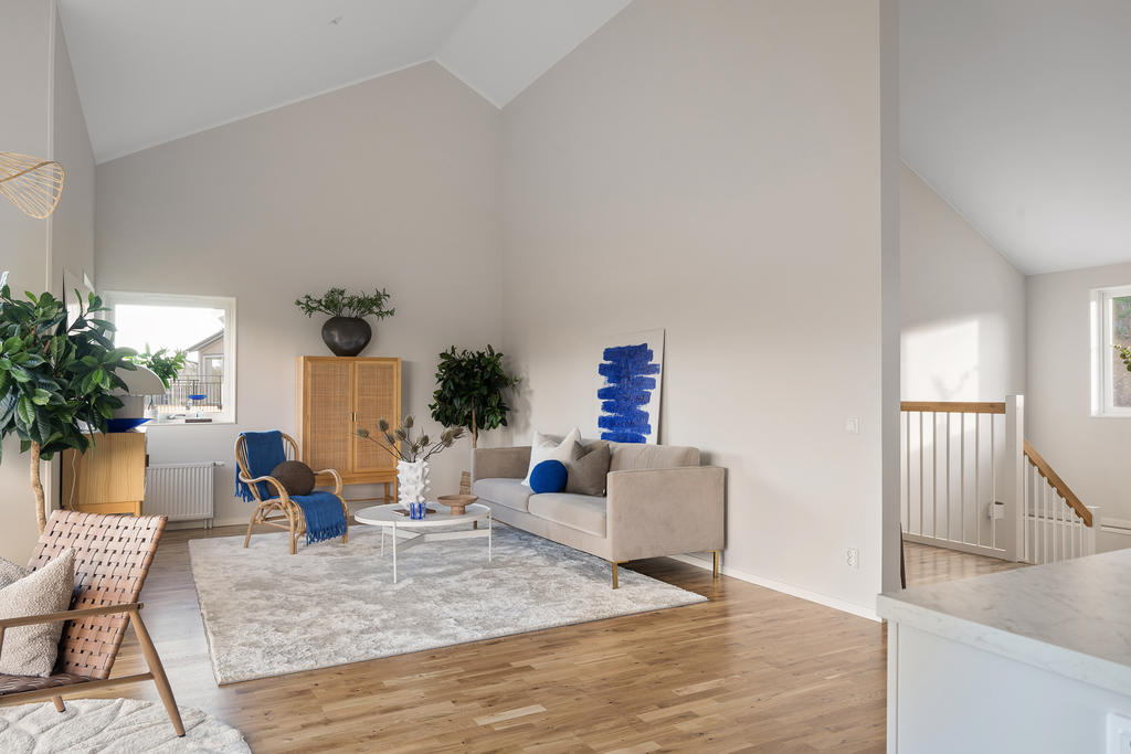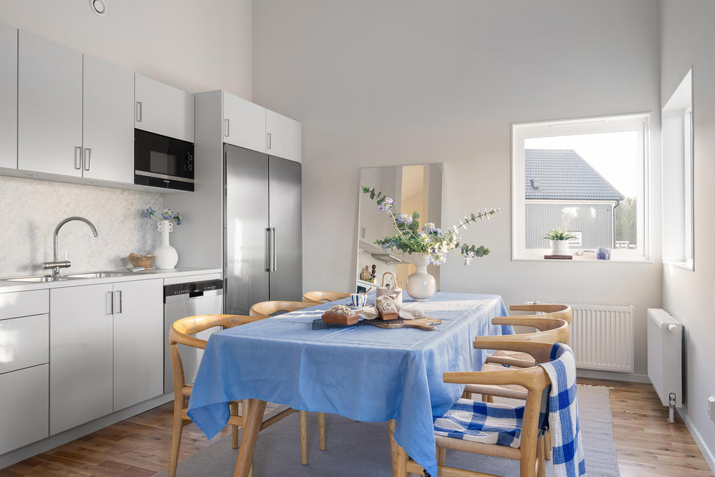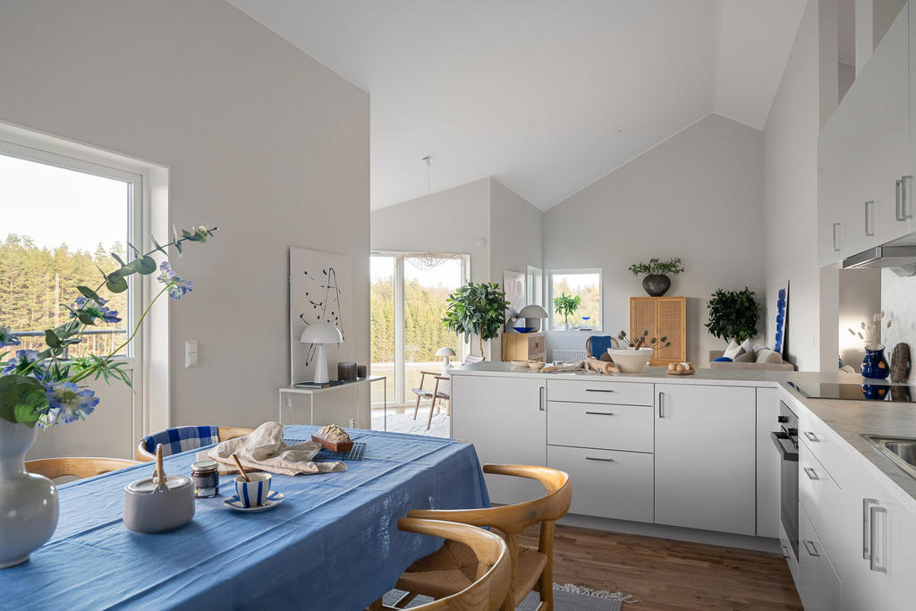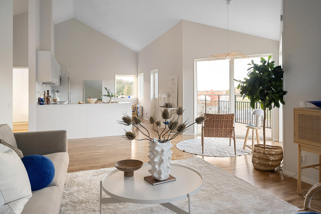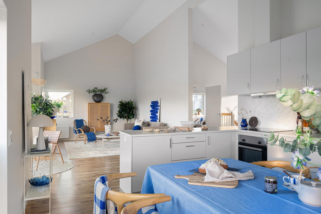 Entrén leder vidare till ett stort, öppet rum som kombinerar kök med matplats och vardagsrum. Här är det öppet upp till nock, och de stora fönstren ger ett härligt ljusinsläpp som förstärker känslan av rymd och öppenhet. Från matplatsen kommer du ut på en stor balkong med plats både för matbord och solmöbler.