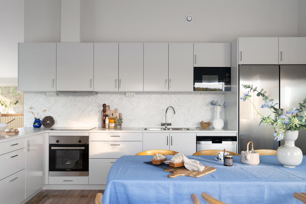 Köket, med modern inredning från Ballingslöv och vitvaror från Siemens, har generösa arbetsytor och gott om plats för både matlagning och umgänge. Köksbaren fungerar som en naturlig samlingsplats, och från den enorma balkongen har du en magnifik utsikt över landskapet.