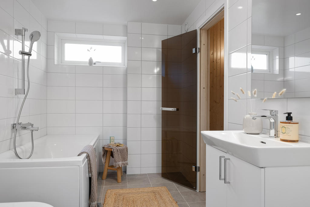 Här hittar du även ett rymligt badrum och en stor bastu för avkoppling, samt en praktisk klädkammare för extra förvaring och ett teknikrum. Från allrummet har du direkt utgång till trädgården, vilket ger enkel tillgång till utomhusmiljön och skapar ytterligare ytor för avkoppling och umgänge.
