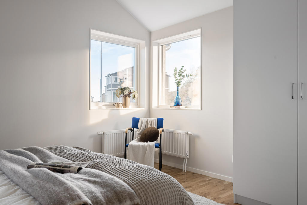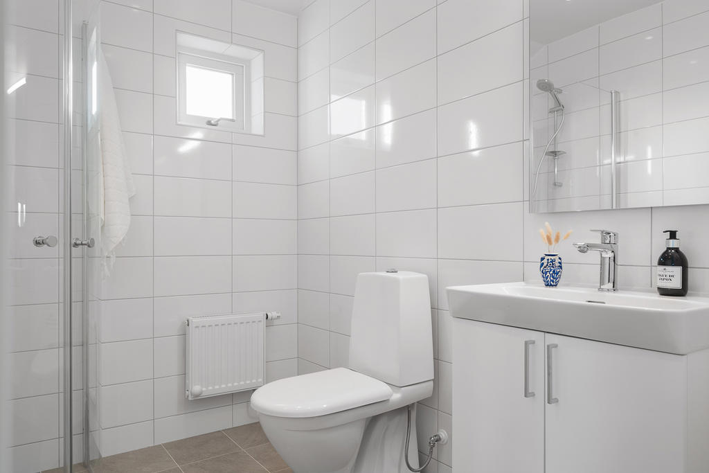 Huset har genomgående praktiska lösningar för komfort och energieffektivitet. Vattenburen golvvärme i bottenplattan skapar en jämn och behaglig värme på det nedre planet medan radiatorer på övervåningen ger ett balanserat inomhusklimat.