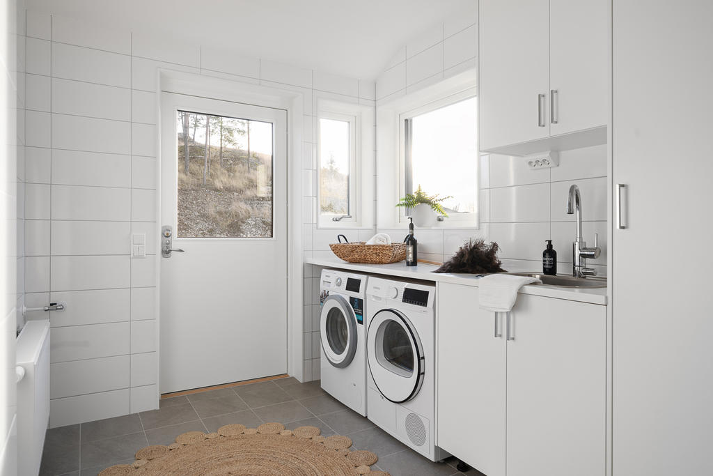 Till vänster ligger ett badrum följt av en tvättstuga/teknikrum med groventré, praktiskt för den som vill kunna hänga tvätten utomhus eller använda som ingång för smutsiga stövlar eller tassar. Här finns tvättmaskin och torktumlare från Siemens.
