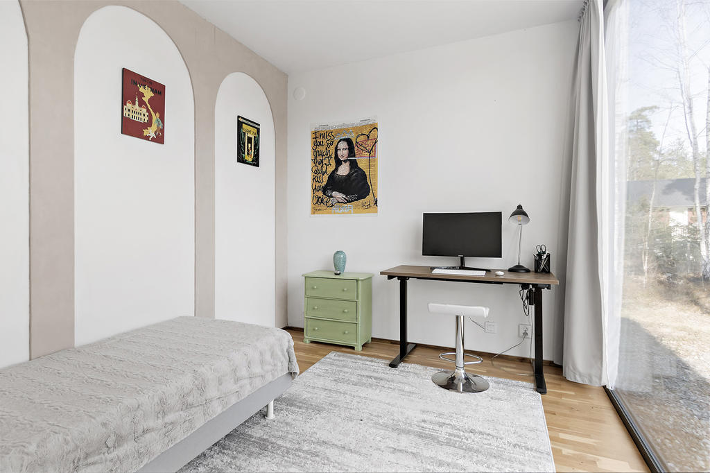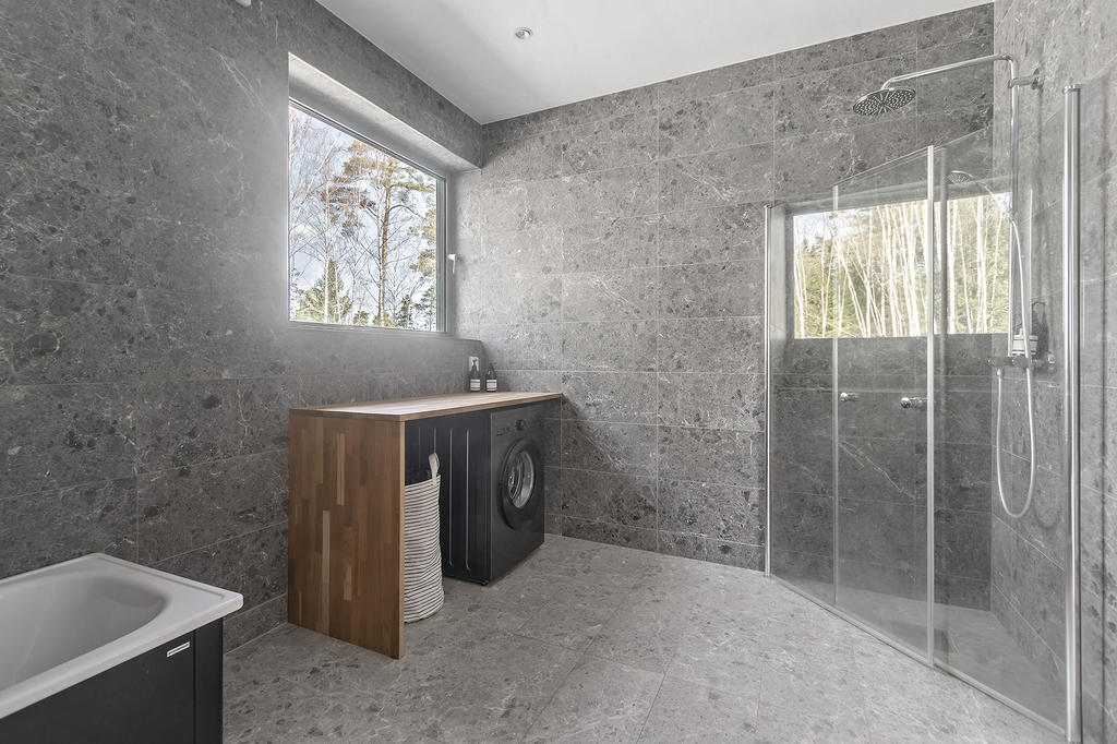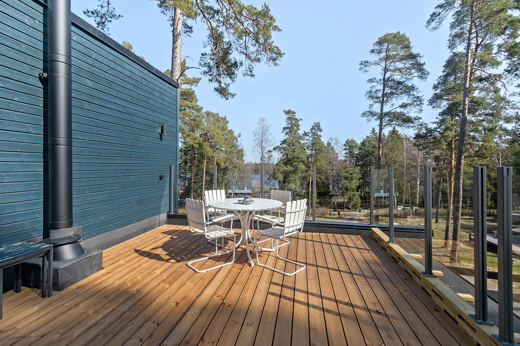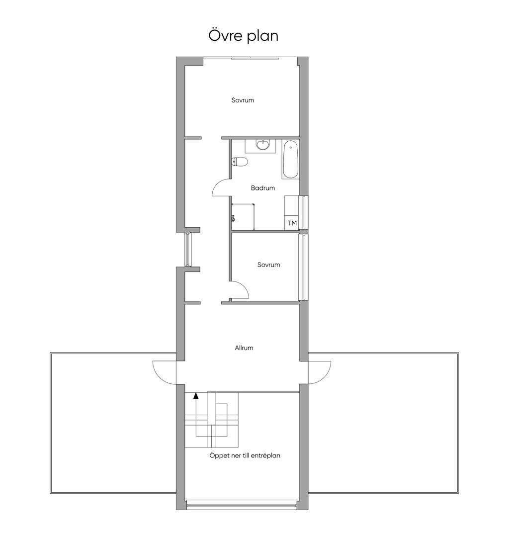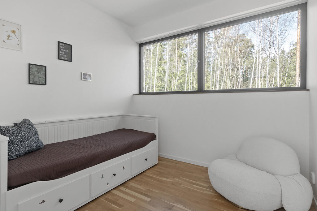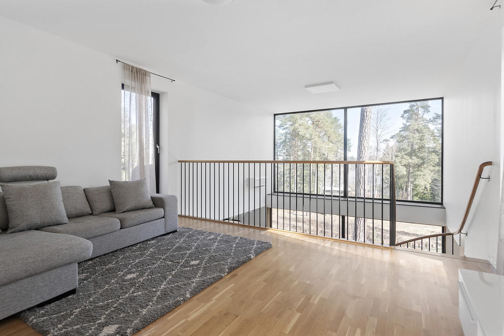 En elegant trappa leder upp till övre plan där ett luftigt TV-rum har utgång till en takterrass med glasräcke och erbjuder sol från morgon till sen eftermiddag. Det finns även möjlighet att utforma ytterligare en takterrass. Via en ljus korridor med takfönster och en platsbyggd läsalkov nås ett rymligt sovrum, ett stort badrum med tvättavdelning samt bostadens master bedroom. Här finns ett stort öppningsbart glasparti som vetter mot skogen och skapar en rogivande utsikt över naturen.
