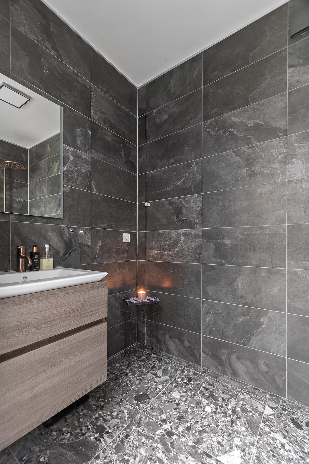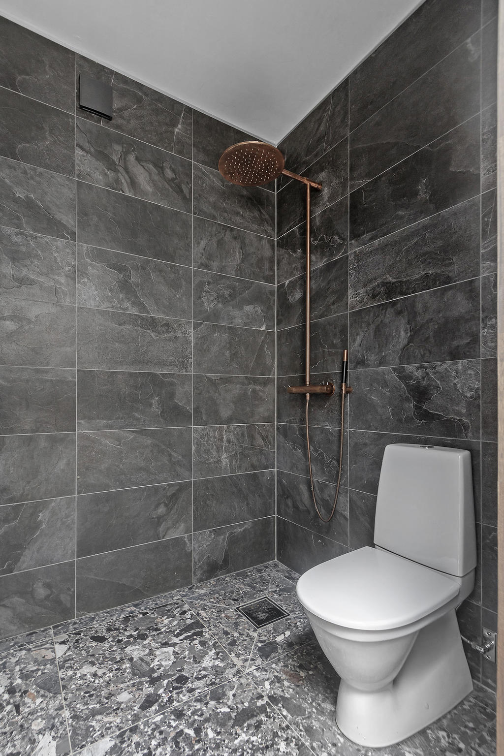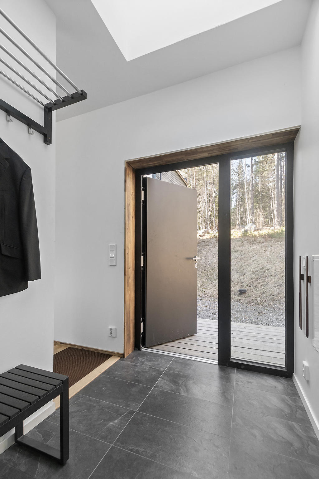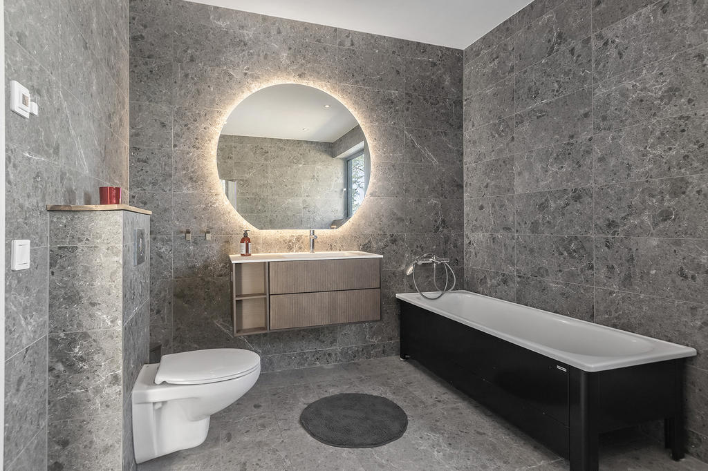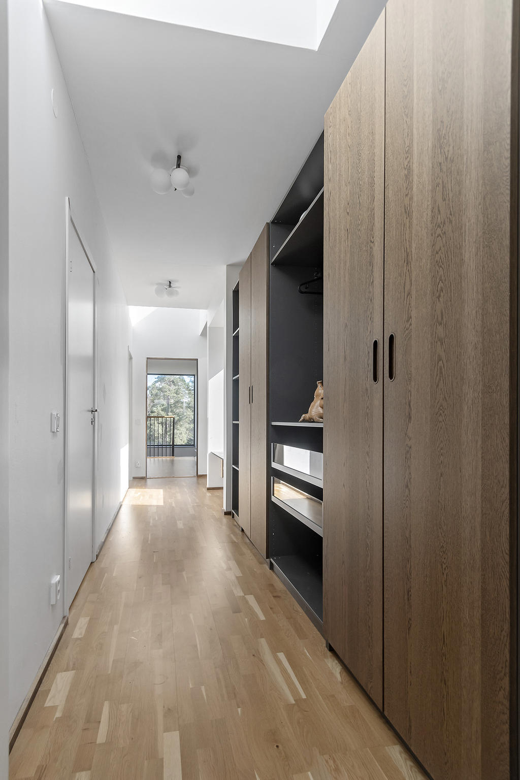 En elegant trappa leder upp till övre plan där ett luftigt TV-rum har utgång till en takterrass med glasräcke och erbjuder sol från morgon till sen eftermiddag. Det finns även möjlighet att utforma ytterligare en takterrass. Via en ljus korridor med takfönster och en platsbyggd läsalkov nås ett rymligt sovrum, ett stort badrum med tvättavdelning samt bostadens master bedroom. Här finns ett stort öppningsbart glasparti som vetter mot skogen och skapar en rogivande utsikt över naturen.