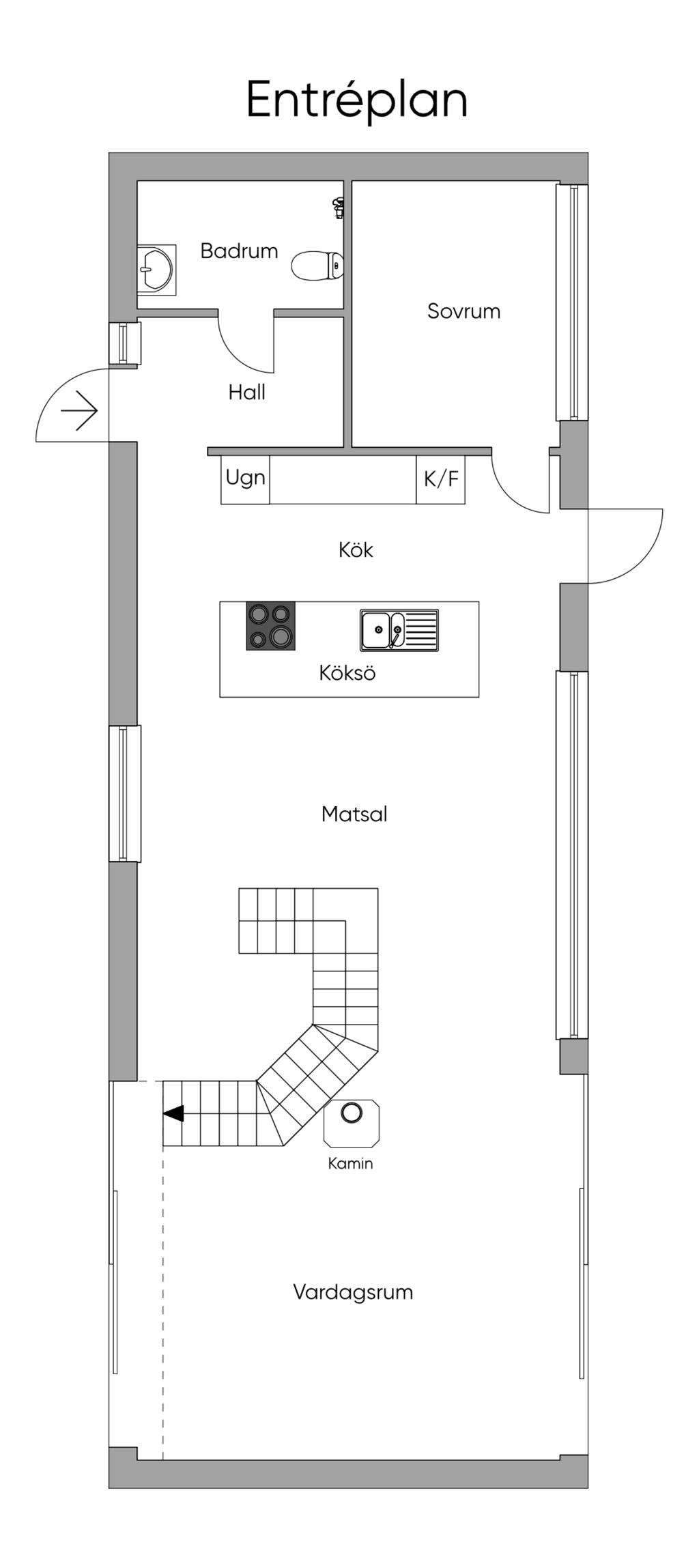 Entréplanet välkomnar med en ljus hall där ett takfönster ger ett naturligt ljusinsläpp. Här finns ingång till ett stilrent badrum samt ett stort vardagsrum och kök i öppen planlösning. I rummets mitt står en kamin som blir en naturlig samlingspunkt. På detta plan finns även ett sovrum/kontor med direkt utgång till terrassen mot sjösidan.