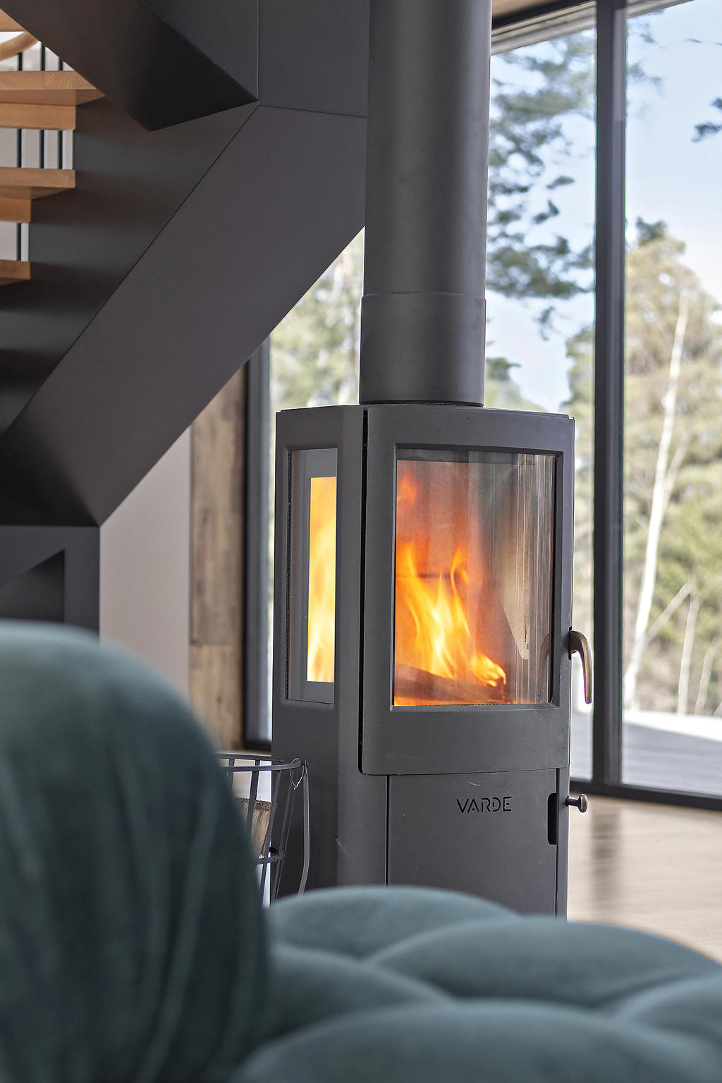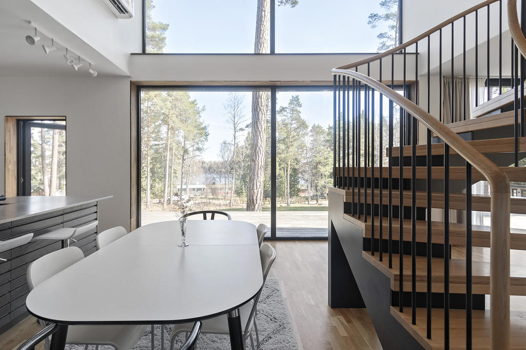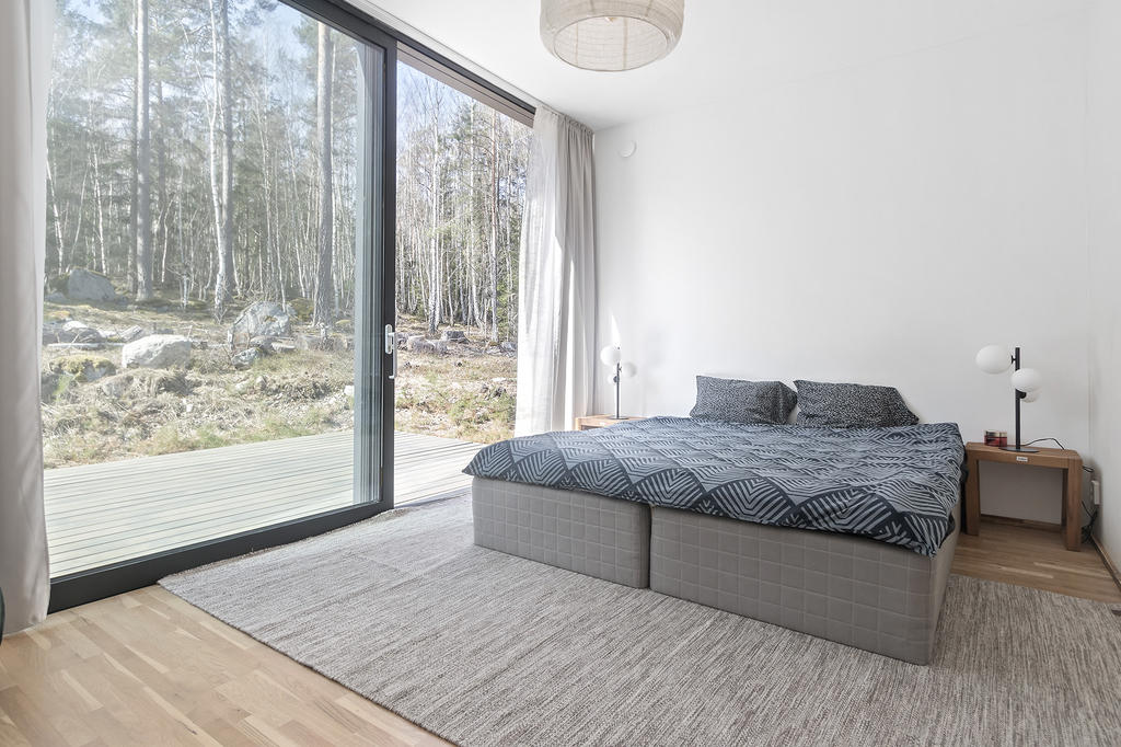Byggnaden vilar på en kraftfull stålram som möjliggör den vackra konstruktionen med stora obrutna glaspartier och den karakteristiska “fly-over”-känslan. De exklusiva glaspartierna från Schüco suddar ut gränsen mellan inne och ute och kan sommartid öppnas upp helt mot naturen. Golvet fortsätter sömlöst ut i den kringliggande verandan utan trösklar, vilket skapar en naturlig övergång mellan bostad och uteplats.