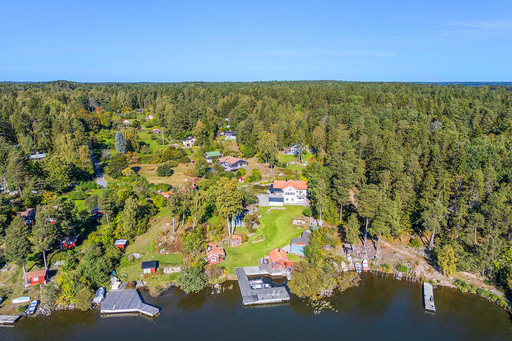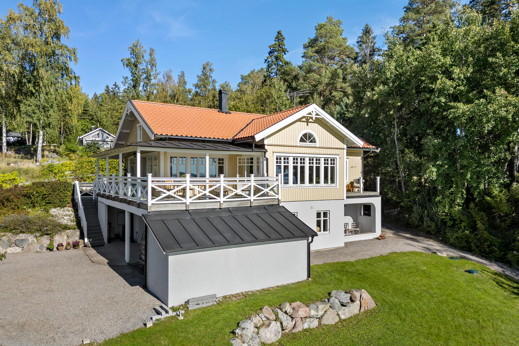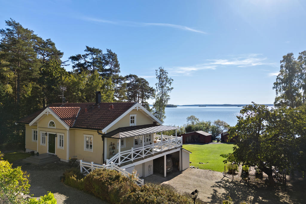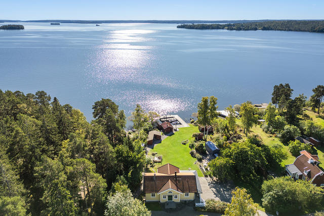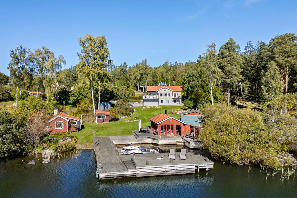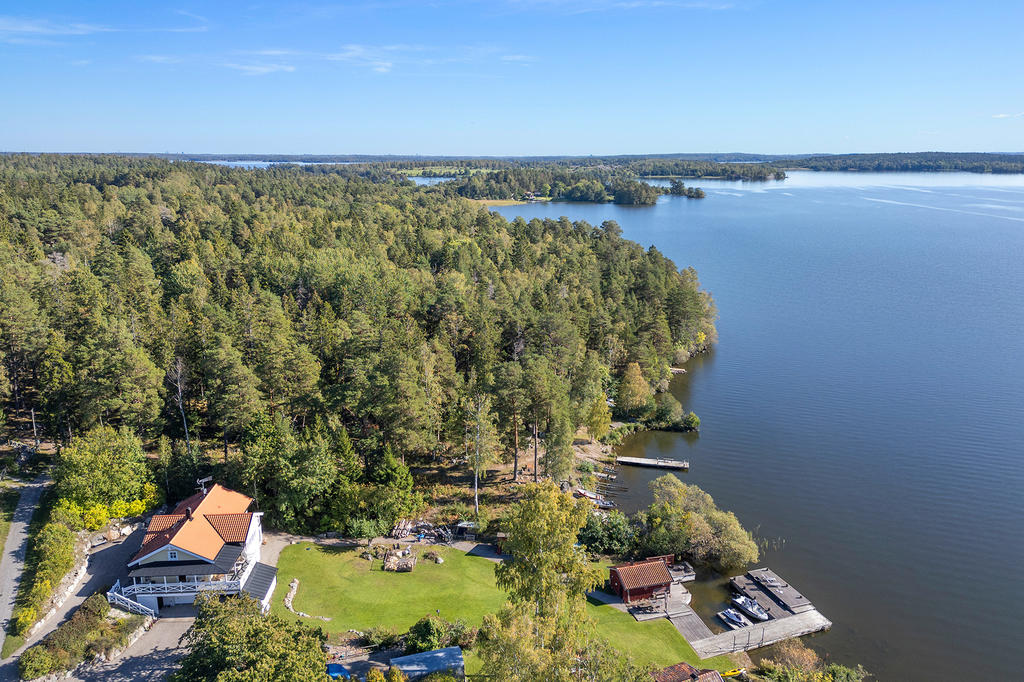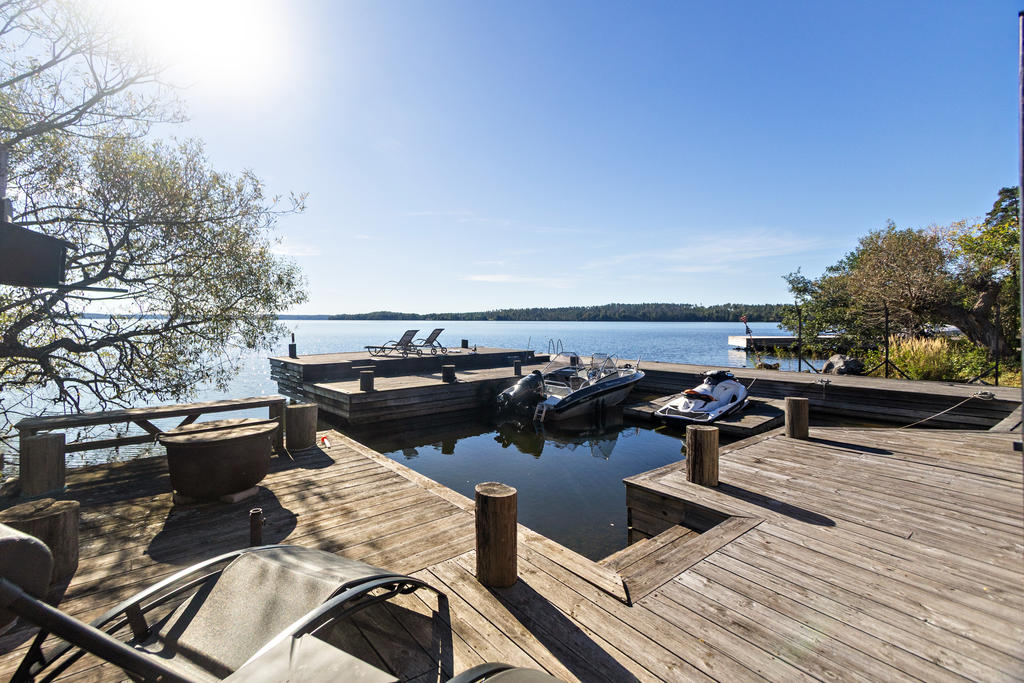 Sjöutsikt från alla rum, och känslan av att ha en egen strand och en stor brygganläggning som inbjuder till sol, bad och lek. Ett aktivt båtliv, fiske eller en lugn yoga stund.