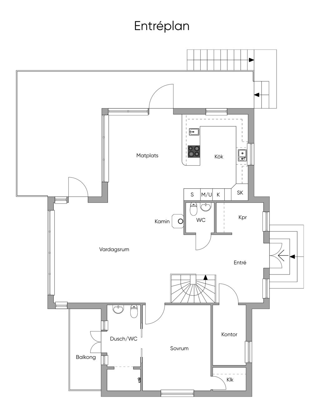 Härlig rymd i vardagsrummet med öppet upp till nock. Luftig planlösning med öppet mellan vardagsrum, matrum och ett gediget kök i vinkel. Här ryms många. Centralt placerad eldstad. Altandörrar som ger access till en inbjudande trädäckad altan under skyddande tak. En rofylld miljö att landa i.