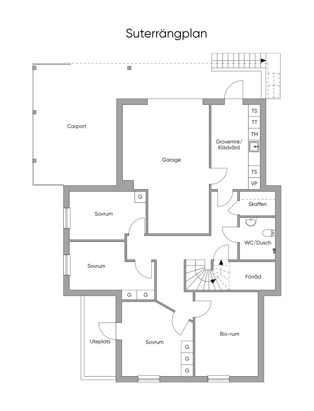 En trappa ner nås ett luftigt souterängplan med fullhöjdsfönster och 2,75cm i takhöjd. Anpassningsbara rum att bruka efter behov, tre som passar utmärkt som sovrum och ett fjärde som idag brukas som biorum. Vidare finns förråd, dusch/wc, skafferi, tvättstuga samt groventré. Access till garage.