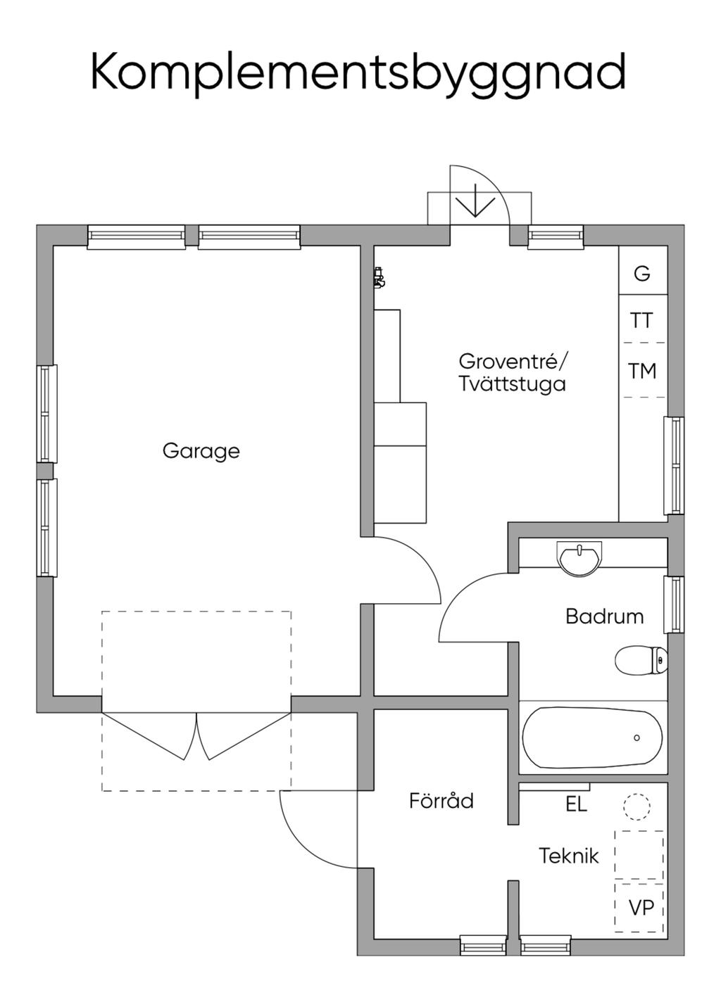 Det andra huset är en modern komplementsbyggnad, uppförd 2010. Här finns en groventré kombinerad tvättstuga. Ett rymligt badrum. Möjligt garage som idag nyttjas främst som förråd.