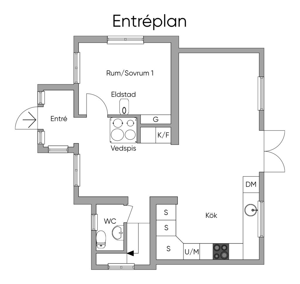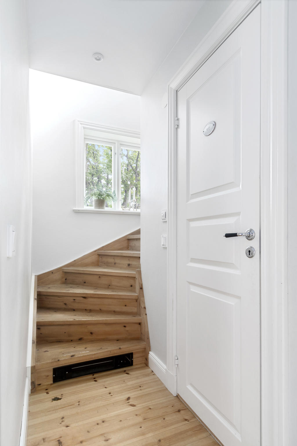 På entréplan finns inbjudande sällskapsytor, ett stort kök med utgång till den trädäckade altanen. Altanen upplevs sommartid som ett värdefullt extrarum, med en känsla av total avskildhet. I de lättillgängliga pallkragarna kan man odla grönsaker och kryddor. Vidare på entréplan finns ett fint rum att bruka efter behov samt en wc.