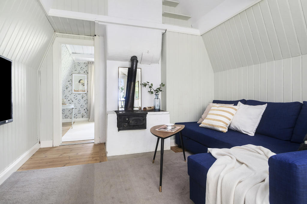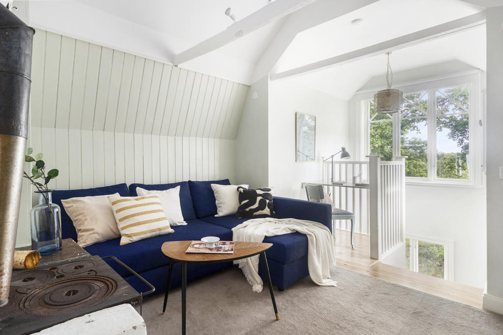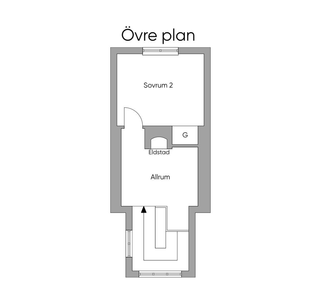 På övre plan återfinns ett härligt allrum, luftig rymd med öppet upp till nock. Idag nyttjas rummet främst som kontor och tv-rum. Fantastisk vy genom trapphusets fina fönsterpartier, utsikten ger intryck av en levande tavla, högt läge och utsikt över åkrar som förändras med årstiderna. Innanför allrummet finns ett tilltalande sovrum.