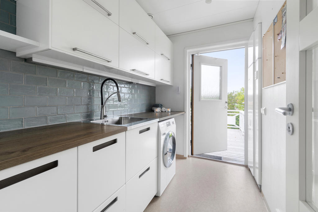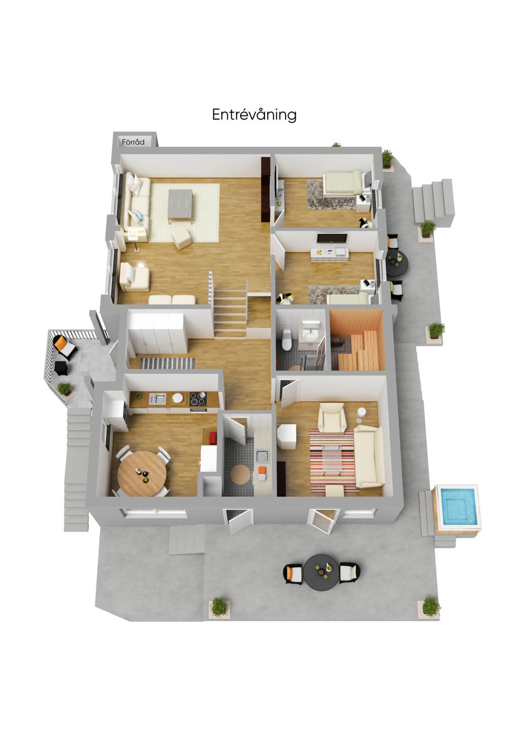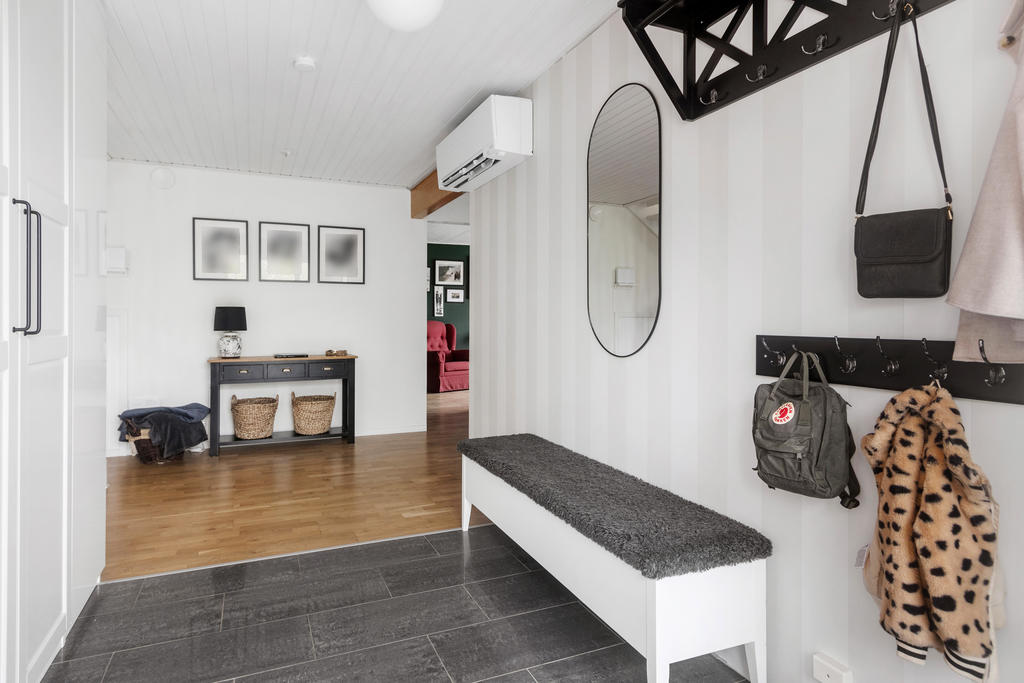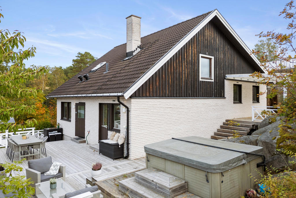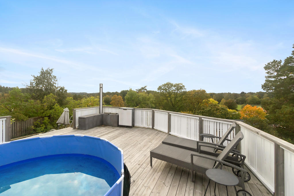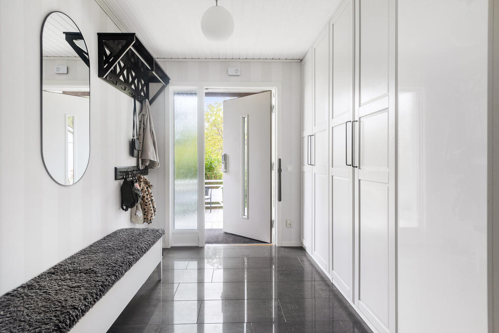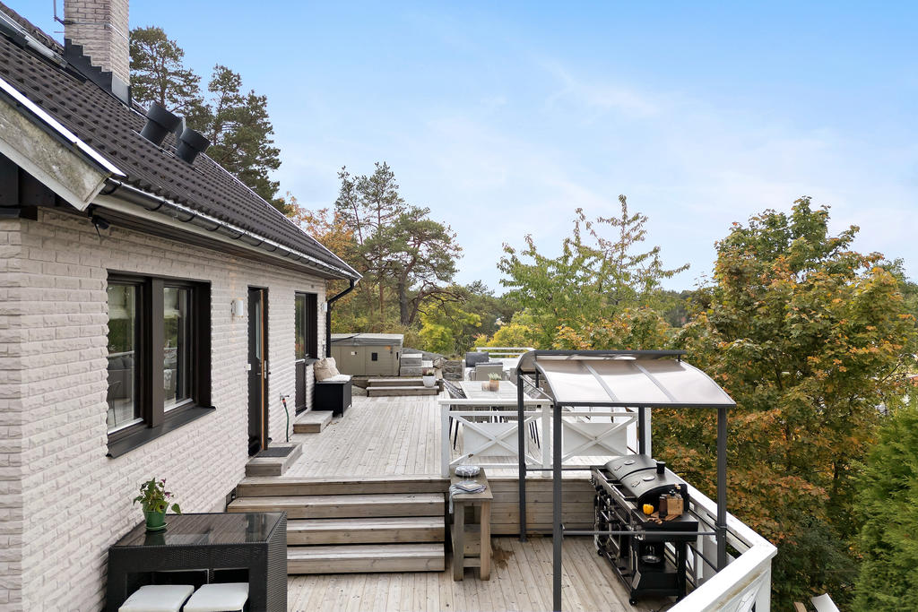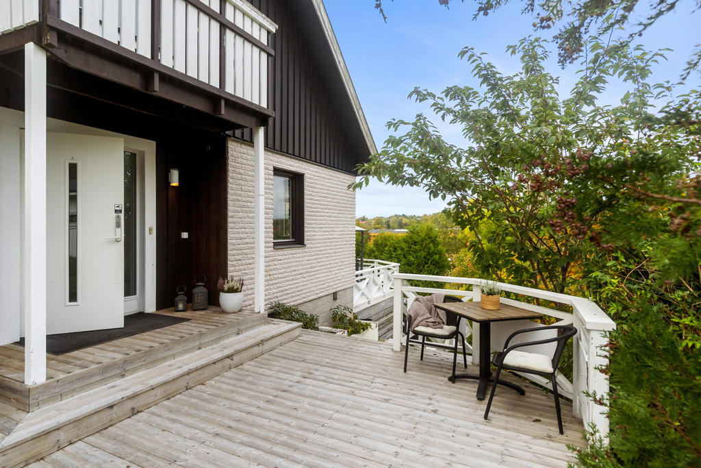 Längs husets entrésida breder ytterligare en fantastisk altan ut sig, med plats för loungemöbler, matbord och grill. Här är det lätt att skapa sommarminnen – oavsett om du kopplar av i spabadet eller samlar familj och vänner till middagar under bar himmel. Intill entrén finns även en mindre uteplats – en perfekt plats för morgonkaffet i solen.