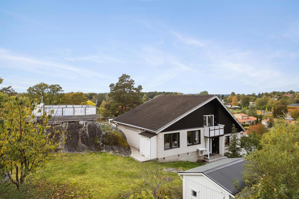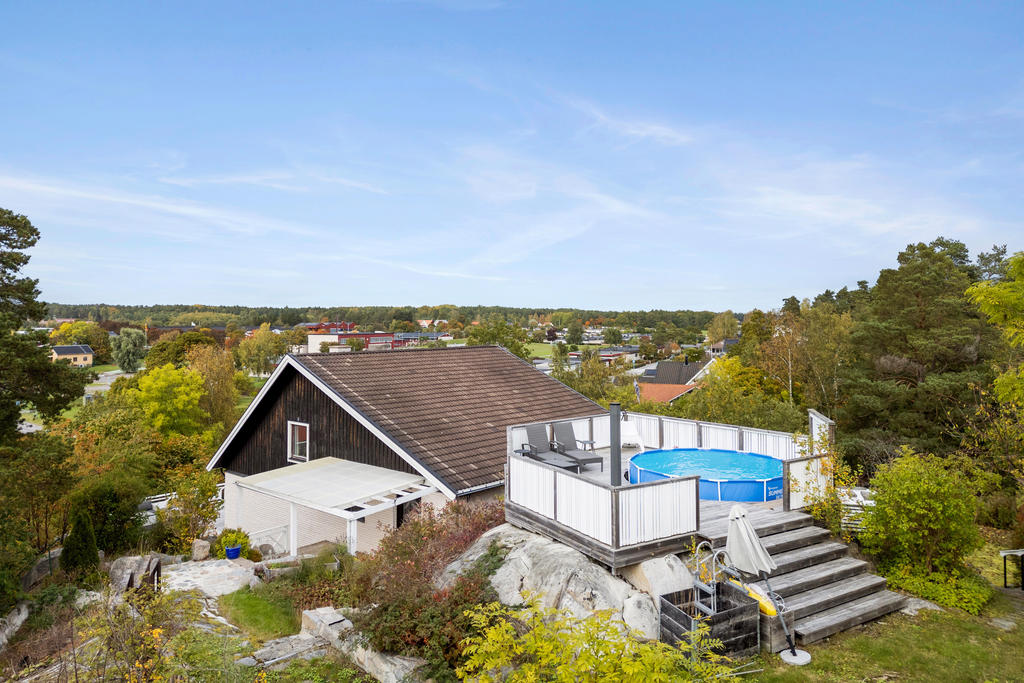 Utemiljön är något alldeles extra. Den insynsskyddade och uppvuxna trädgården är med härliga höjdskillnader, blommande planteringar och medelhavskänsla. Här växer bland annat blåbär, björnbär, bigarråer och japanska körsbärsträd – vackert inramat av grönska och blomsterprakt. På tomtens högsta punkt hittar du en solterrass med sol hela dagen, en utedusch samt samt plats för en ovanmarkspool – en idealisk plats att njuta av avskildhet, utsikt och magiska solnedgångar.