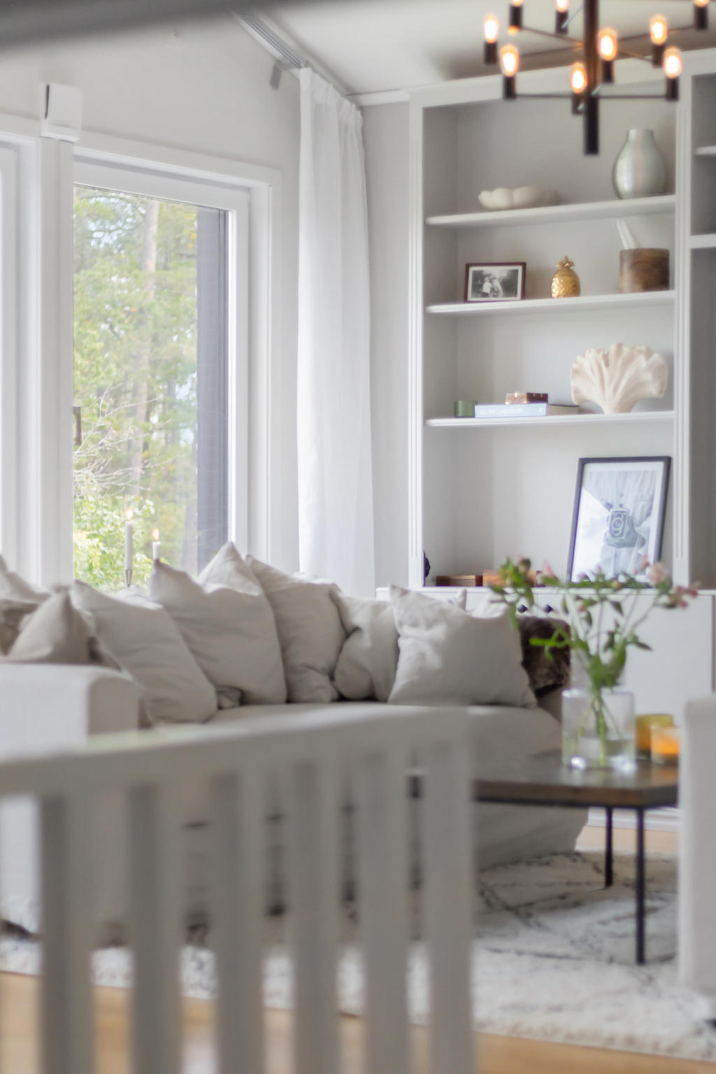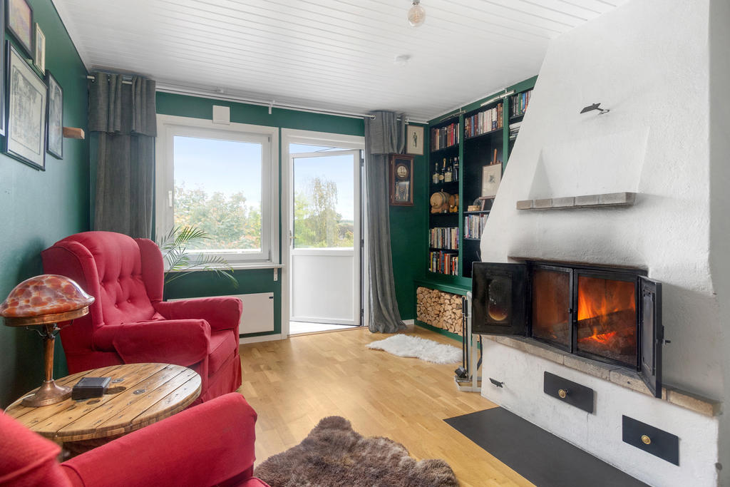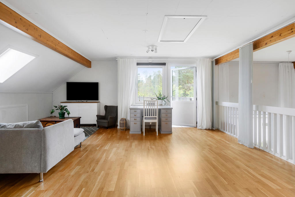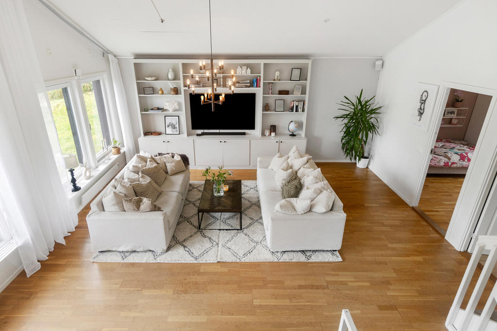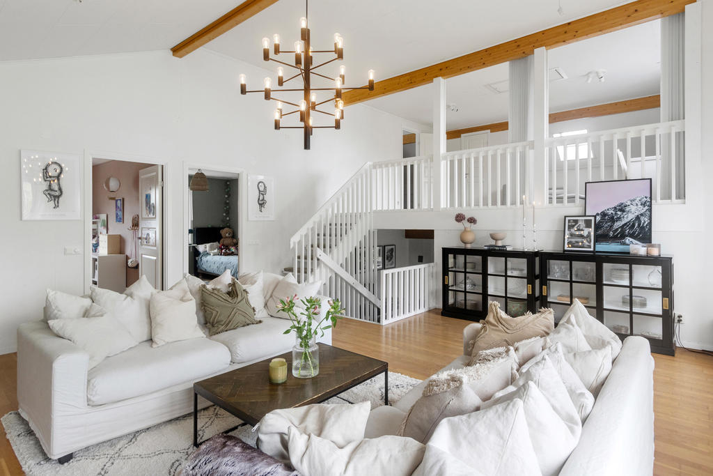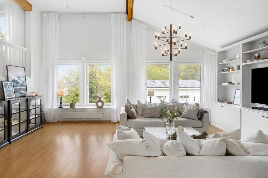 Huset erbjuder generösa sällskapsytor på samtliga plan, där vardagsrummet är hemmets naturliga hjärta med sin imponerande takhöjd och stora fönsterpartier som släpper in ljus från flera väderstreck. Härifrån har du utblick över både omgivningen och de inre etageplanen, vilket skapar en öppen och social atmosfär.