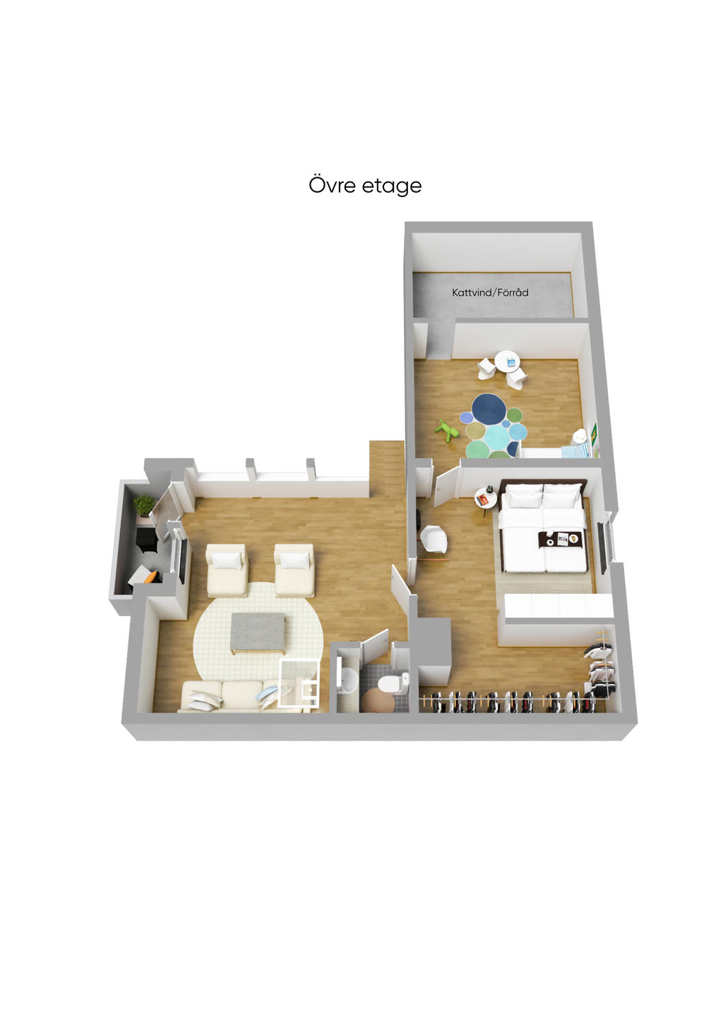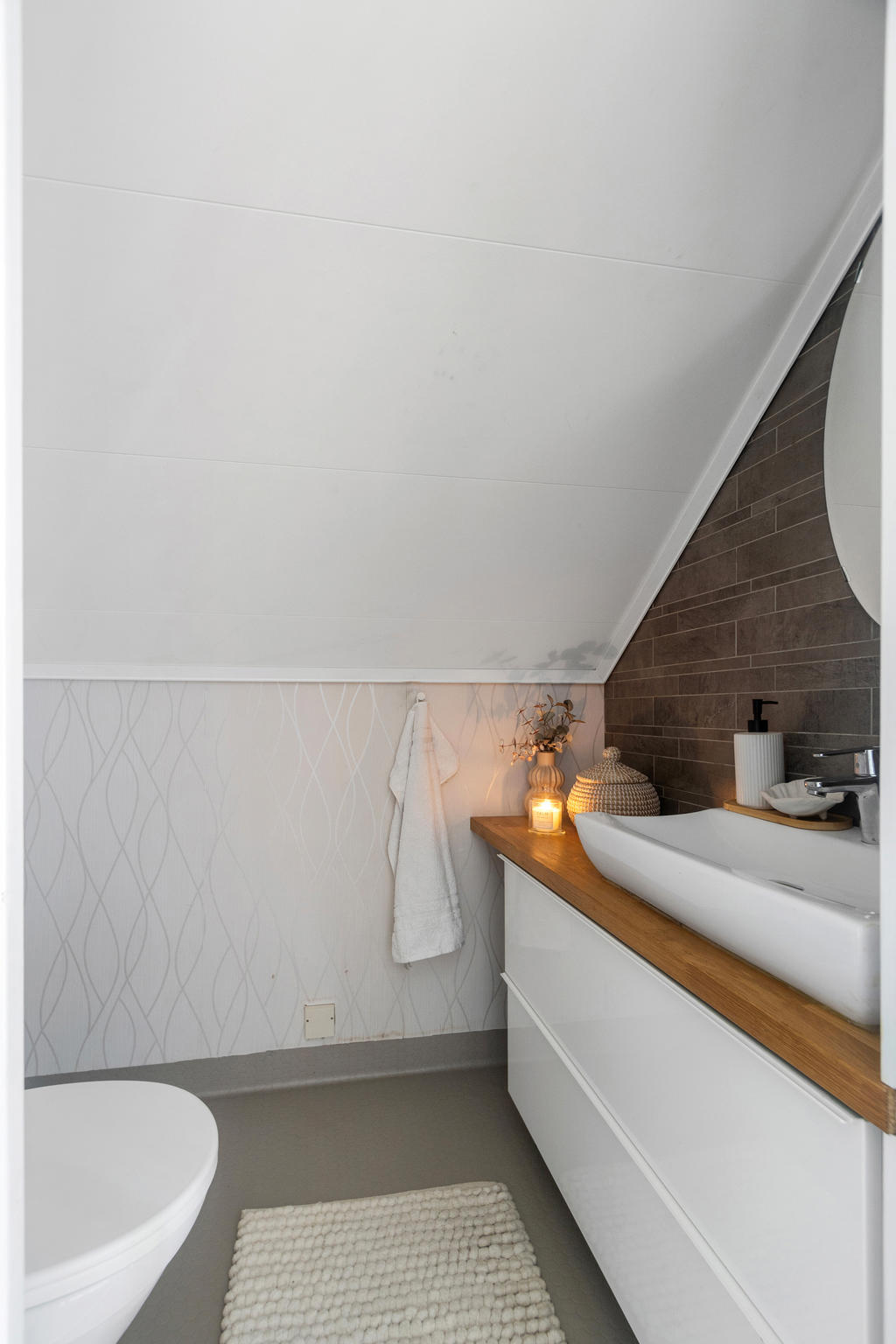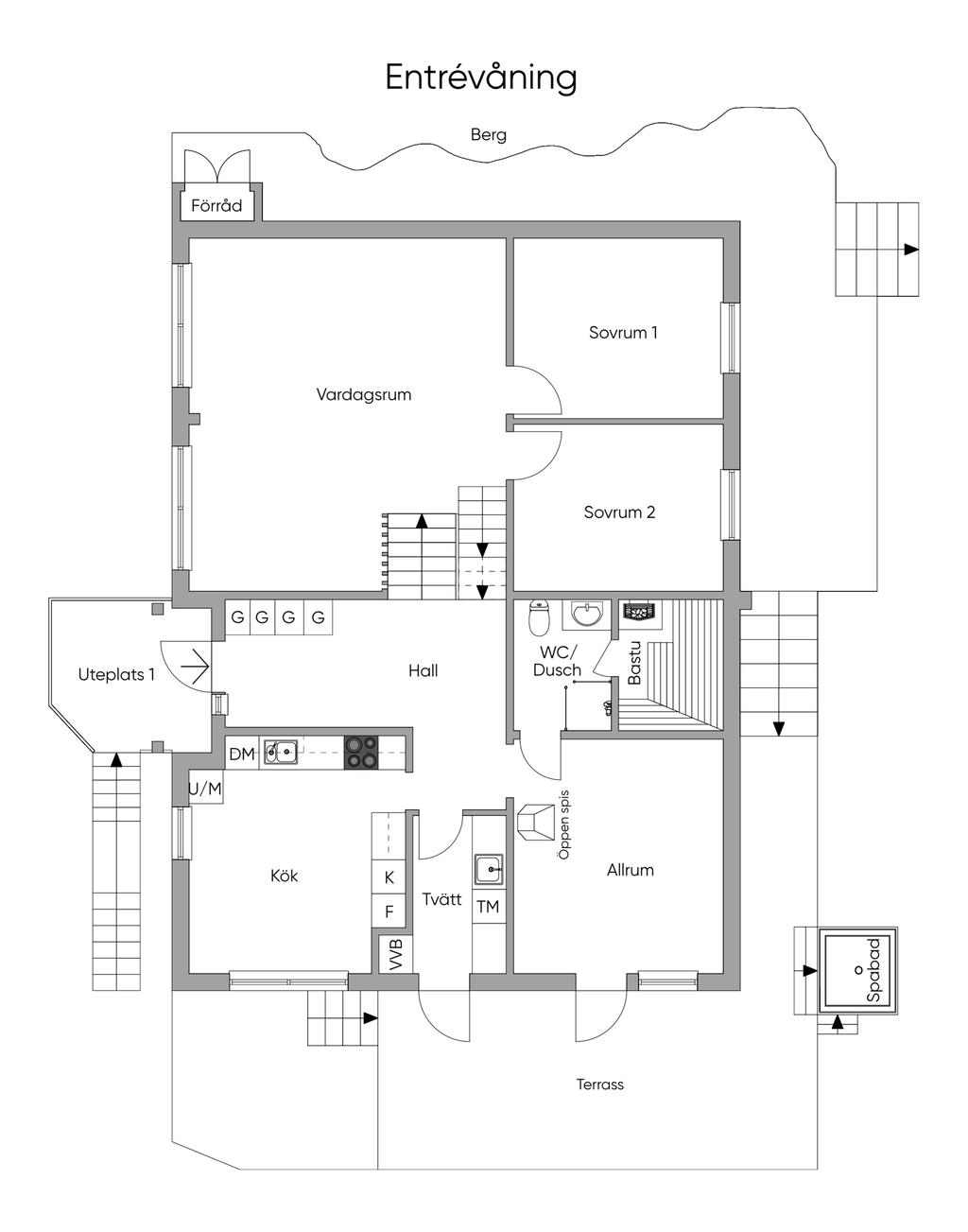 På entréplanet möts du av ett inbjudande allrum med öppen spis och direkt access till den stora altanen – perfekt för både vardag och fest. Här finns även ett smakfullt kök med gott om arbetsyta och plats för stort matbord. I anslutning ligger en separat tvättstuga med utgång till altan samt ett stilrent och helkaklat duschrum i modern stil, komplett med bastu – perfekt för avkoppling efter en lång dag.