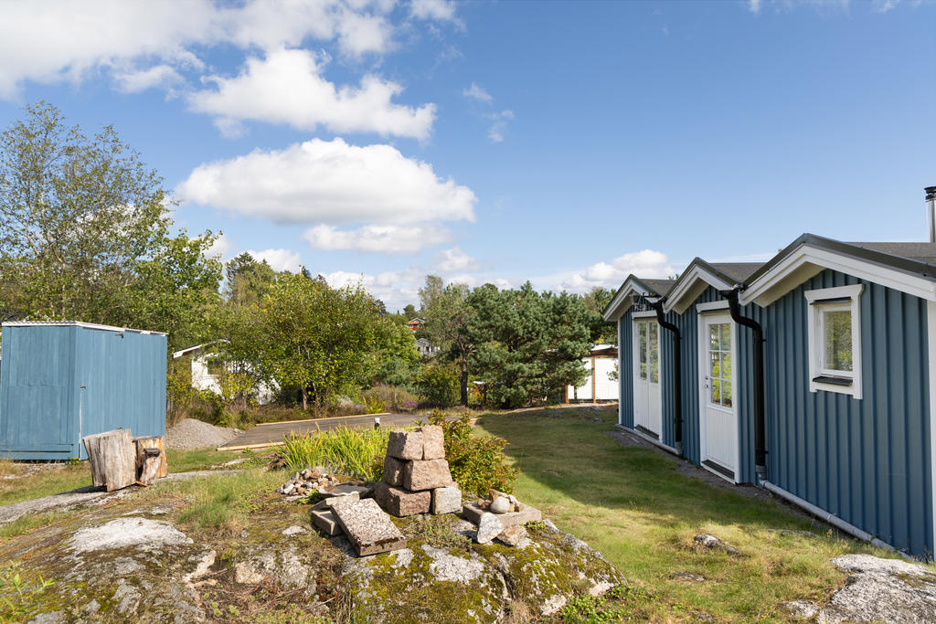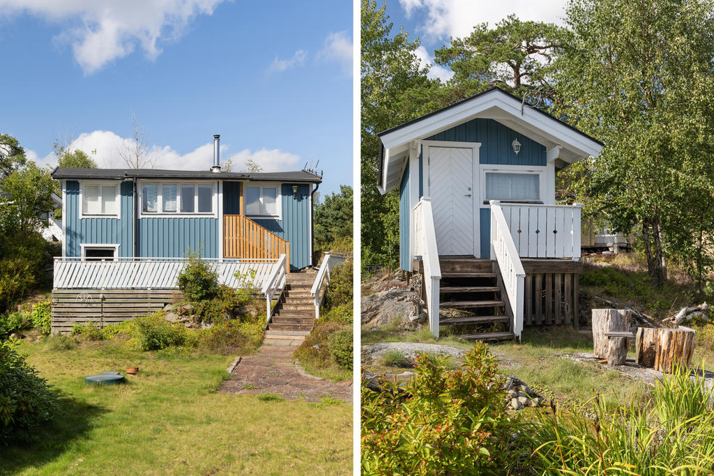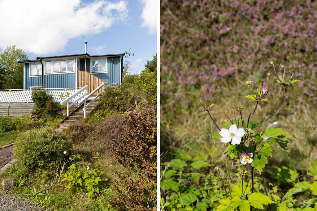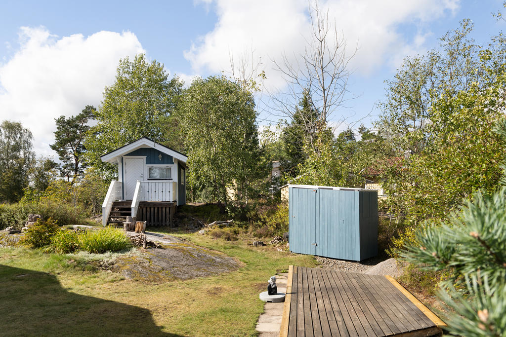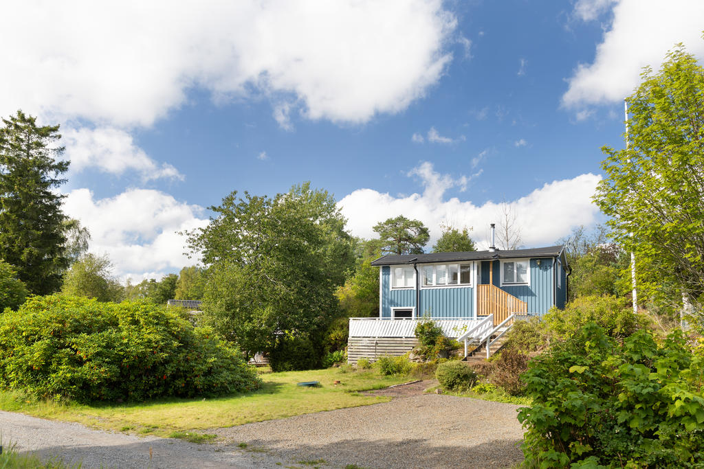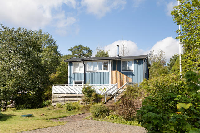 Infarten från vägen domineras av en stor, vacker rhododendron med huset i fonden. Via en grusad parkering med plats för 2-3 bilar och två korta trappor når man husets entrédörr, som öppnar sig mot en ljus, inbyggd och möblerbar blomsterveranda i söderläge. Härifrån kommer man till det stora vardagsrummet med vedeldad kamin och ljusinsläpp från tre väderstreck. Vidare finns ett funktionellt kök, ett sovrum med plats för två sängar och ett badrum med dusch. Dörrar från vardagsrummet och köket leder ut till trädgården på baksidan. Förutom många skåp och ett par garderober finns förvaringsmöjligheter också i källaren. På den stora, soliga altanen framför huset är det gott om plats för utemöbler. Ett mindre hus på bakre delen av tomten ger extra sovplatser till barn eller gäster. Där finns dessutom en kombinerad redskaps- och vedbod, samt ytterligare två uteplatser.