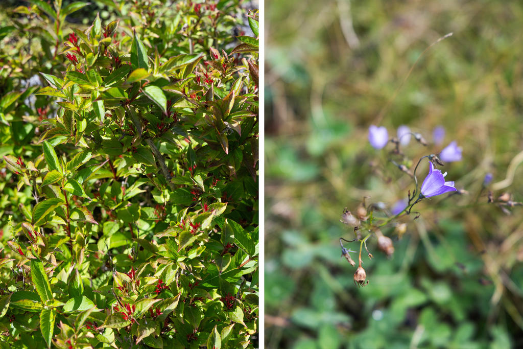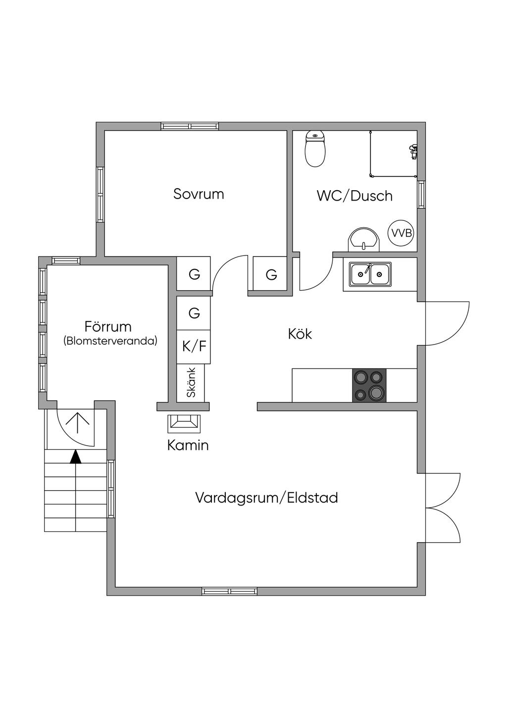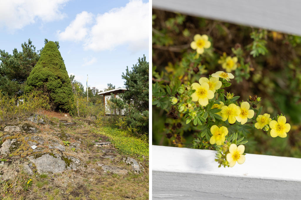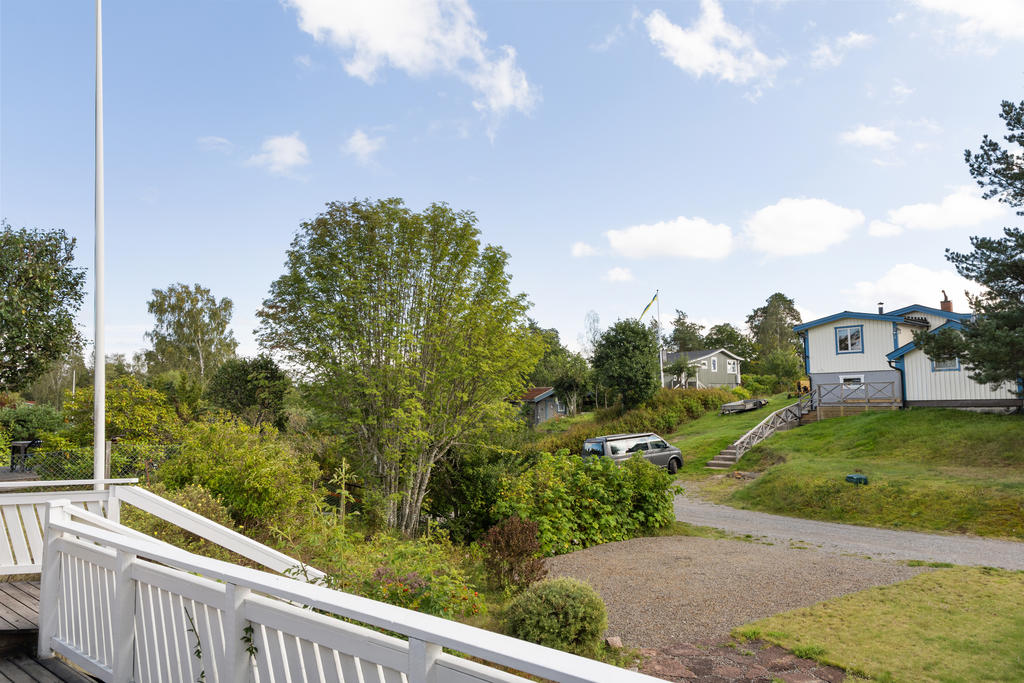 Infarten från vägen domineras av en stor, vacker rhododendron med huset i fonden. Via en grusad parkering med plats för 2-3 bilar och två korta trappor når man husets entrédörr, som öppnar sig mot en ljus, inbyggd och möblerbar blomsterveranda i söderläge. Härifrån kommer man till det stora vardagsrummet med vedeldad kamin och ljusinsläpp från tre väderstreck. Vidare finns ett funktionellt kök, ett sovrum med plats för två sängar och ett badrum med dusch. Dörrar från vardagsrummet och köket leder ut till trädgården på baksidan. Förutom många skåp och ett par garderober finns förvaringsmöjligheter också i källaren. På den stora, soliga altanen framför huset är det gott om plats för utemöbler. Ett mindre hus på bakre delen av tomten ger extra sovplatser till barn eller gäster. Där finns dessutom en kombinerad redskaps- och vedbod, samt ytterligare två uteplatser.